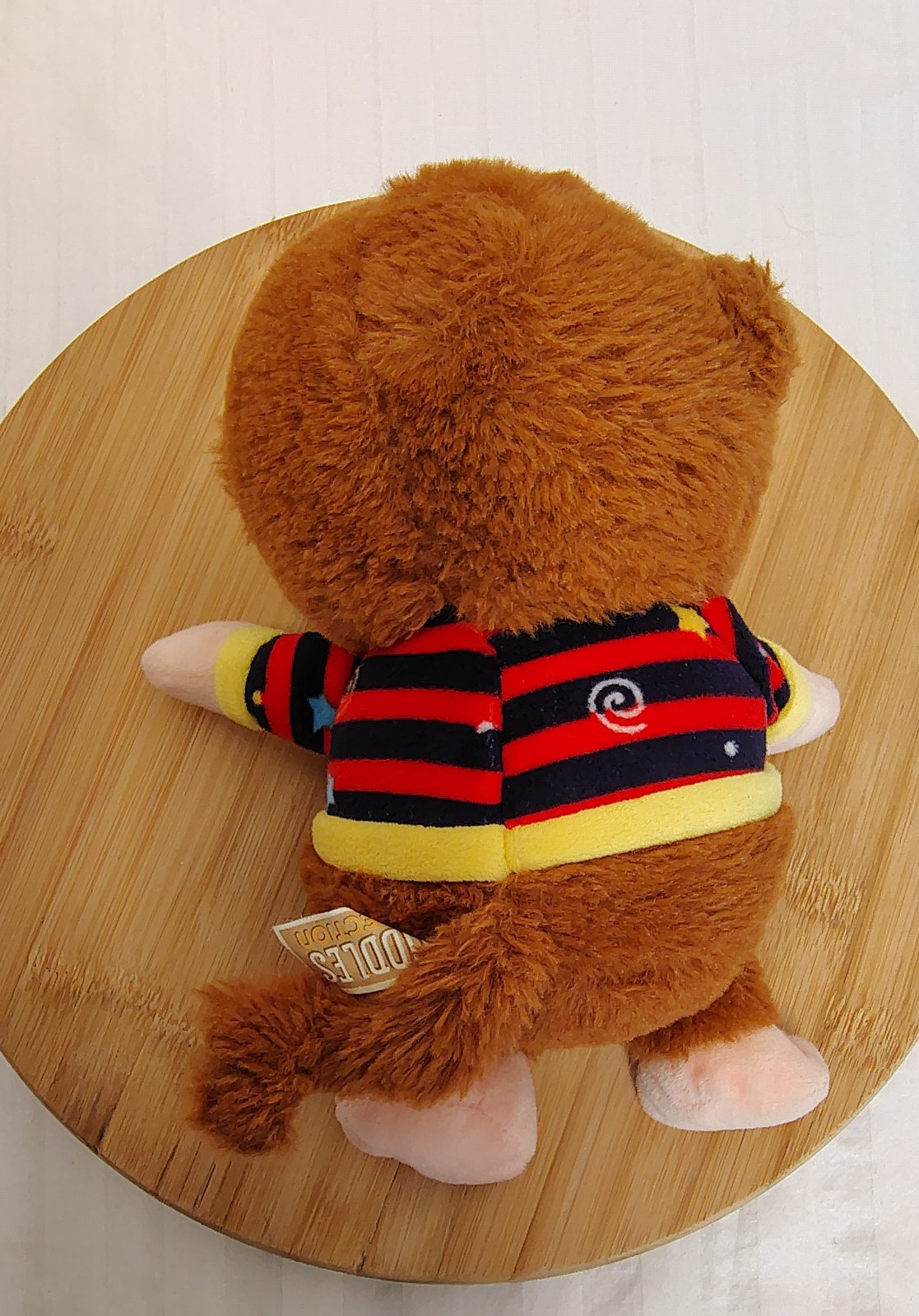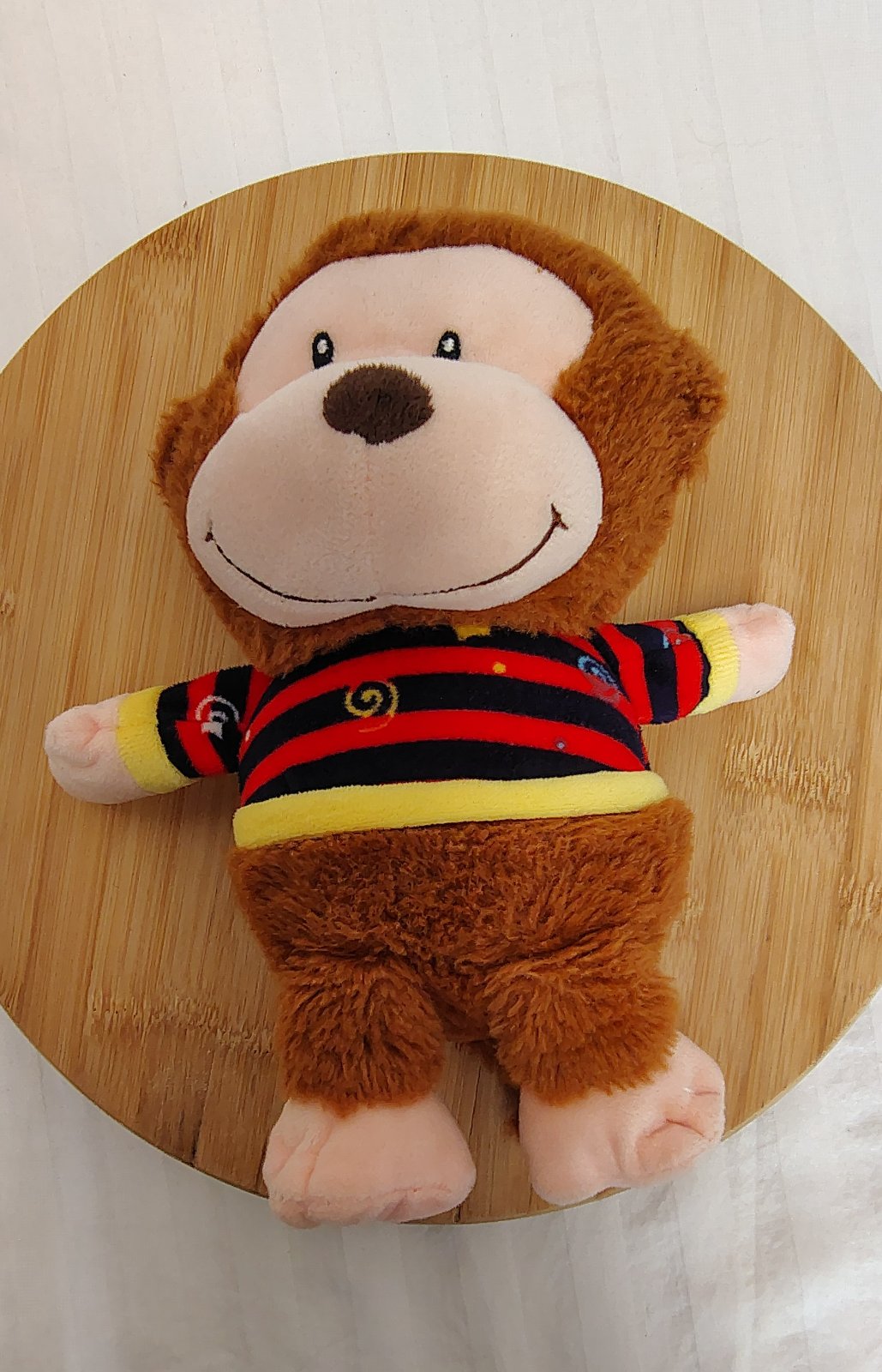 plyšová hnedo ružová Opica s pásikavým farebným tričkom napevno, vyrobená z kvalitného jemného a mäkkého plyšového materiálu,