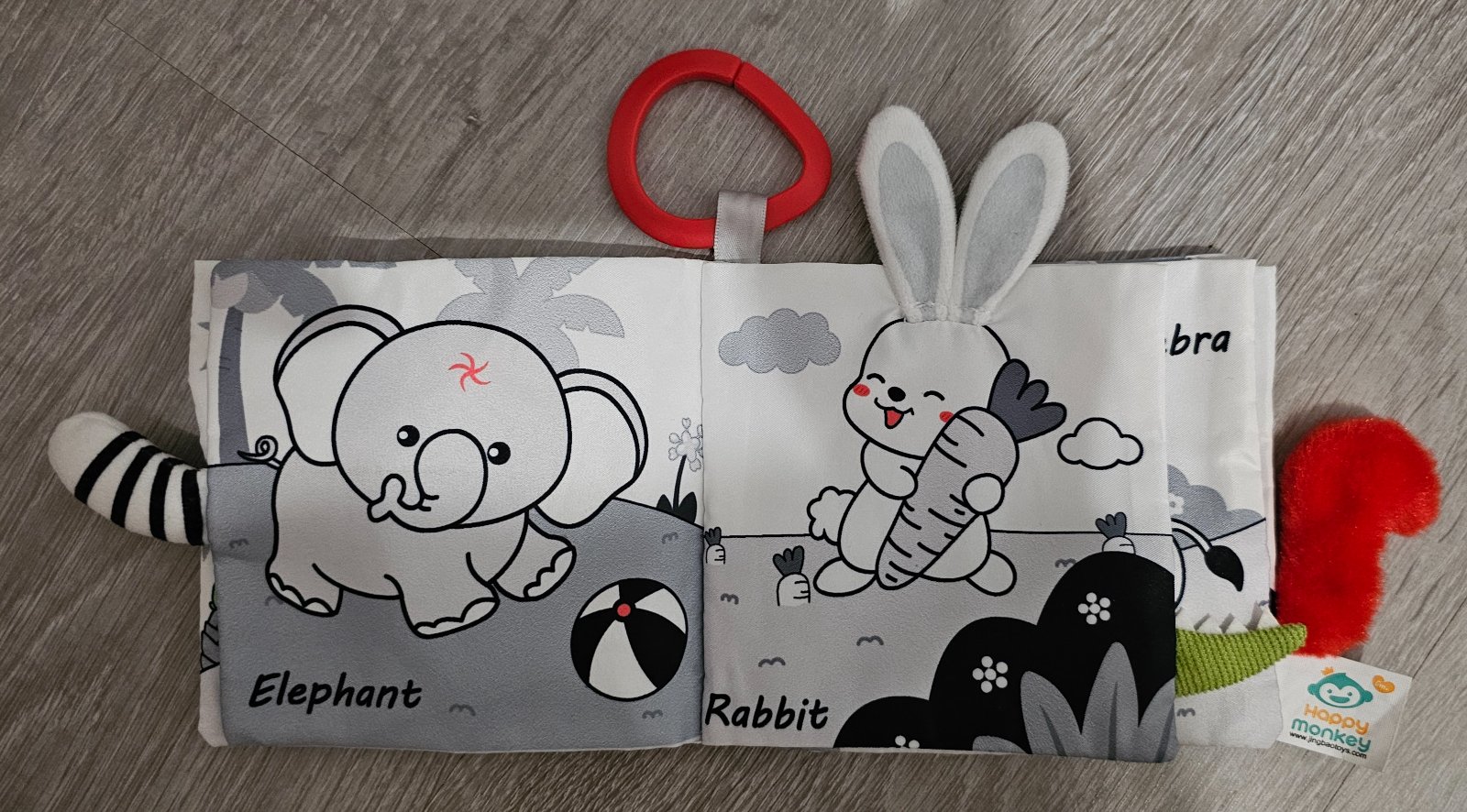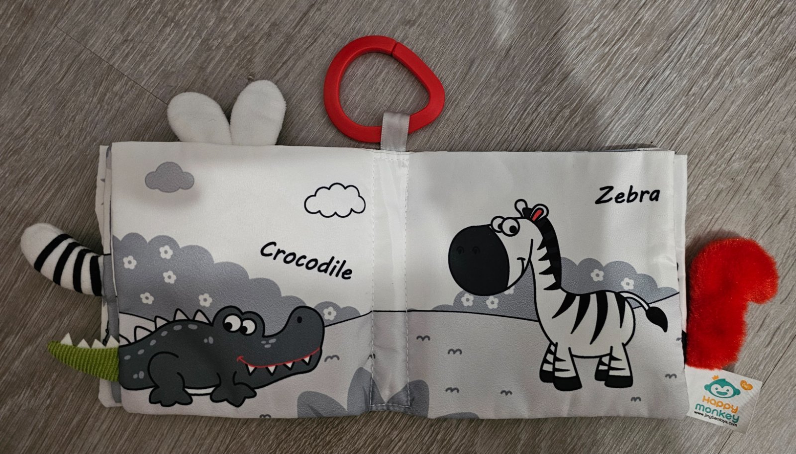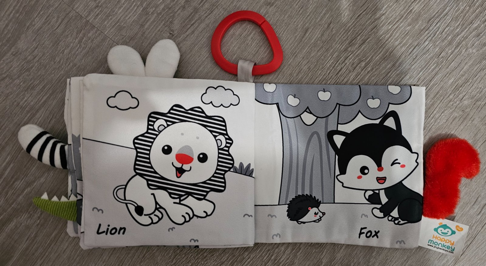 -vstavaná píšťalka, šuštiace strany,kontrastné štítky vyčnievajúce z knižky, kontrastné vzory, strana so všitou hrkálkou,