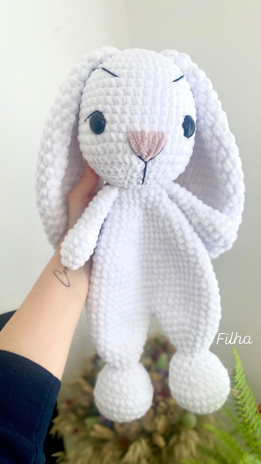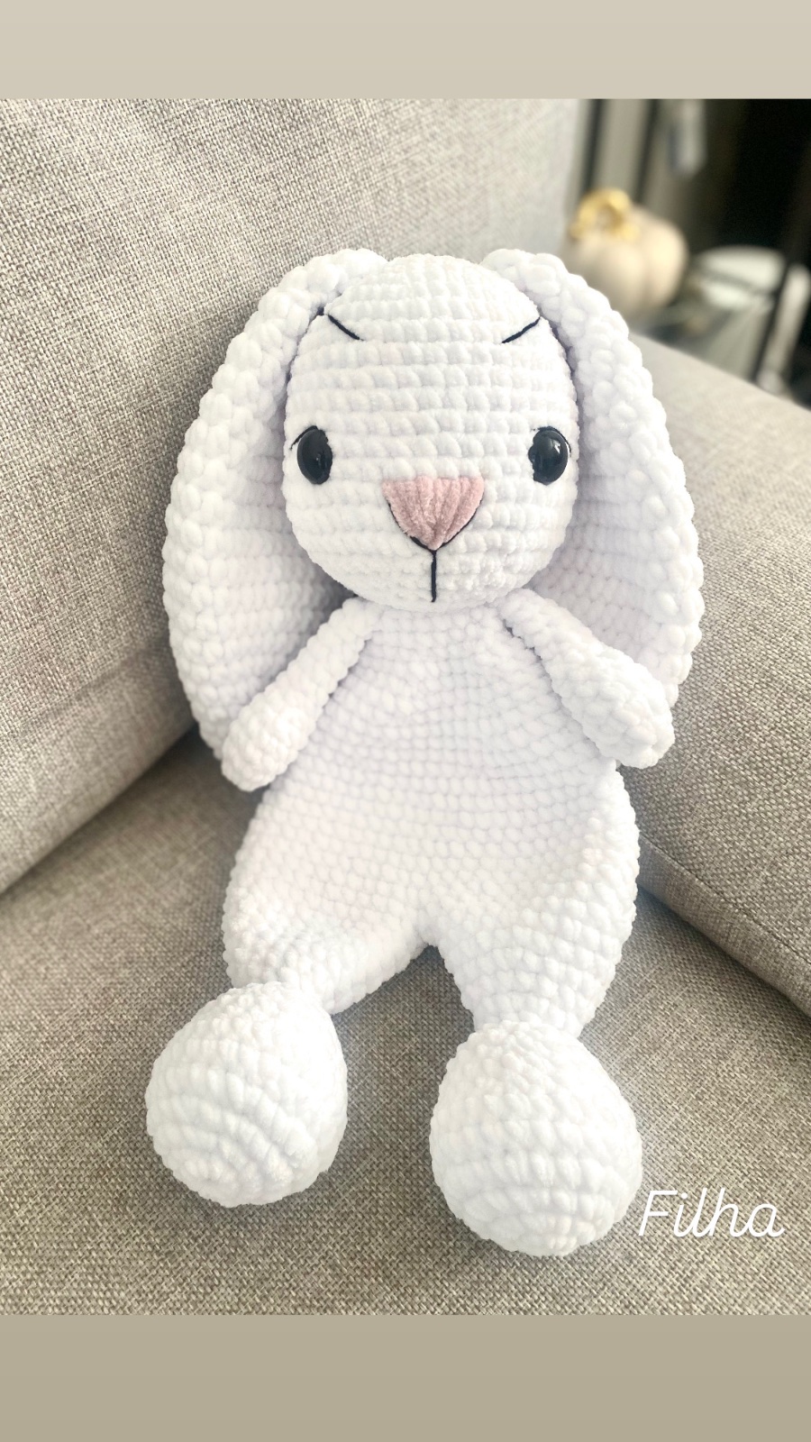 Háčkovaný zajačik mojkáčik v bielom 🤍 prevedení, vyrobený z hrubej, mäkkej priadze. Má bezpečnostné očká a narástol na 40 cm. Vyplnený je antialergickým dutým vláknom.
