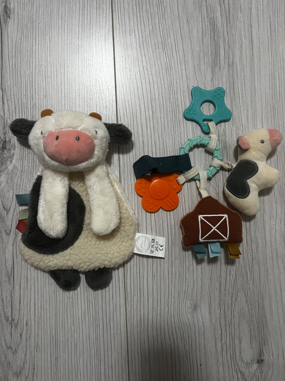 Sada hračiek pre najmenších, v neutrálnom farebnom prevedení, zložená z hebučkej kravičky a závesných hračiek bábätko zabaví doma aj na cestách. Roztomilé hračky do ruky aj na zavesenie motivujú deti na starostlivé preskúmanie, čím aj tí najmenší zdokonaľujú jemnú motoriku, koordináciu očí a rúk a stimulujú zmysly.