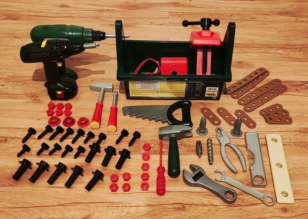 Kufrík s náradím obsahuje: 2x Vŕtačky, 2x Kladivo, 2x Šróbovak, 16x Malé matice, 3x Veľké matice, 7x Malé šróby, 8x Stredne veľké šróby, 9x Veľké šróby, 1x Okuliare, 1x Lis (aleo podobný nastroj) ,2x Klúč (jeden sa dá prispôsobiť) 1x Vodováha, 1x Kliešte, 2x Vrtáky...