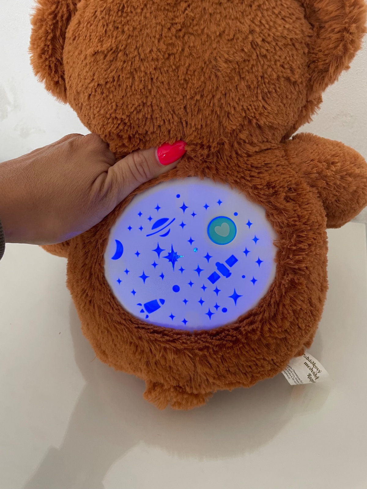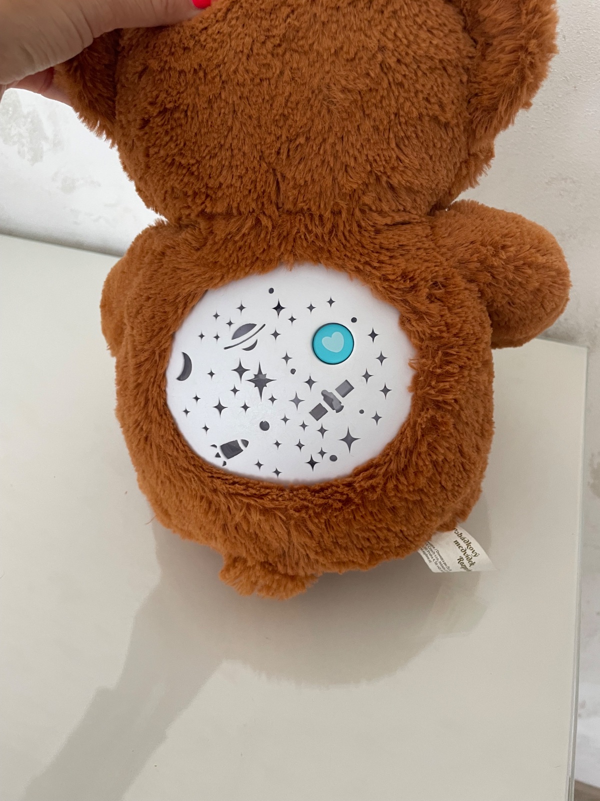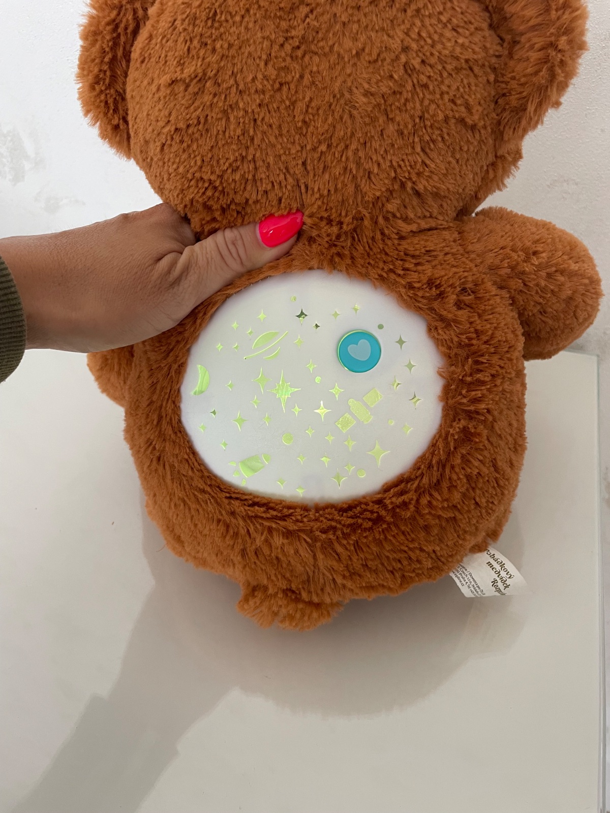 Macko na na chrbatiku projektor ktory meni farby a premieta obrazky na strnu - svetelna obloha. Macko rozprava nsjznsmejsie slovenske rozpravky na dobru noc. Vhodne ako darcek duper stav. Novy stal 35€.