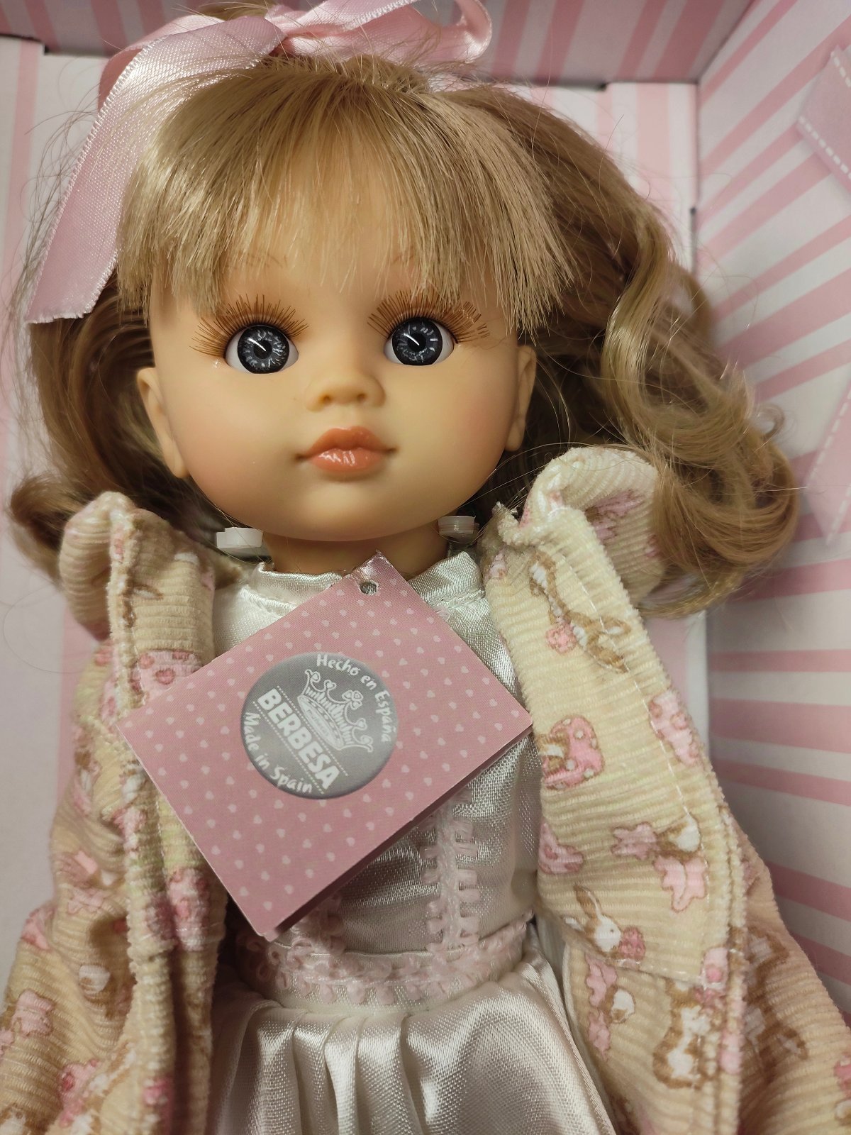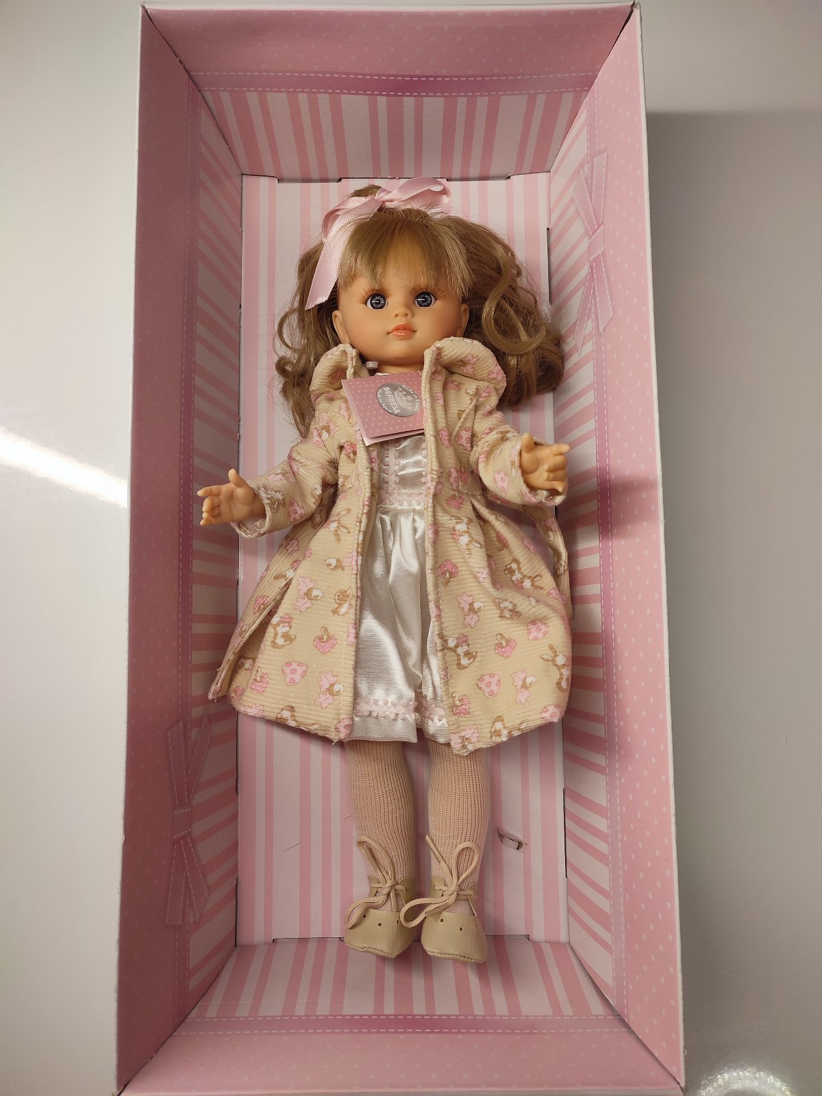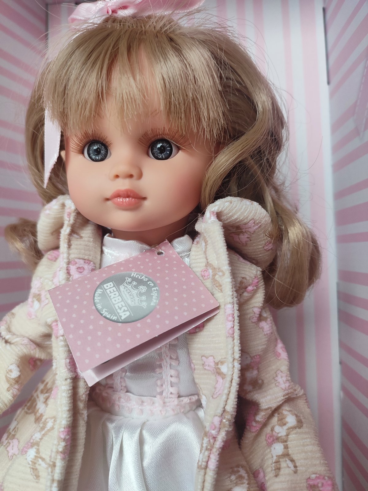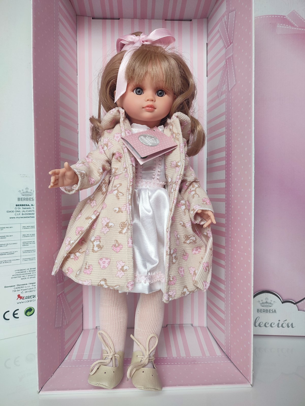 Bábika má modré oči, mihalnice a nádherné svetlé dlhé vlásky. Súčasťou bábiky je dlhý kabátik s opaskom, šatôčky, pančucháčky a topánočky. Oblečenie sa dá vyzliecť.