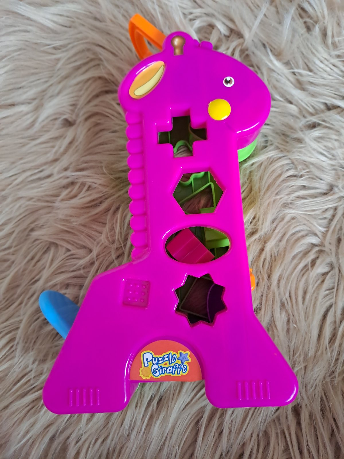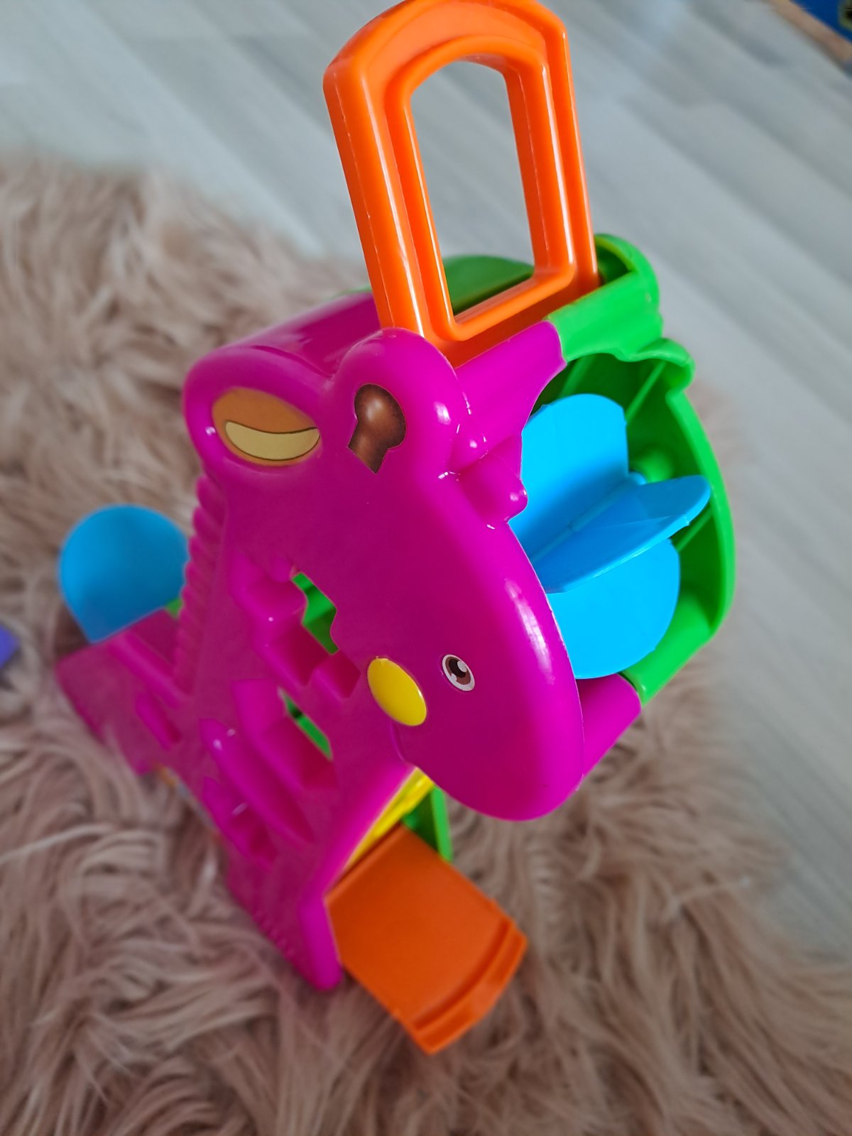Farebná žirafa na vkladanie tvarov. Tvarov je celkom 10ks. Nejaké sa nám už stratili. Tvary sa dajú uložiť do vnútra žirafy. Má praktický úchyt na prenášanie, pohyblivý chvost a na hlave otočný modrý valček. Hraná, v peknom stave.