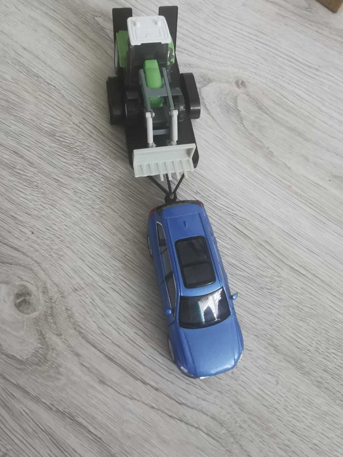 Auto s vozíkom a traktorom, bez poškodenia. Auto je kovové, otvárajú sa aj predné dvere a traktor a vozík sú plastové. Dĺžka cca 28cm.V