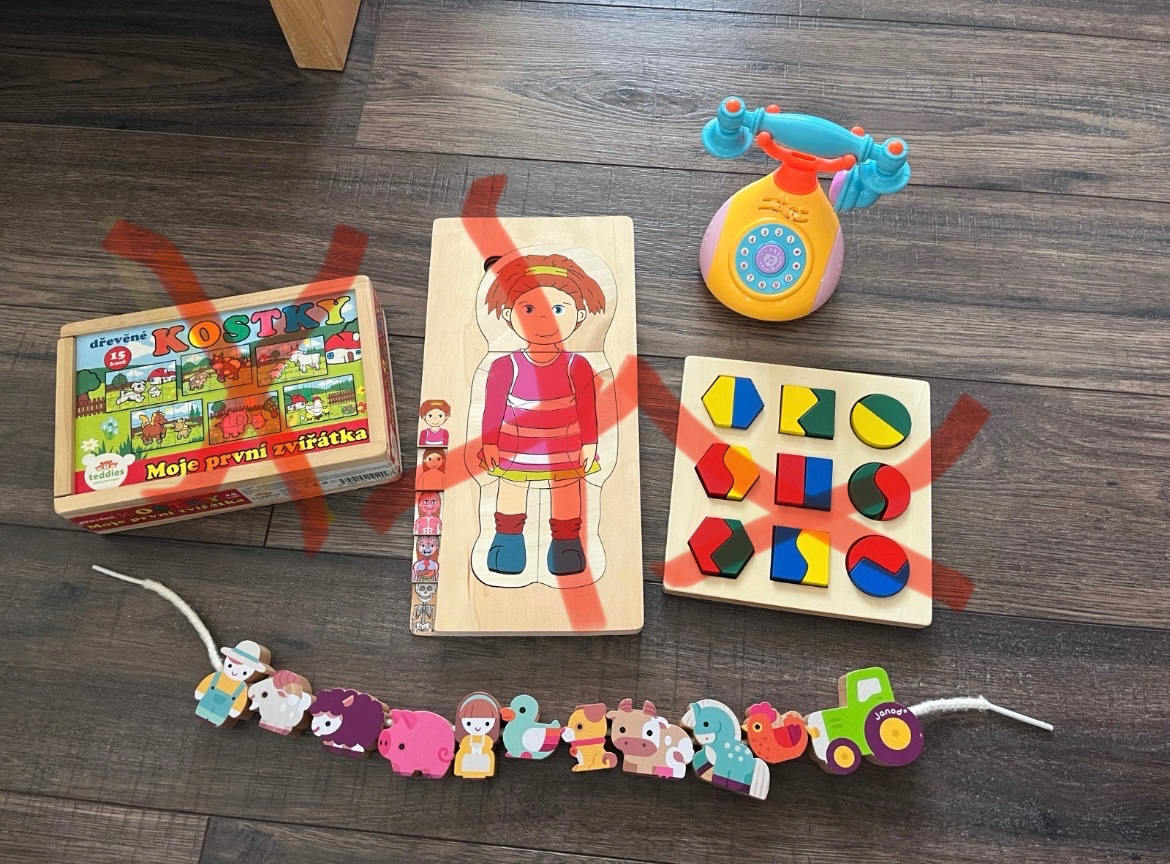 Drevené hračky v super stave, telefo hrá melódie, cena 1,90 eur. Drevená navliekačka značky Janod (ku korálkam sú dve rovnaké šnúrky) 5 eur, zašlem po úhrade.