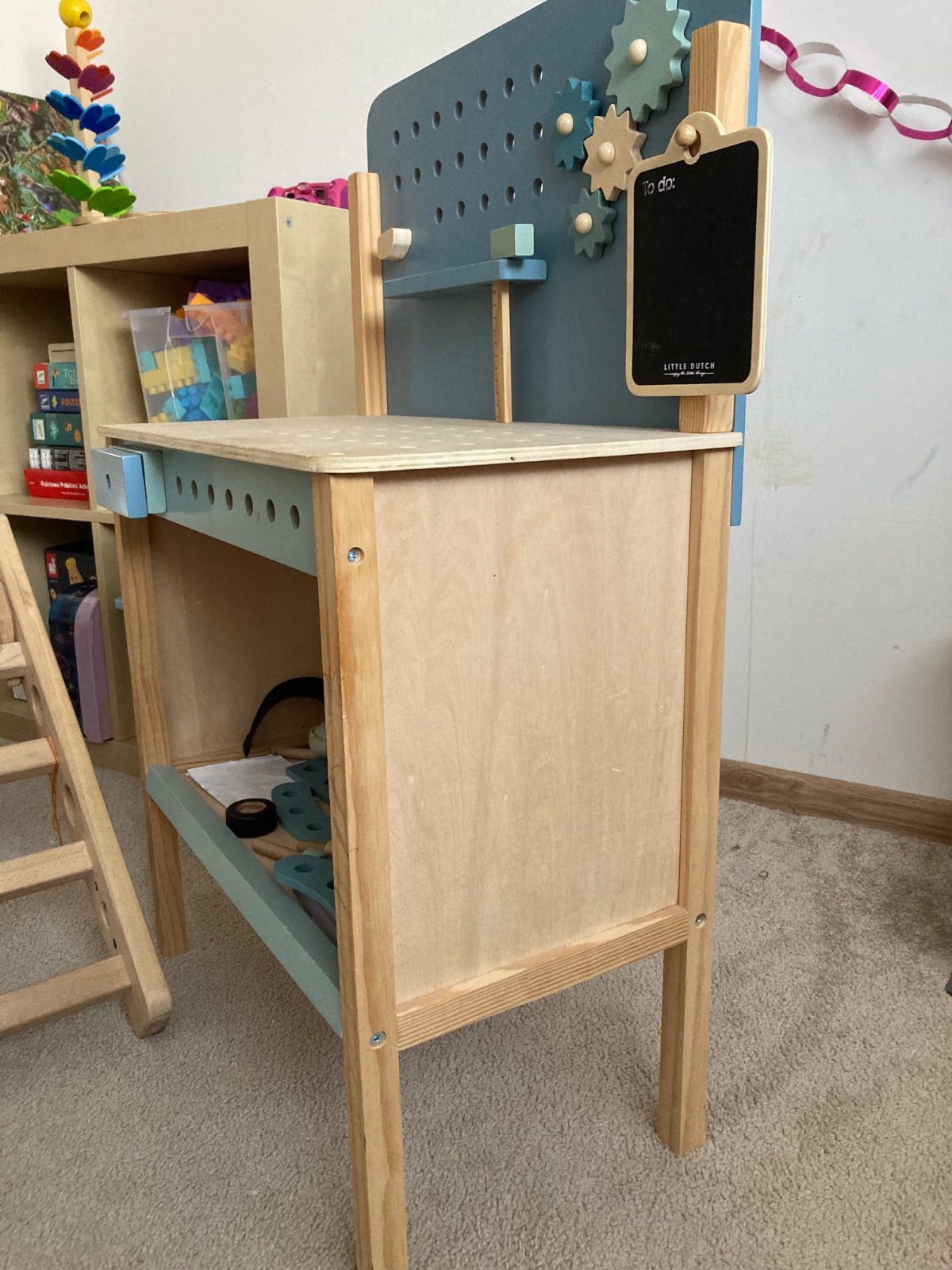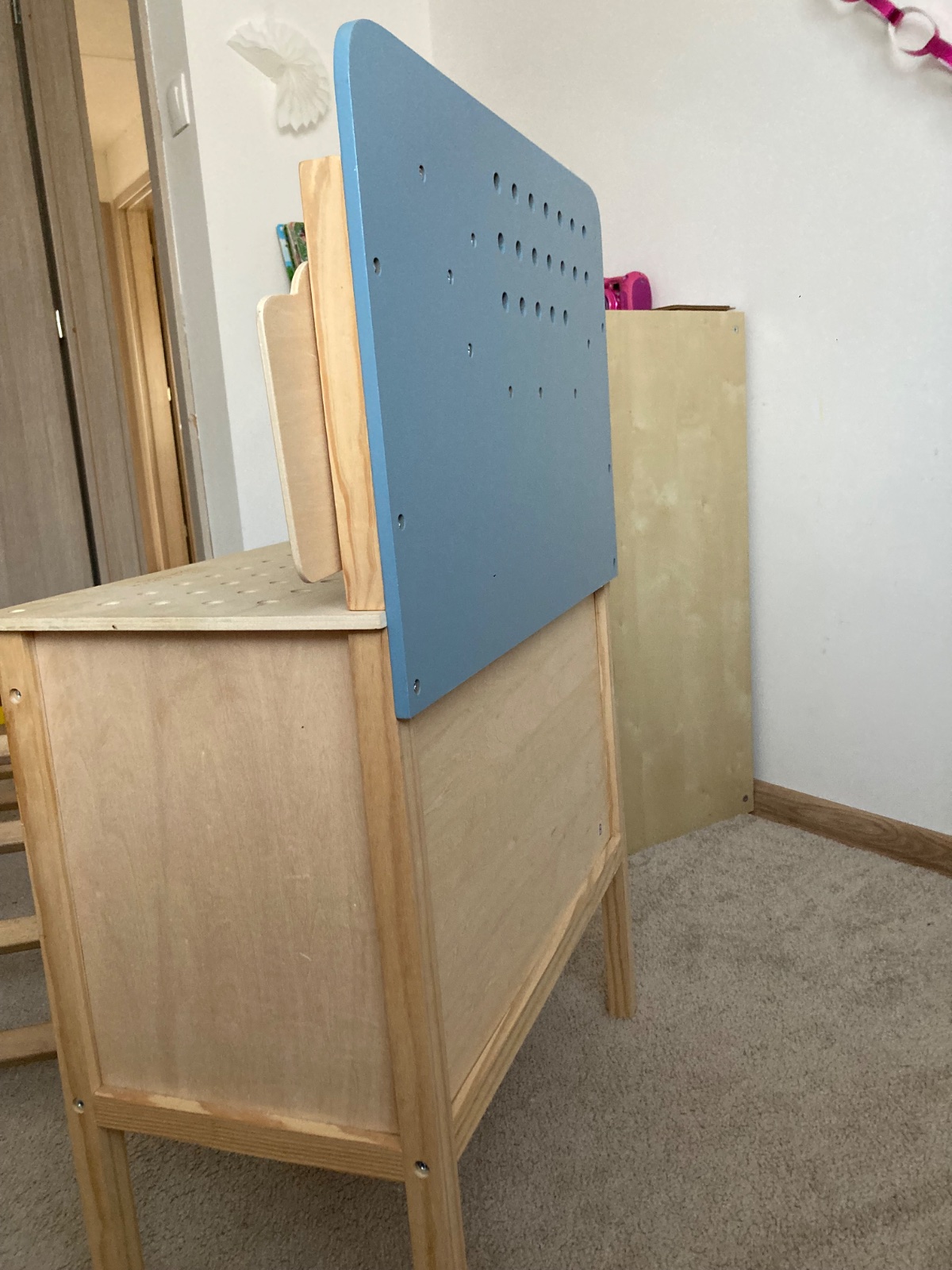 Predám hraný drevený pultík pre malých majstrov. Materiál drevo a pevný plast. Možné rozložiť a zmontovať pomocou priložených hracích skrutiek. Rozmer cca 40x40x20cm.