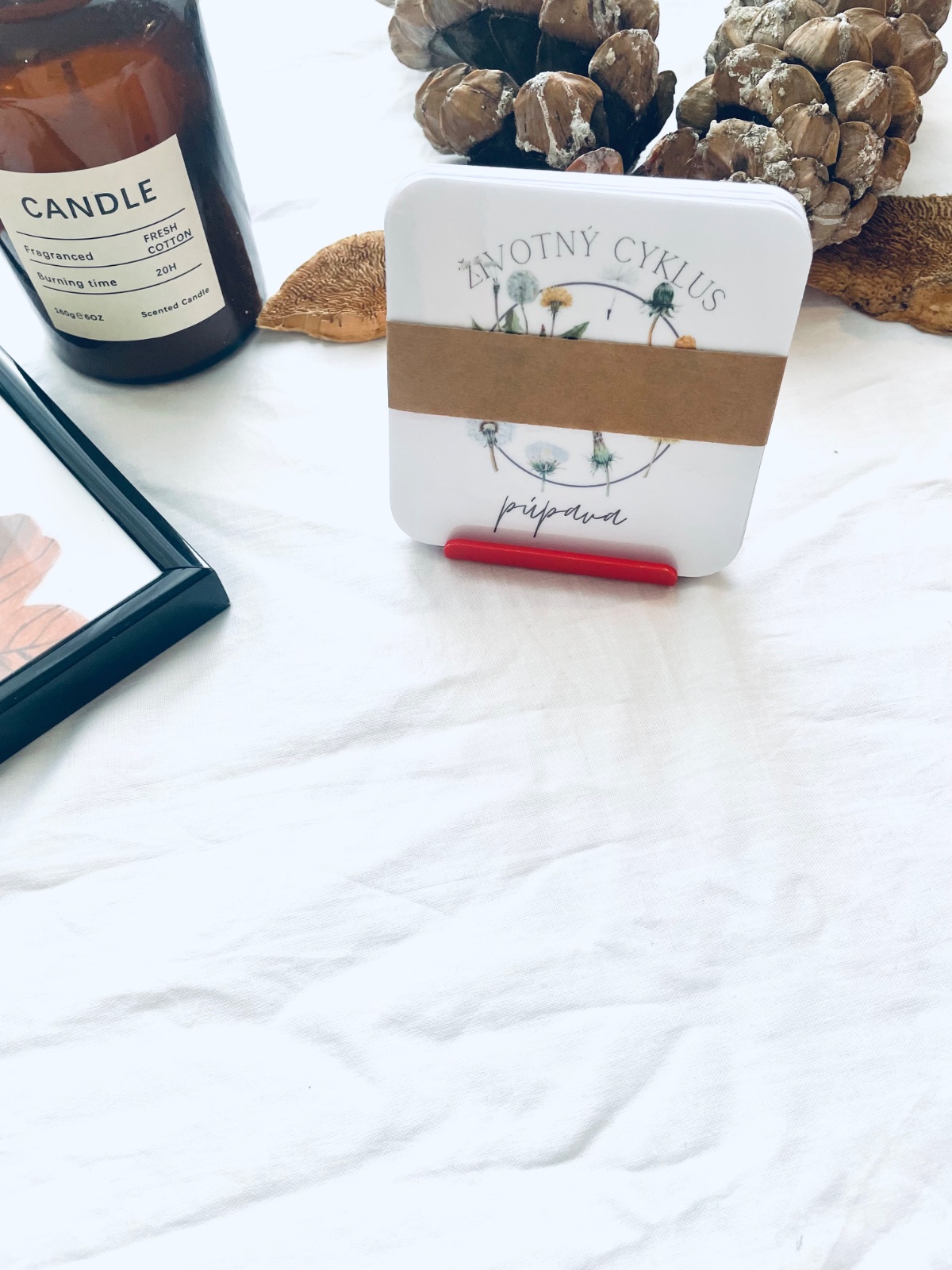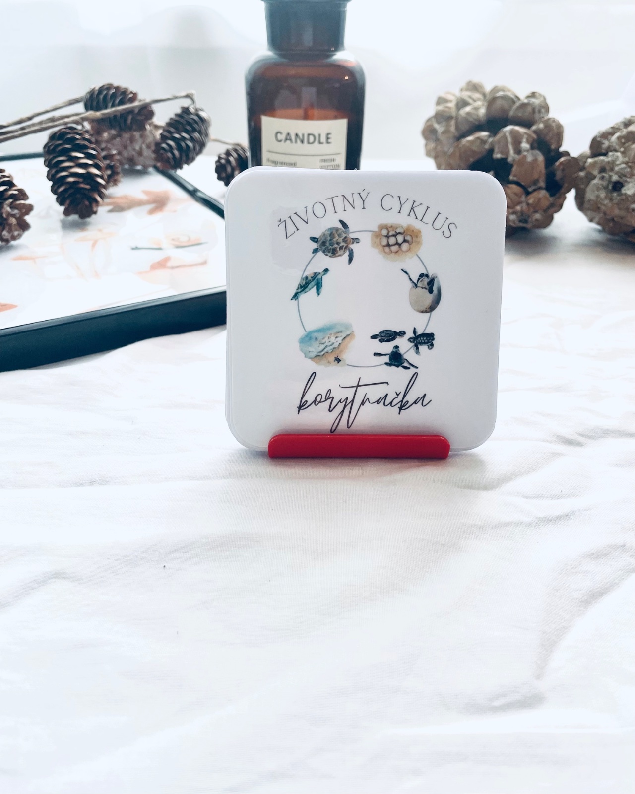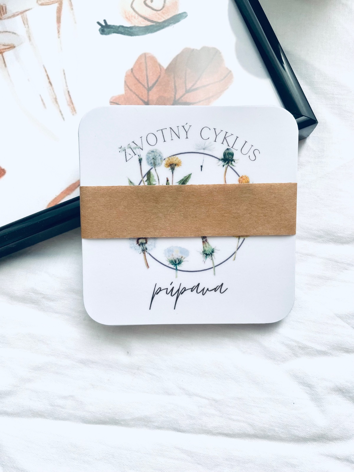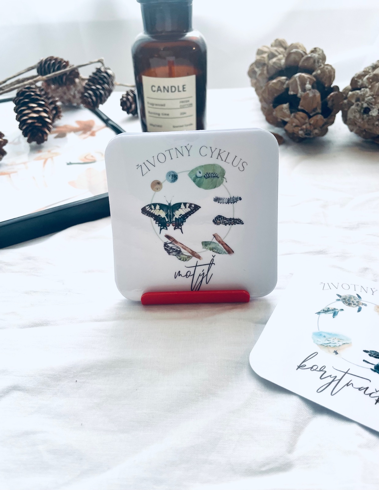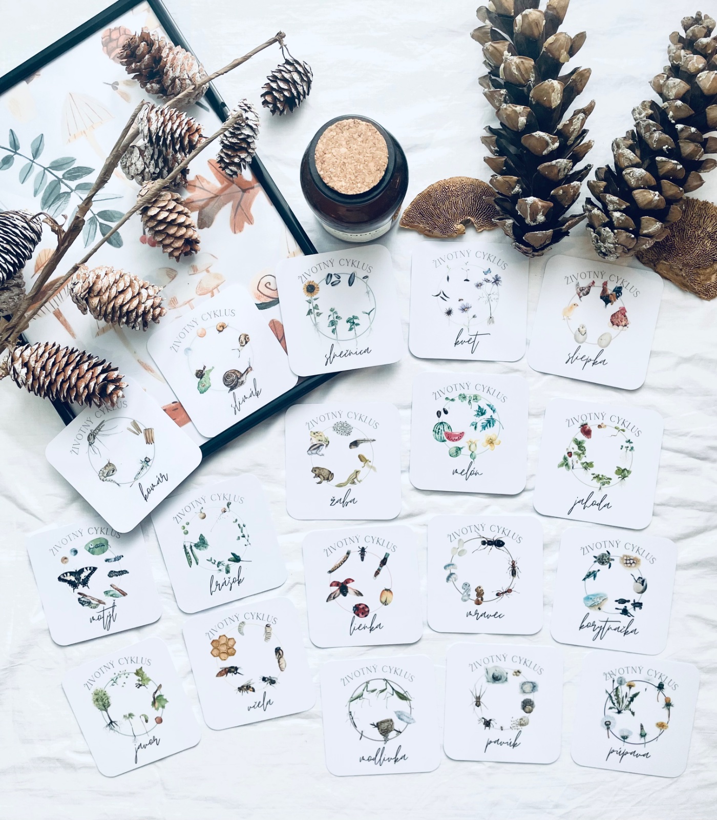 Sada Životný cyklus obsahuje 18 zalaminovaných kartičiek s 18 životnými cyklami: púpava, jahoda, hrášok, mravec, pavúk, slnečnica, melón, lienka, motýľ, žaba, slimák, komár, včela, javor, kvet, modlivka, sliepka a korytnačka.