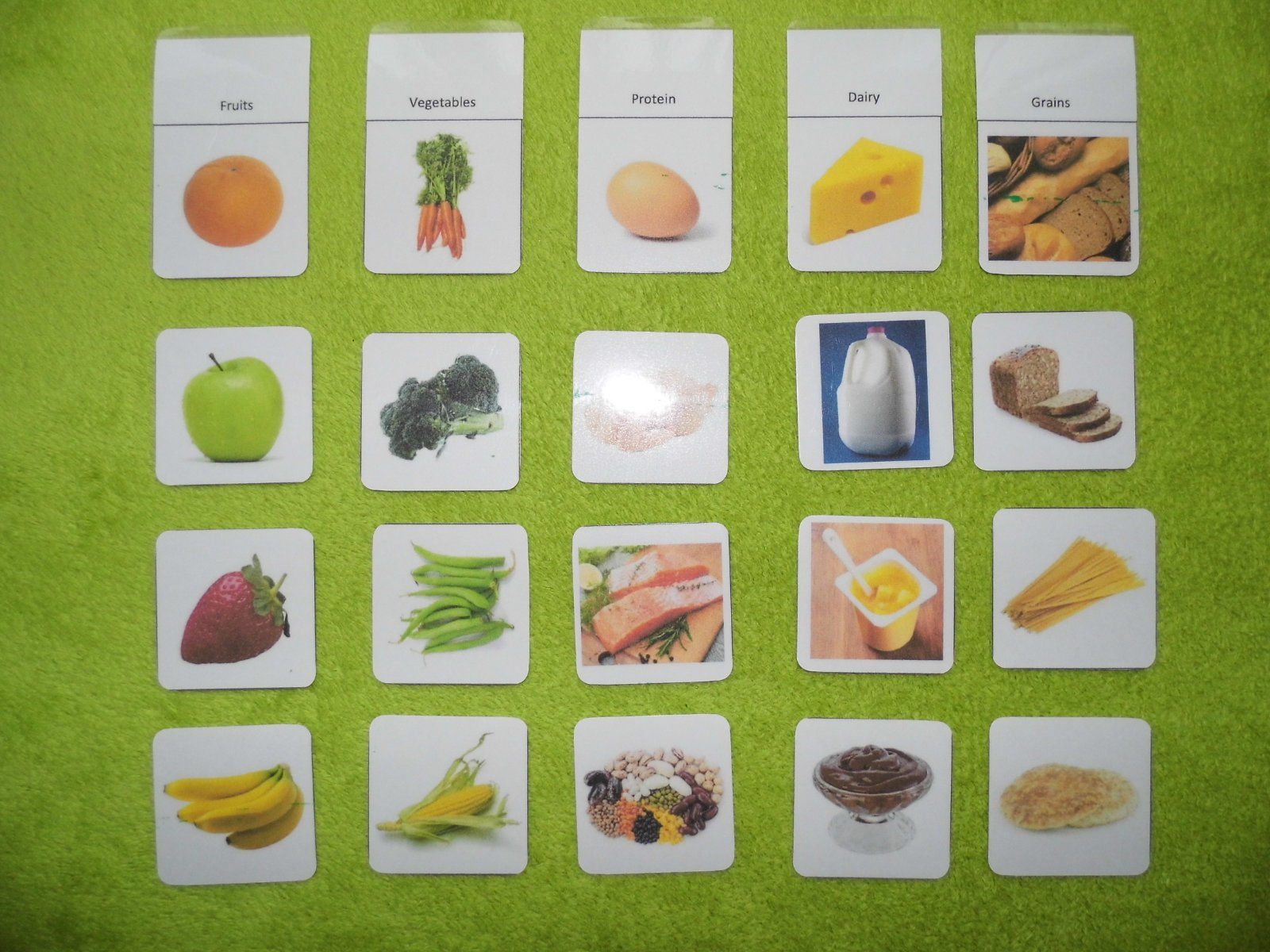 Vyberieme 5 kartičiek - ovocie, zelenina, bielkoviny, mliečne výrobky, obilniny.