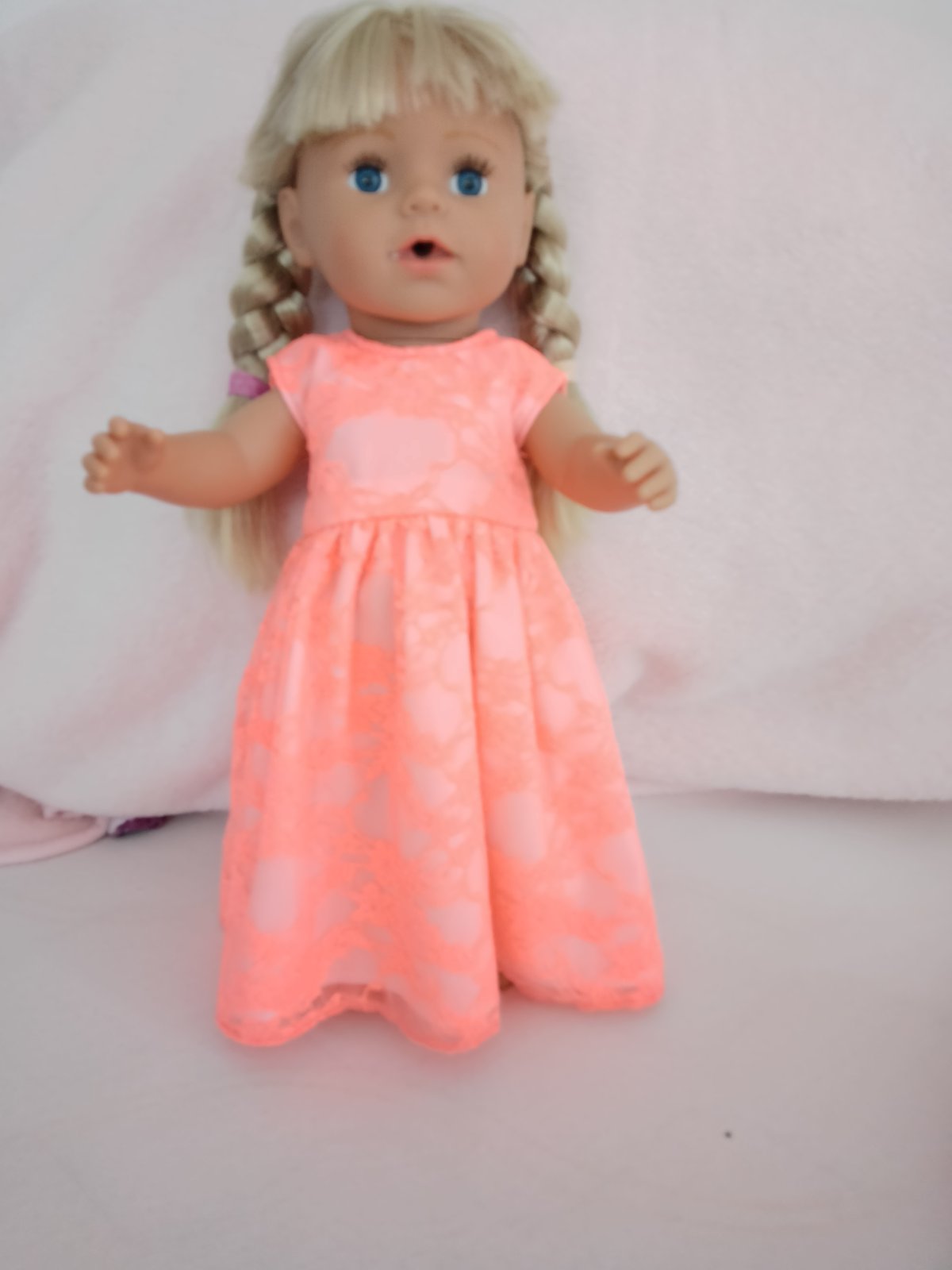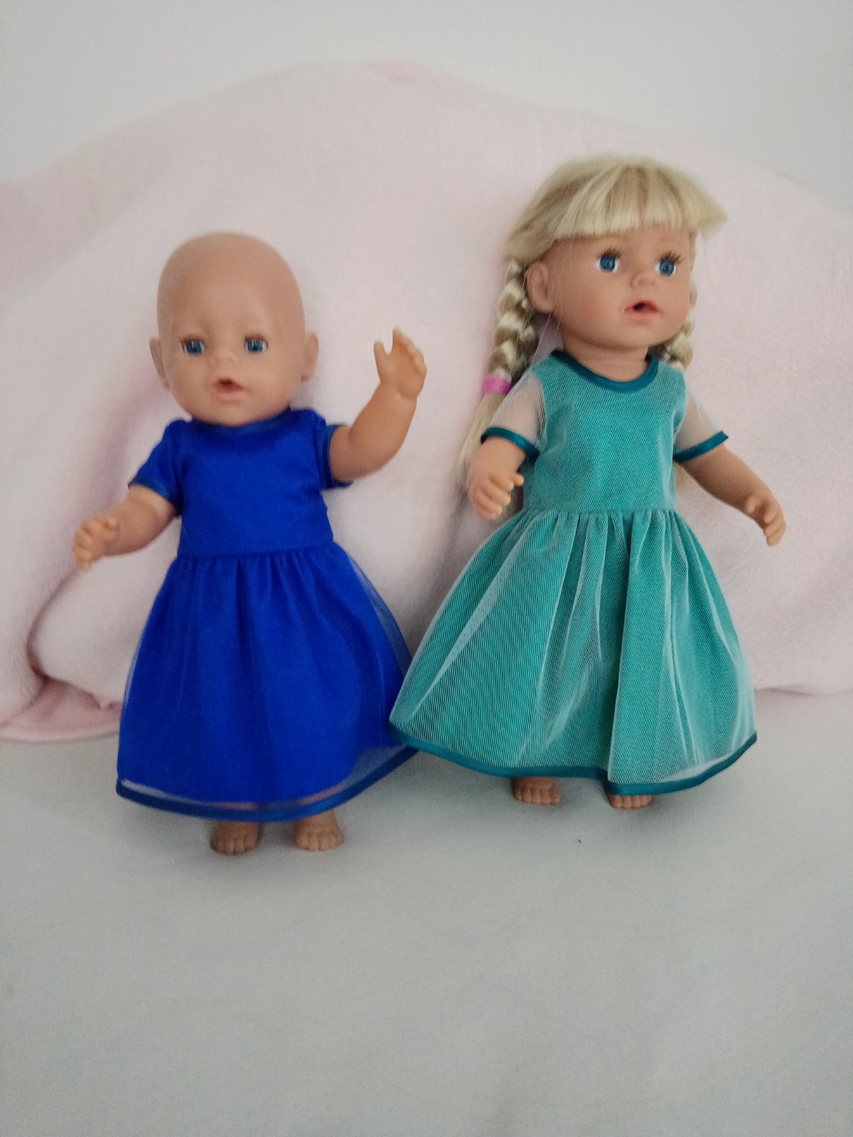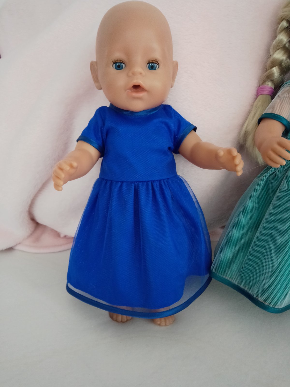 oblečenie je šité, nehrané. Vhodné pre bábiku baby born 43 cm a staršiu sestričku 43cm. Saty sú zo zadu na patentky.