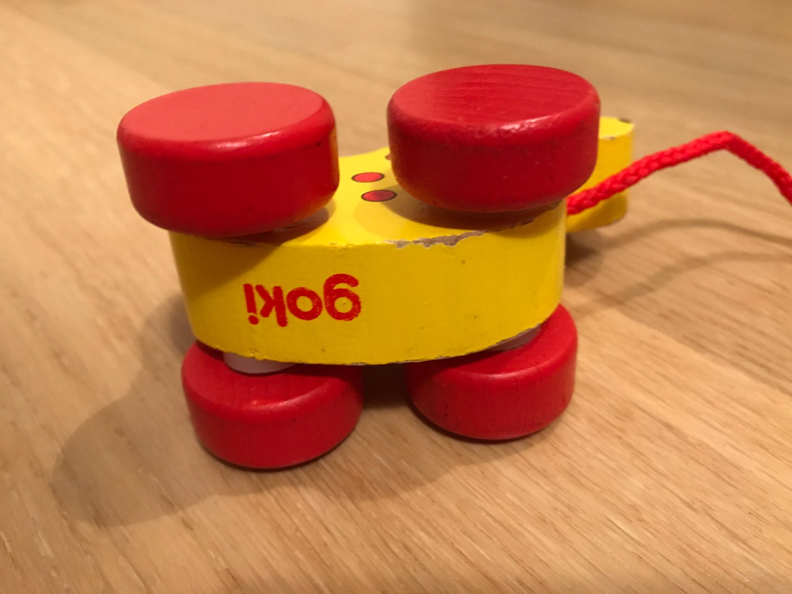 Drevený psík na ťahanie používaný len v byte. Kolieska zodrané nie sú, no zopár škrabancov utŕžil.