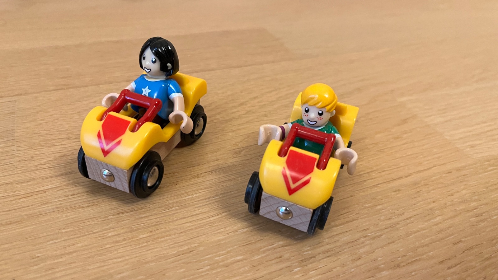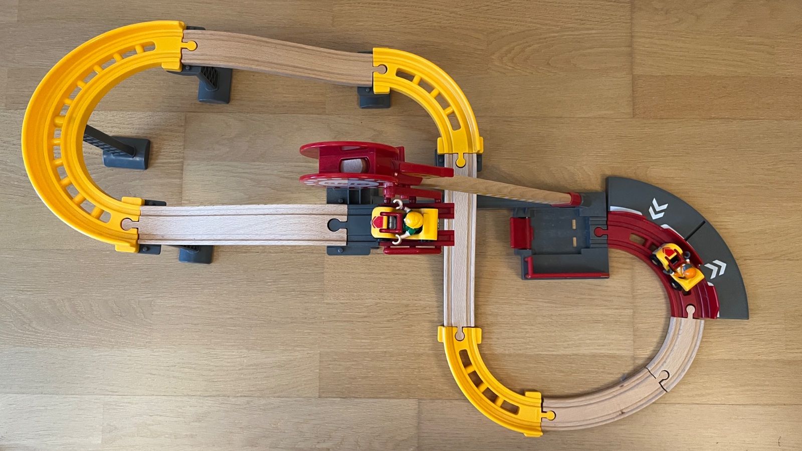 Nepoškodená drevená húsenková dráha s dvomi autíčkami a postavičkami. “Deti” si odmerajú výšku,následne nasadnú do vozíka,odvezú sa hore a odtiaľ sa spustia po dráhe. Dráha je napojiteľná na “bežnú” vláčikovú dráhu.