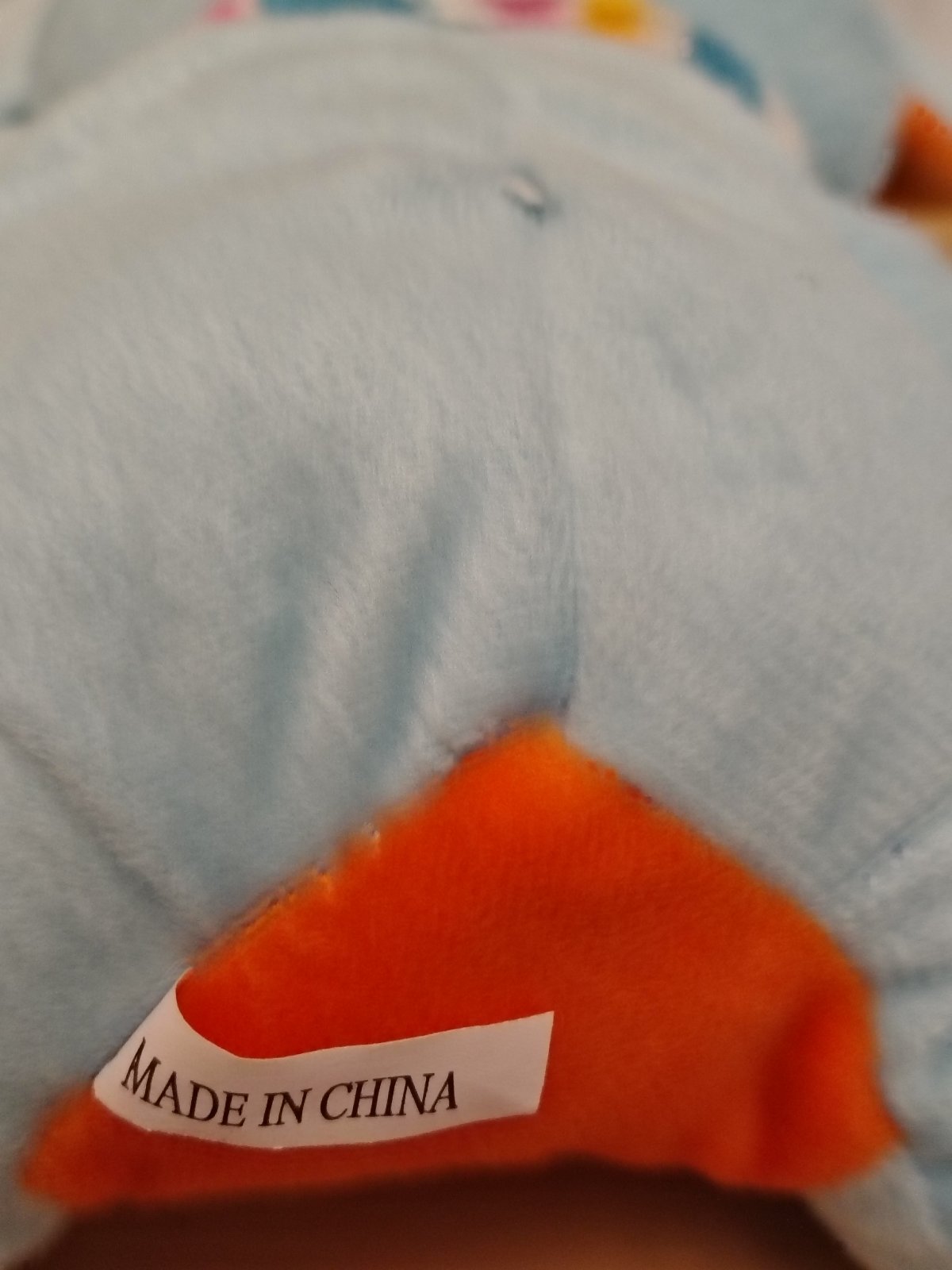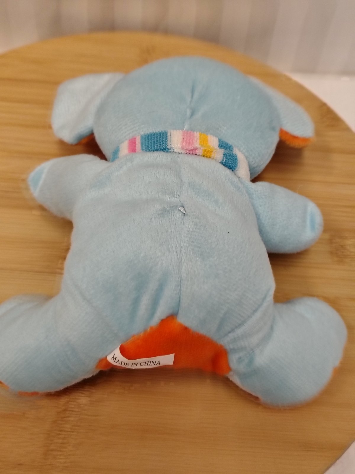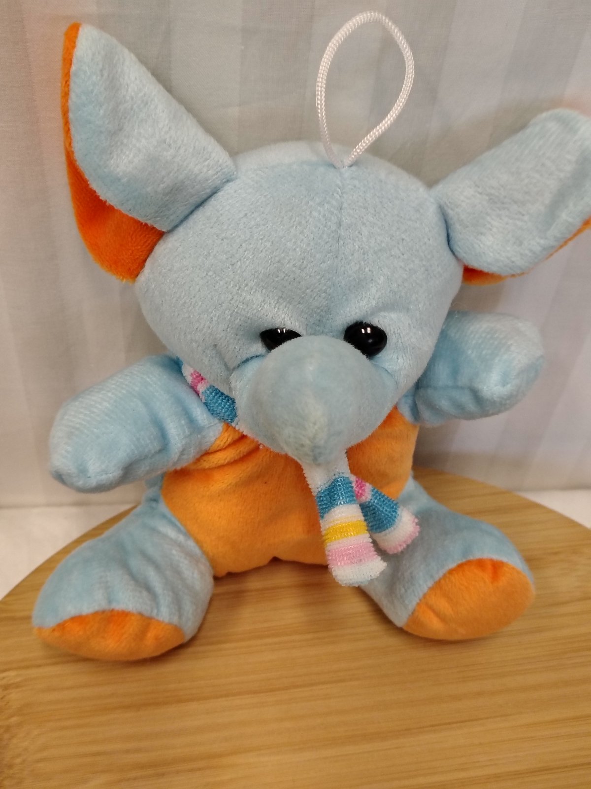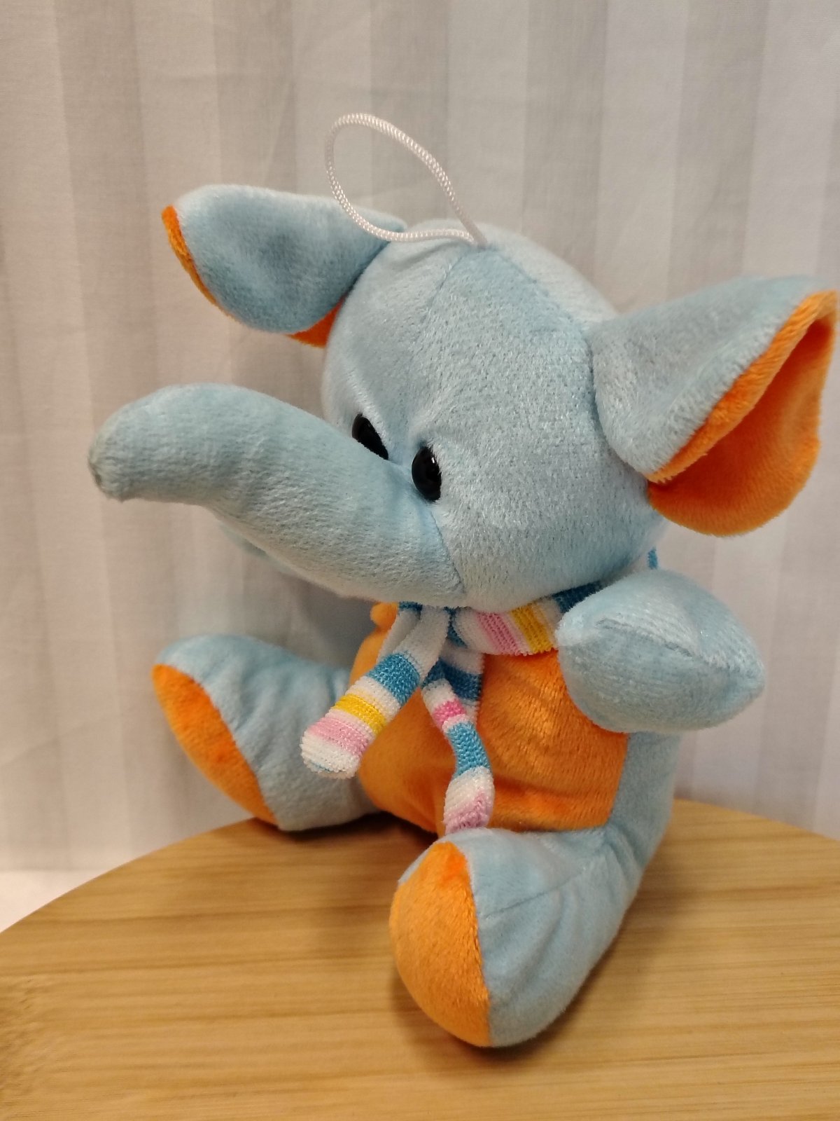 Plyšový modrý Slon so šálom, 19 cm, sediaci, s putkom na zavesenie, farba svetlo modrá a oranžová, vyrobený z kvalitného jemného a mäkkého plyšového materiálu,