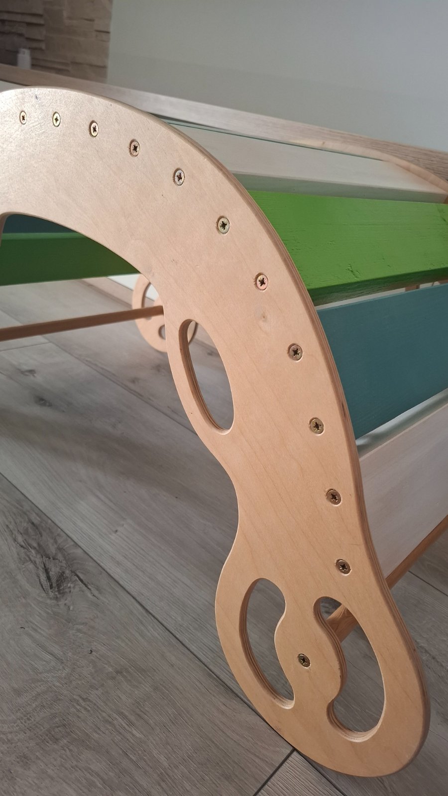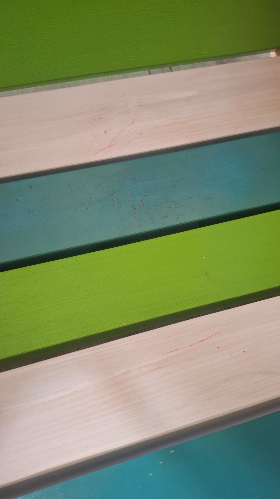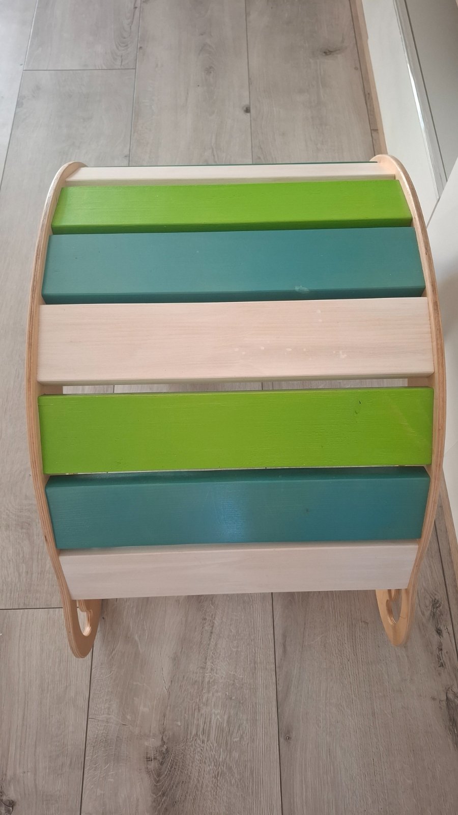 Používaná v super stave, semtam klasické škrabance z pouzivania, hojdacka mala povodne aj ruzove dosky, premalovali sme na zeleno bielo s eko farbou vhodnou na povrchy určené pre deti. Zo spodu hojdacky sme sa stym nejak nehrali, vykukaju tam trochu ružové škrabance, stačí to zamalovat farbou. Inak jej nic ine nie je. Stav hojdačky na foto.