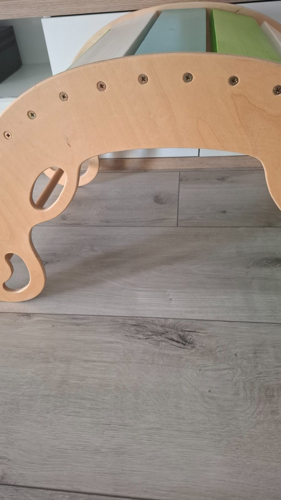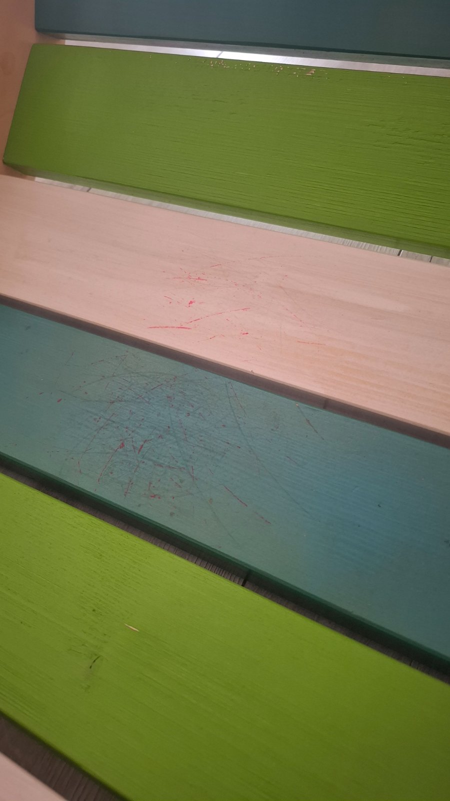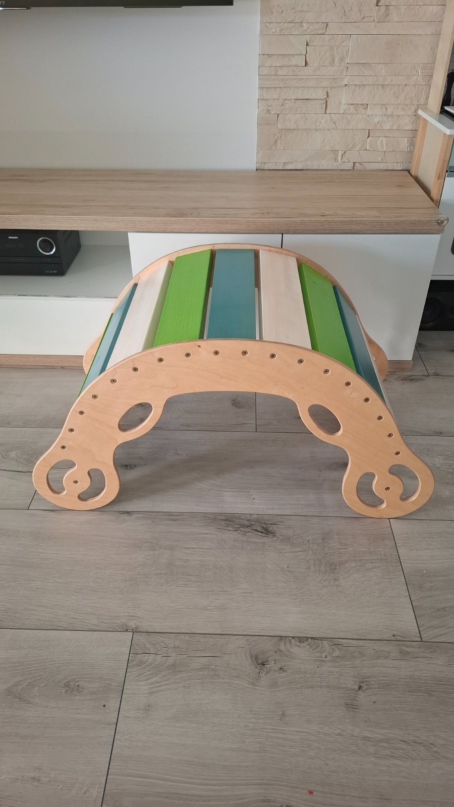 Používaná v super stave, semtam klasické škrabance z pouzivania, hojdacka mala povodne aj ruzove dosky, premalovali sme na zeleno bielo s eko farbou vhodnou na povrchy určené pre deti. Zo spodu hojdacky sme sa stym nejak nehrali, vykukaju tam trochu ružové škrabance, stačí to zamalovat farbou. Inak jej nic ine nie je. Stav hojdačky na foto.