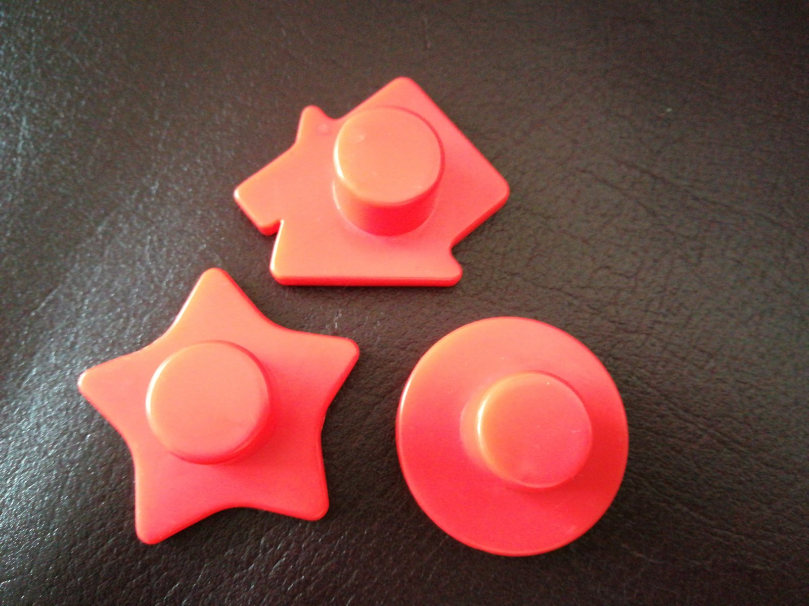 Červené pečiatky na magnetickú tabuľku na kreslenie: kruh, hviezda a domček. Priemer kruhu 3,8cm. Pekný hraný stav.