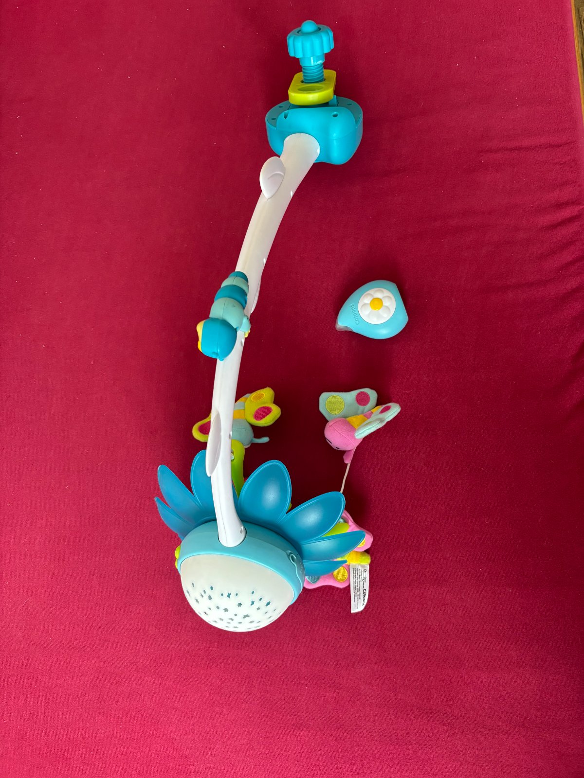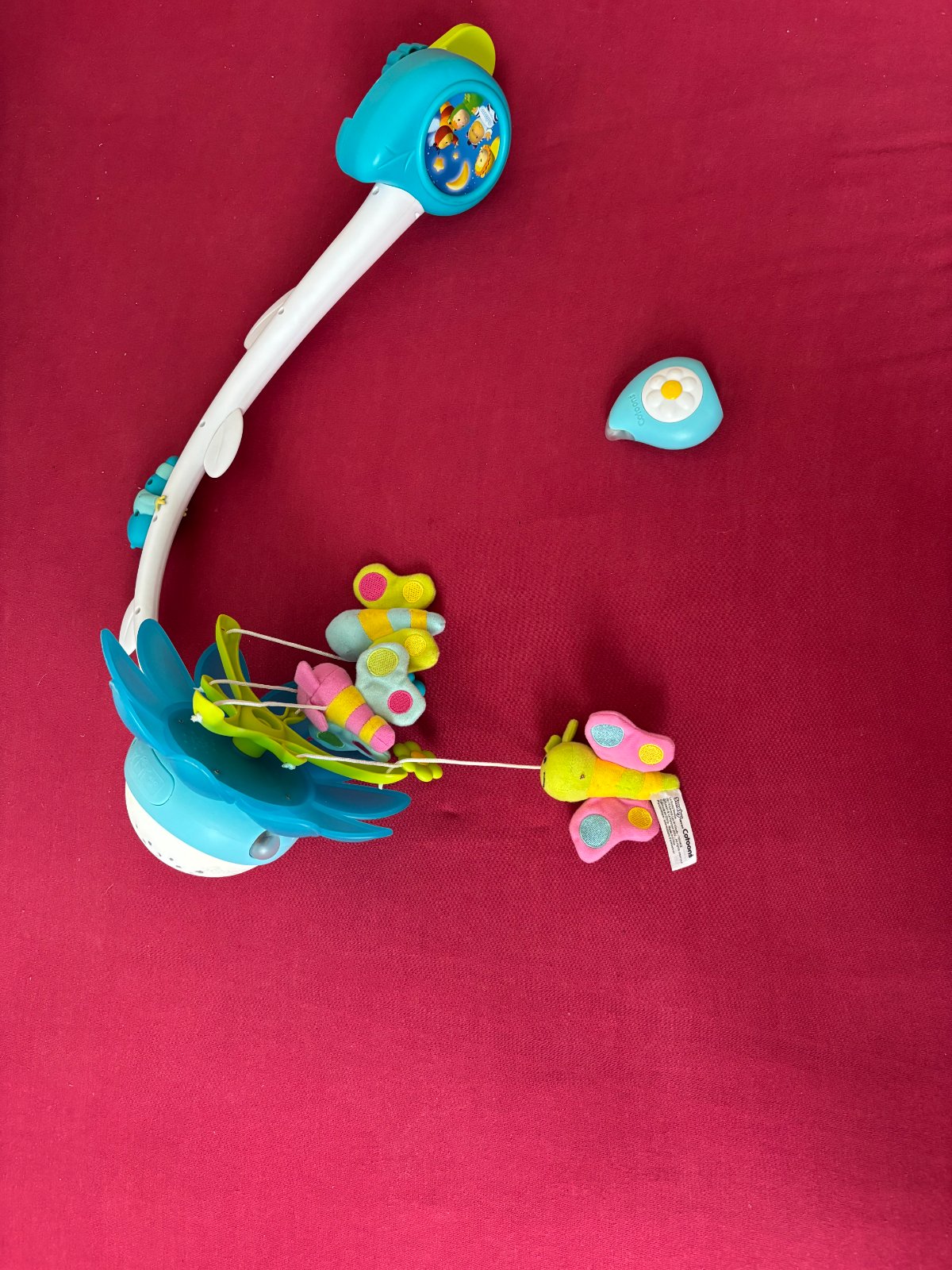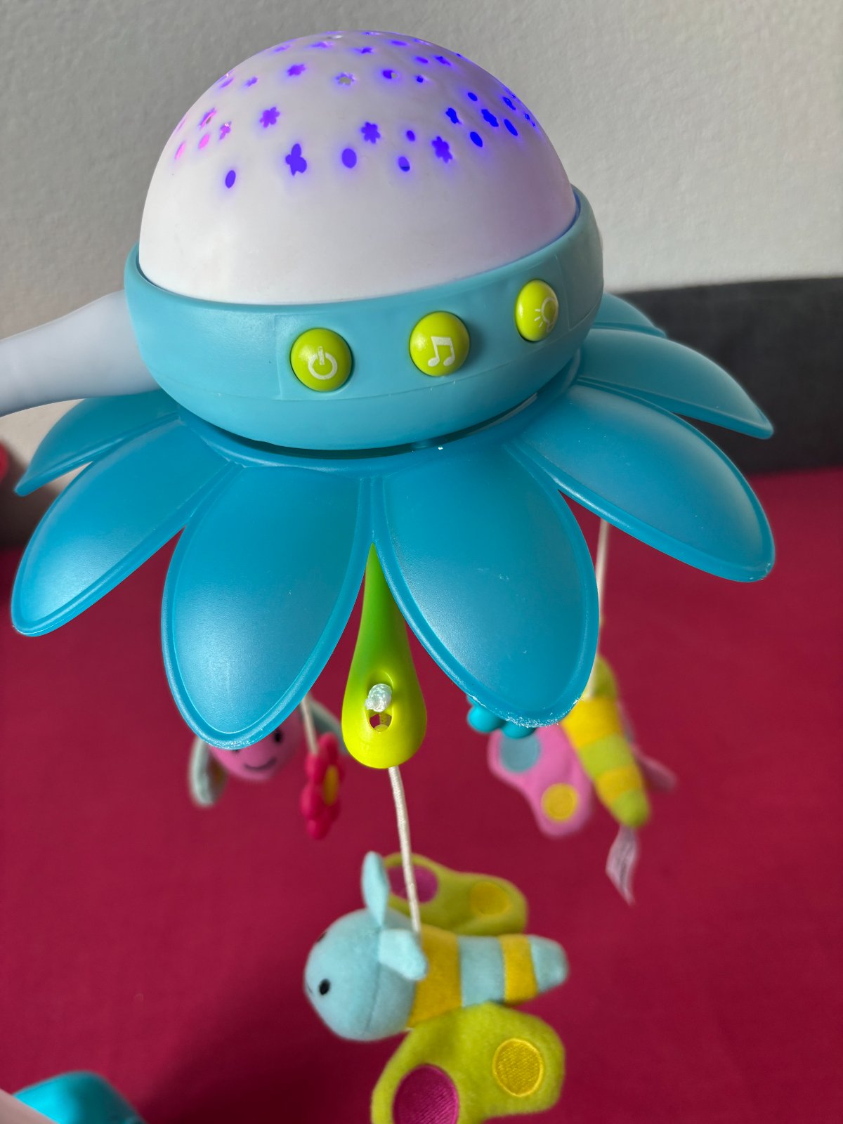 Hudobný kolotoč s upokojujúcou hudbou (4 melódie),nočné svetielko (3 farby) a svetelný projektor na strop.