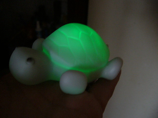 korytnacka pri zapnuti postupne meni farby medzi zelenou a ruzovou. Ukludnuje to deticky pri zaspavani. Dlzka aj s chvostikom 9cm, sirka 6,5 cm. Napajanie na 3 maličke gombikove baterky (nie su sučasťou)