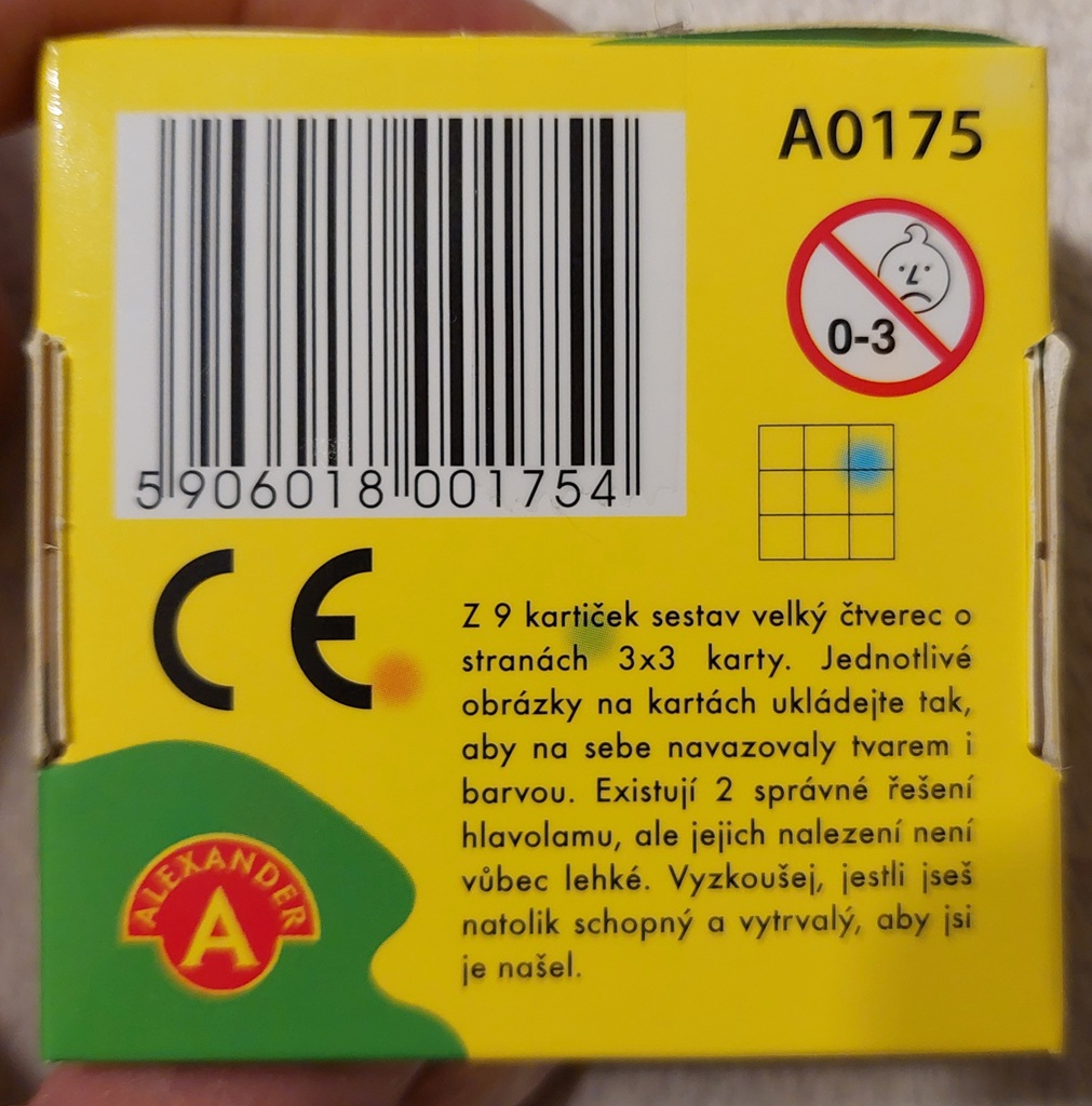 Obsahuje 9 pevných kartičiek o rozmere 50x50 mm, krabičku na uloženie kartičiek, slovenský návod k hre