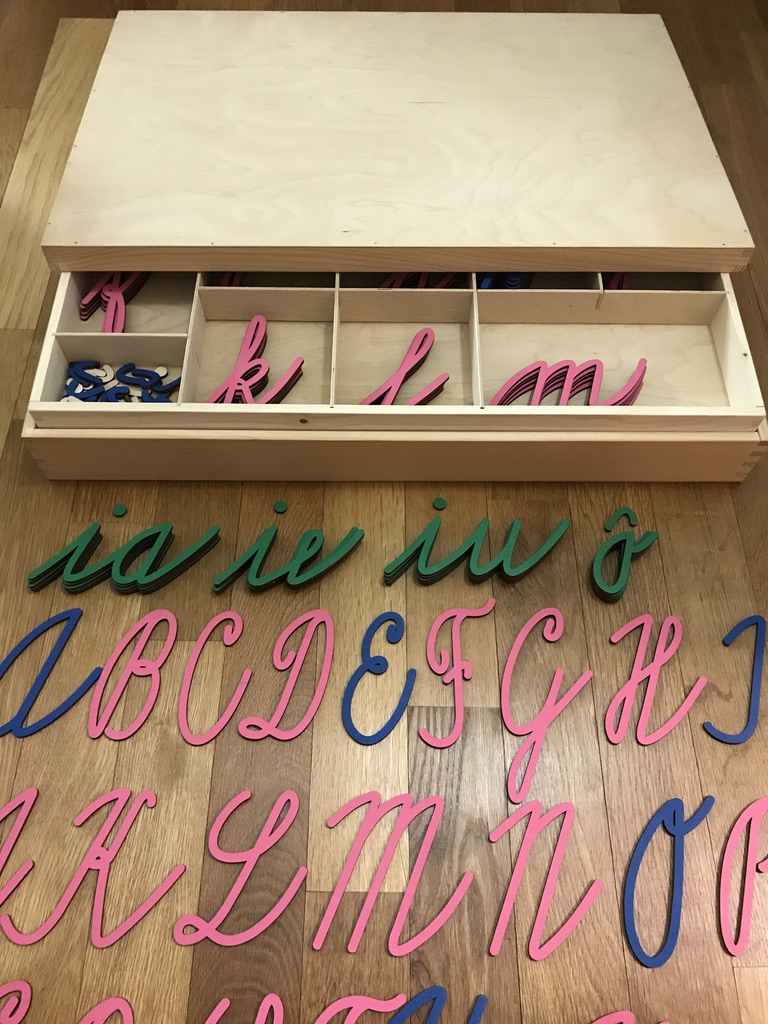 Nepoužívaná pohyblivá Montessori abeceda vo verzii: veľká tlačená, malá tlačená, veľká písaná, malá písaná, dvojhlásky, vždy aj s drevenou škatuľou. Písmená sú nepoužívané v 100% stave, materiálovo z dreva, zhodné s originál Nienhuis.