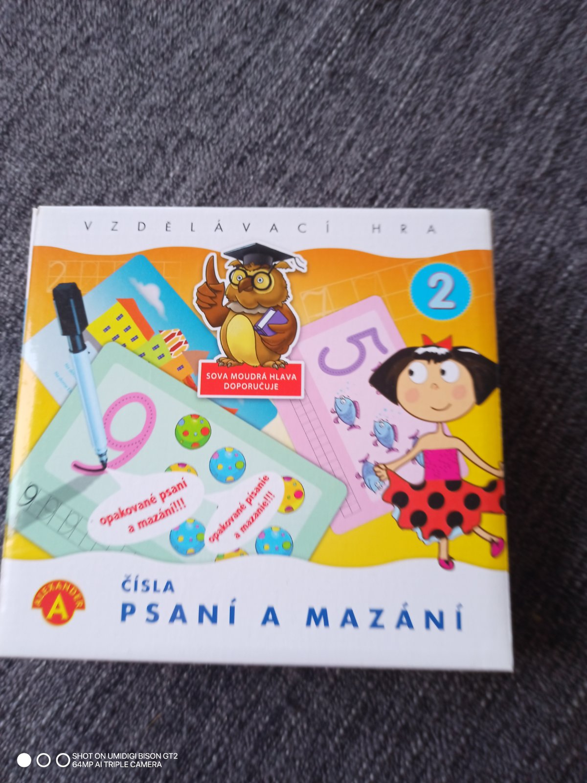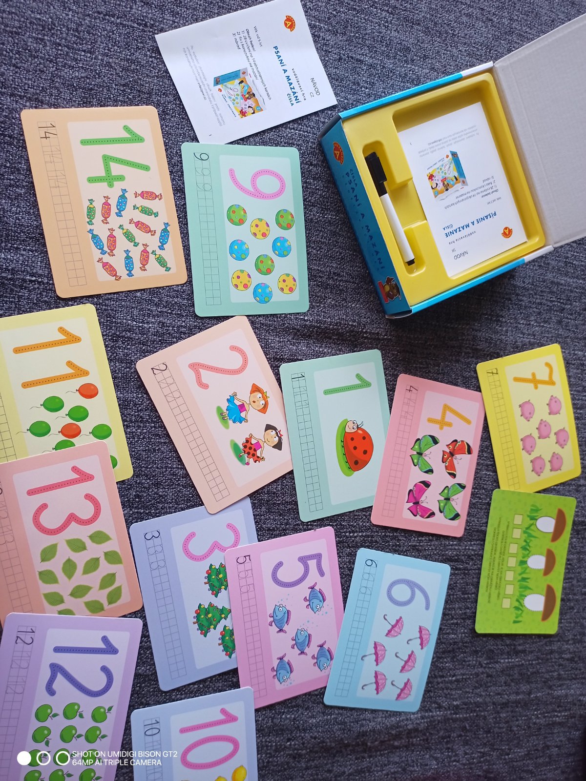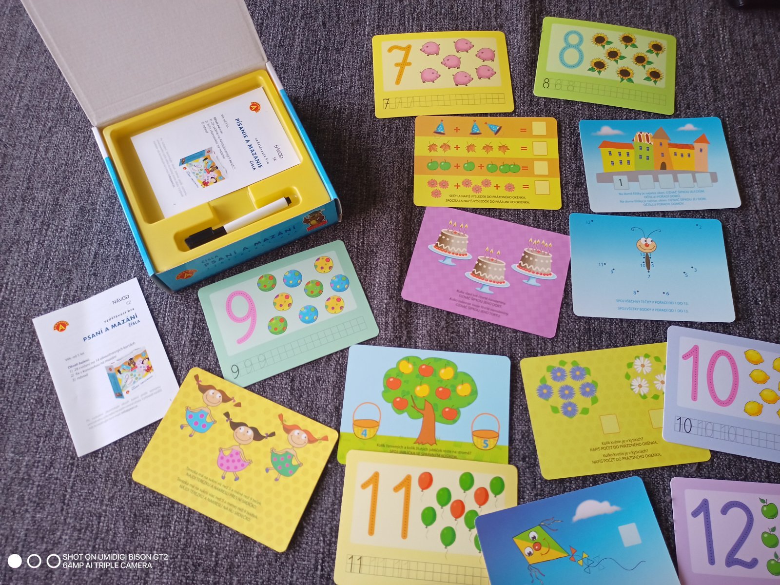 Písanie a mazanie 2, nácvik písania arabských číslic. Obojstranné stieratelne kartičky. Z druhej strany matematicka úloha k danému číslu. Nové.