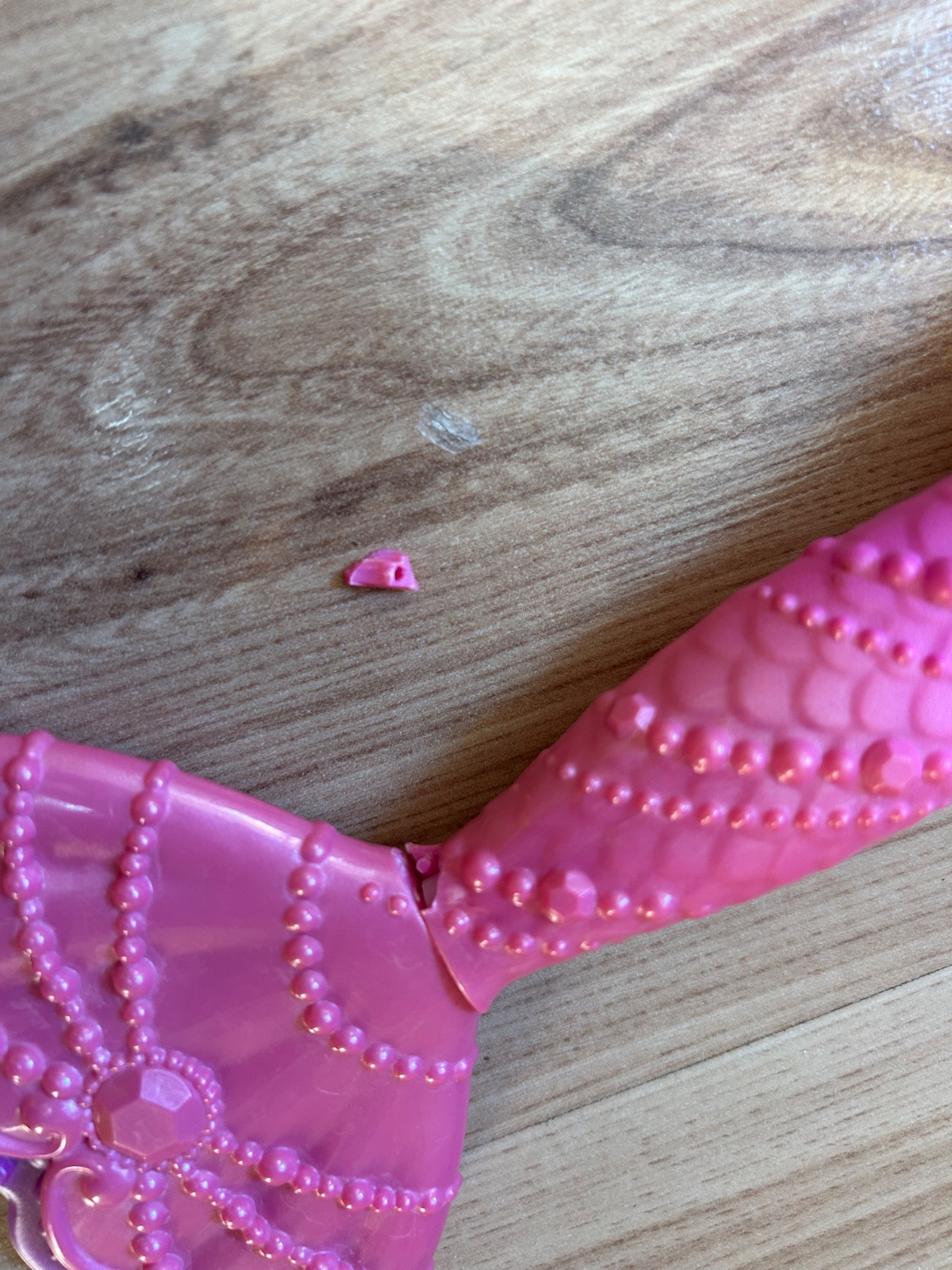 Je poškodená - odlomený kúsok, stále ho máme, môžete skúsiť prilepiť