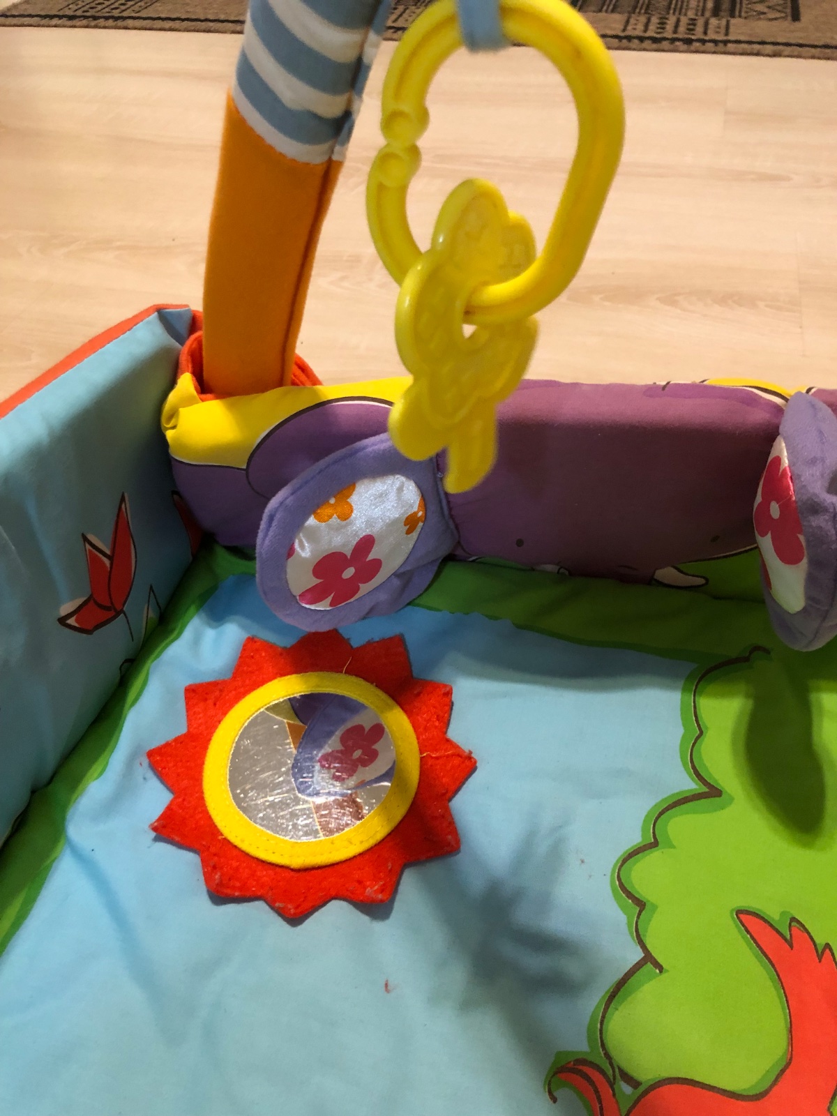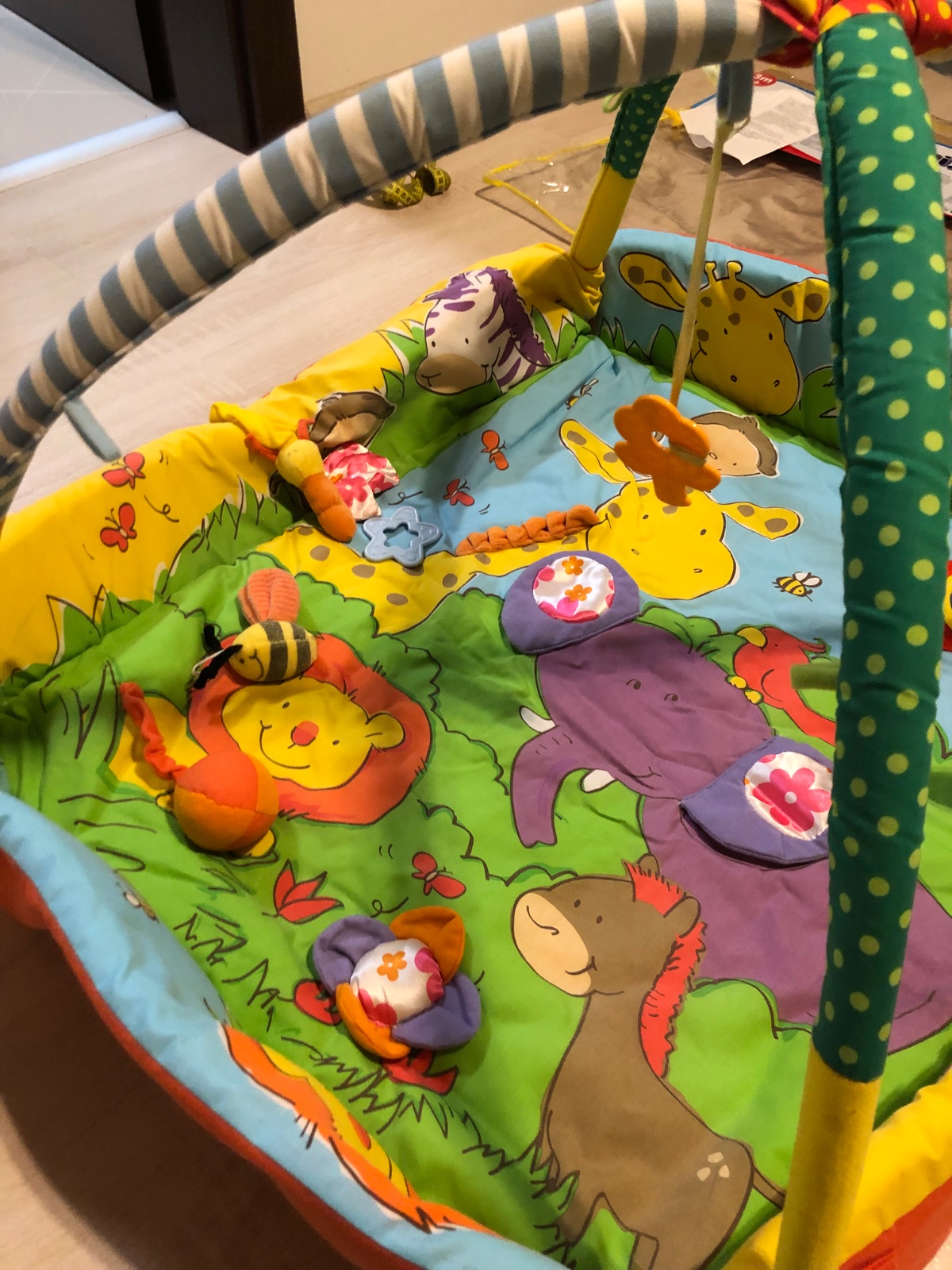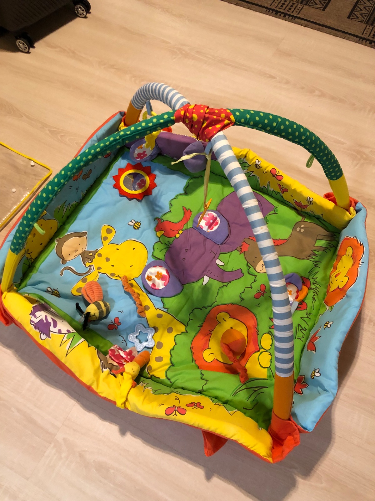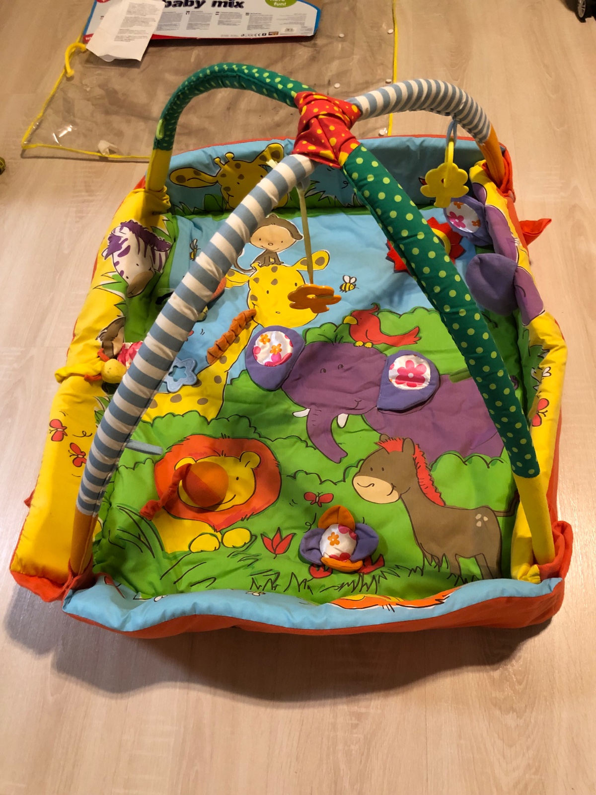 farebna hrana hracia deka-podlozka pre male babatka, v ok stave, na lavej strane na okraji, bude treba nejako narovnat tu vypln (molitan), lebo je trosku zohnuty od skladovania, ale inak som nenasla ziadne poskodenia…da sa to v pohode poskladat a zlozit