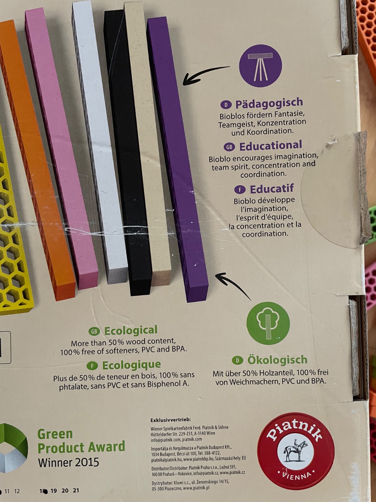 Stavebnica BioBlo od rakúskej značky Piatnik, je edukatívne hračka podporuje kreativituhravost tvorivosť koncentráciu a fantáziu z ekologickeho materialu s podielom dreva je hygienicka a umývateľna.