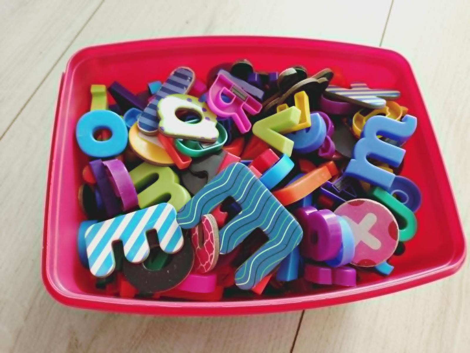 Rozne magnetky - písmená a čísla v dvojlitrovej nádobe od zmrzliny.