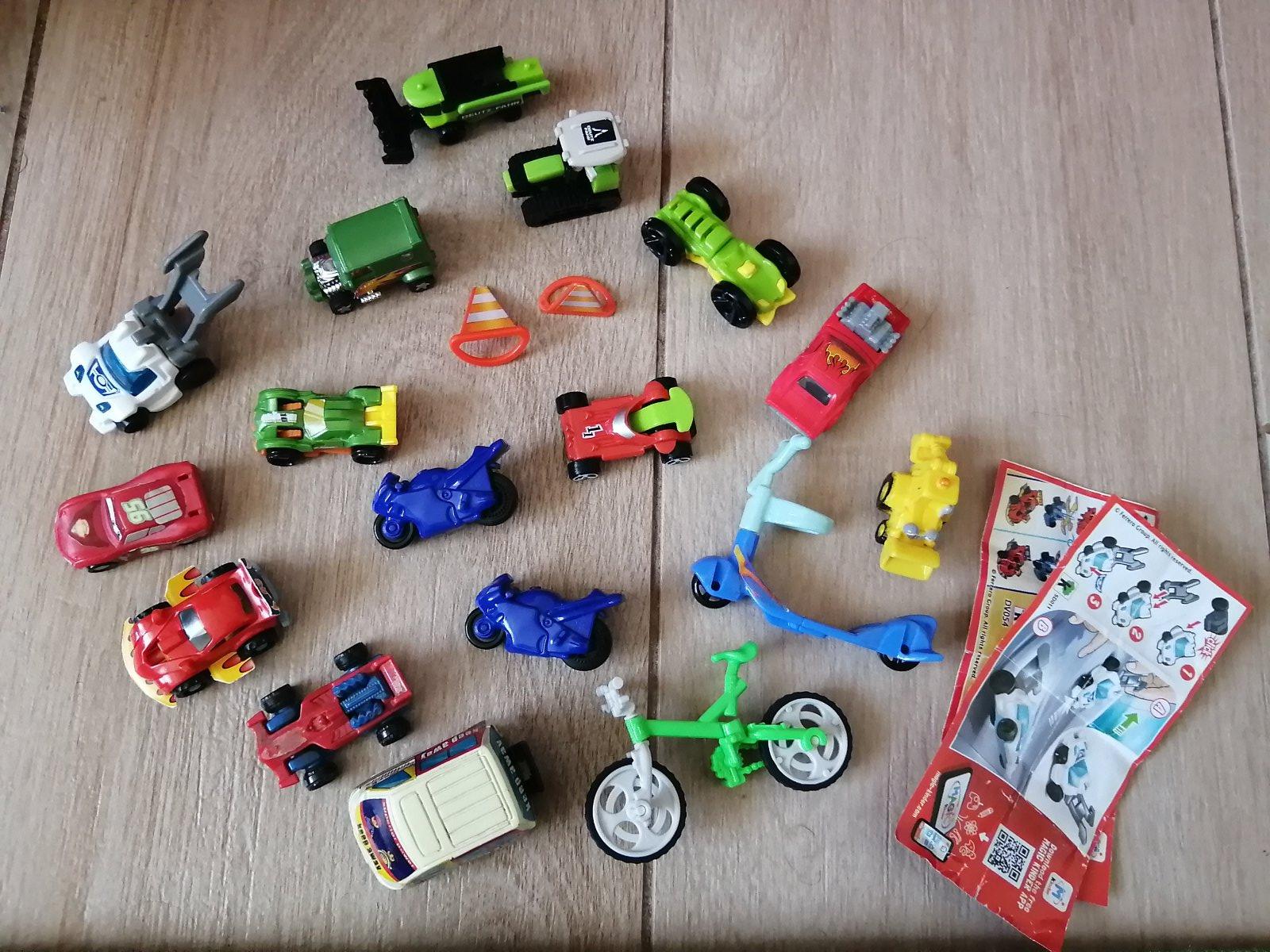 Malé autá, motorka, bicykel, kolobežka, dopravné kužele, bager, sanitka, niečo je z kinder vajíčka, ostatné netuším z kade je. Predáva sa všetko spolu