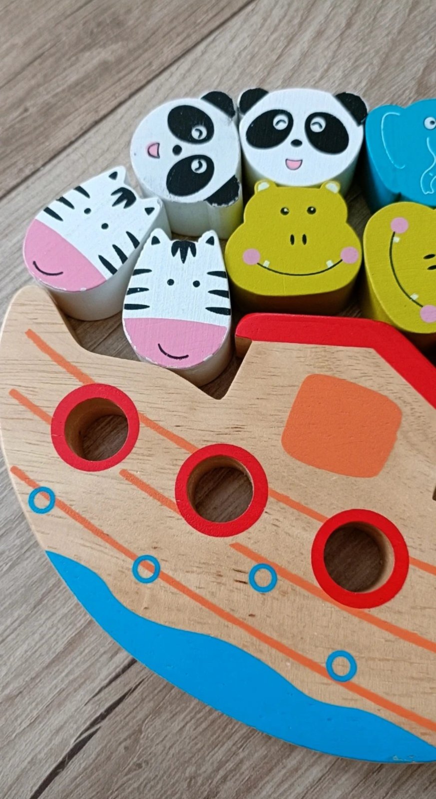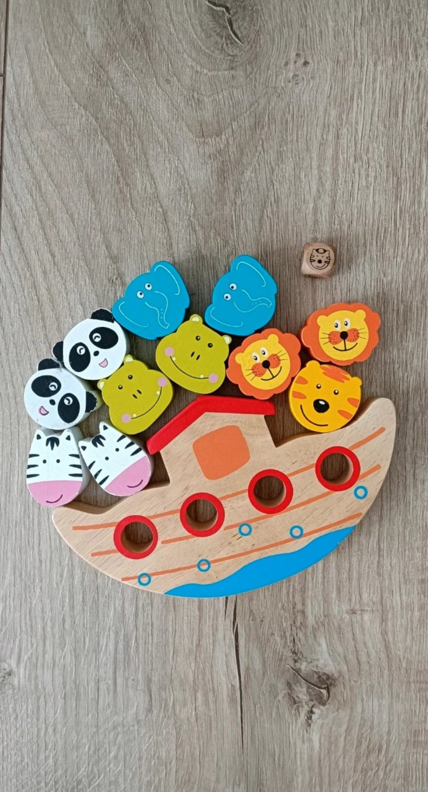 Detská hra obsahuje 12 drevených zvierat, archu a hraciu kocku. Dieťa si ňou precvičuje sústredenie, jemnú motoriku a zručnosť. Pekný hraný stav, niektoré zvieratká majú trošku ošuchnutú farbu, viď foto.