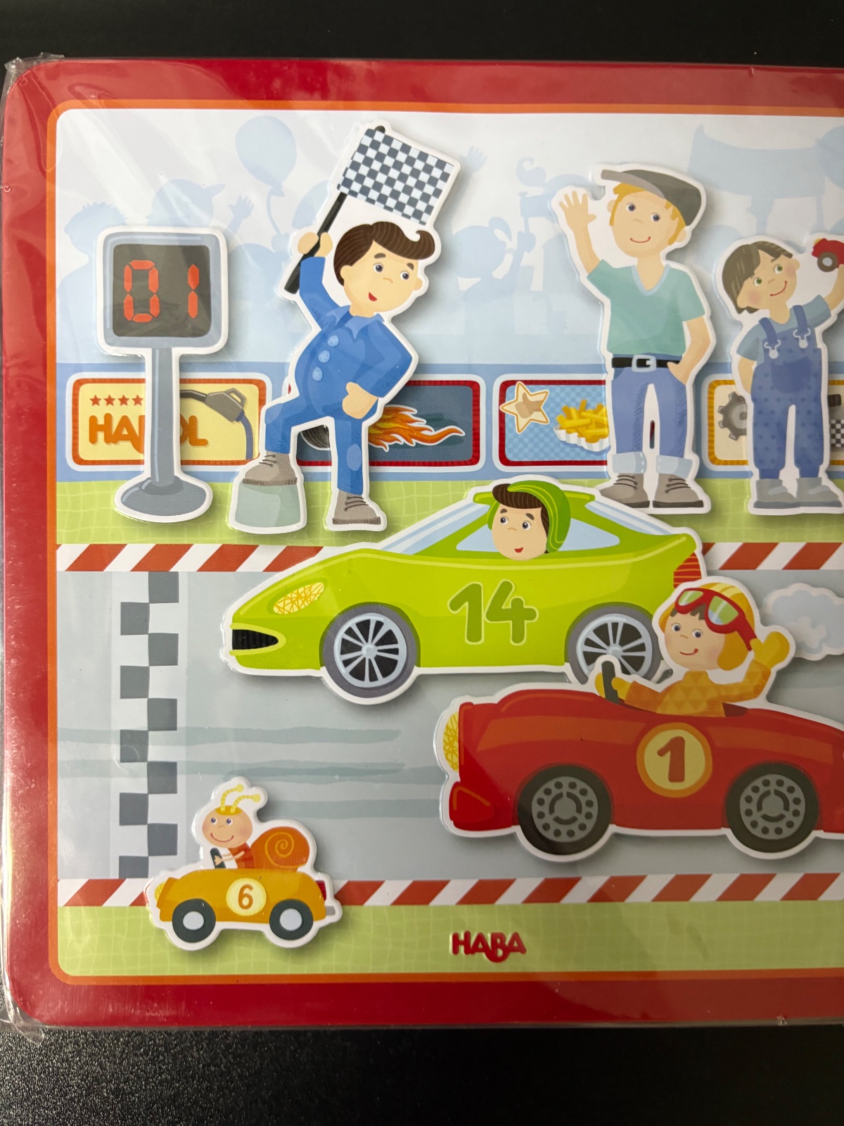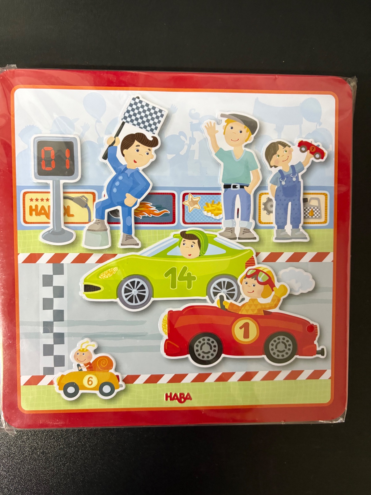 Maximálne zábavná magnetická hra pre malých pretekárov . Na 4 obrázky pozadí si deti naaranžujú rôzne scény z pretekov áut. K dispozícii majú autá s pretekármi, divákov a mnoho ďalších doplnkov. Všetko je uložené v odolnej plechovej škatuli. Hra je zábavná a zároveň pomáha rozvíjať predstavivosť a jemnú motoriku. Rozmery škatule sú 20,5 x 20,5 cm. Hračka je vďaka svojmu obalu vhodná aj na cesty do auta.