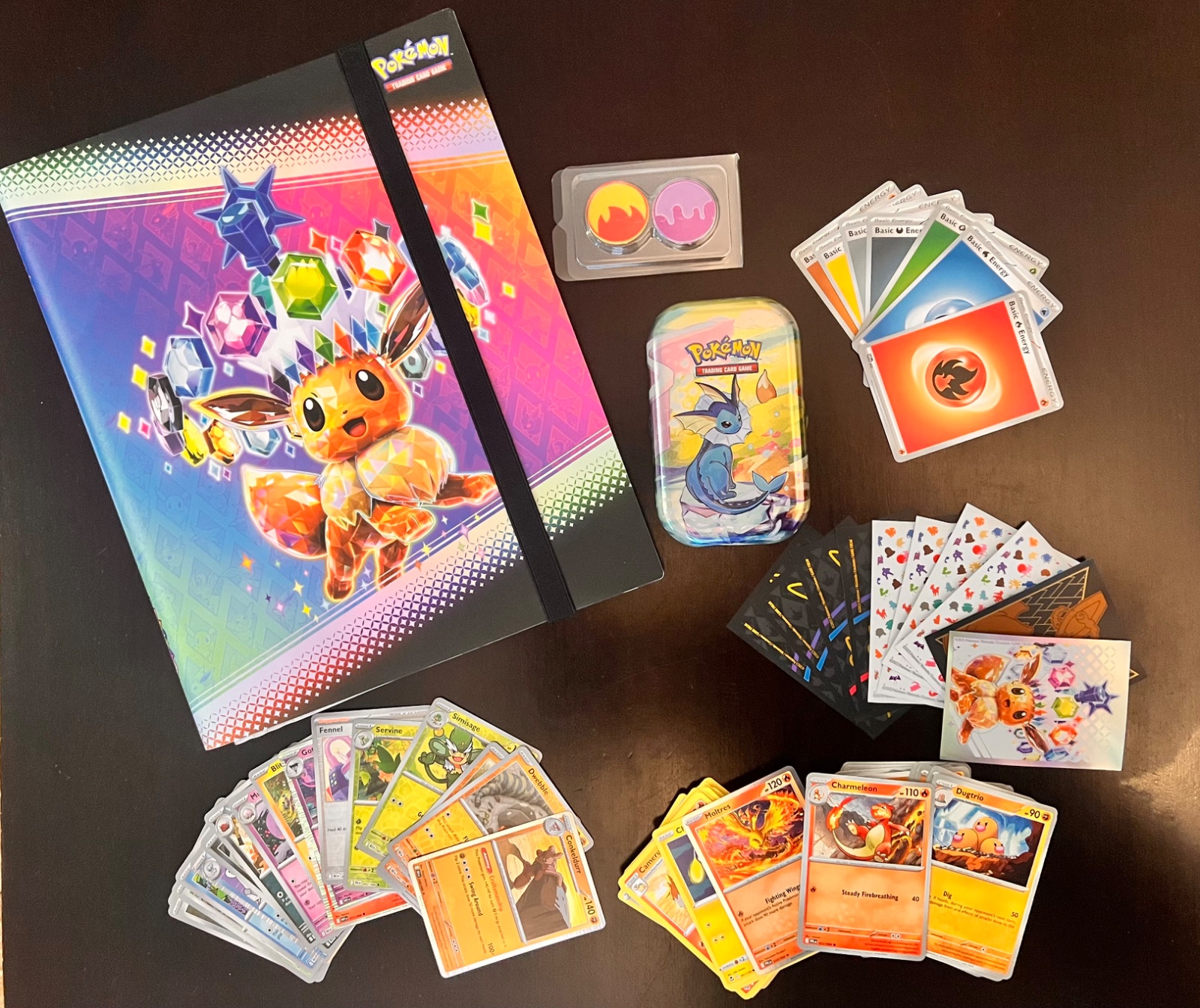 1 ks nový album, 1 ks mala plechová krabička na karty, 80 ks nových obyčajných neopakujucich sa kariet, 20 ks nových lesklých neopakujucich sa kariet, 10 ks obalov na karty a energie
