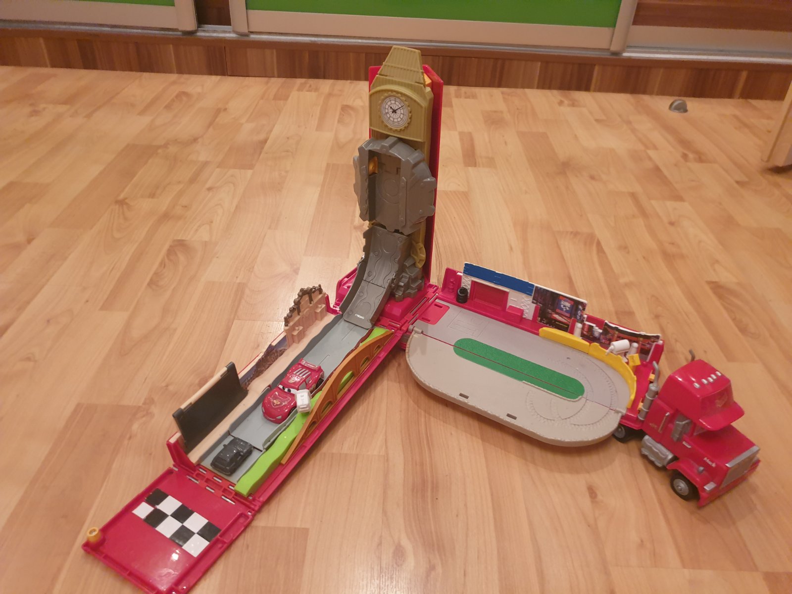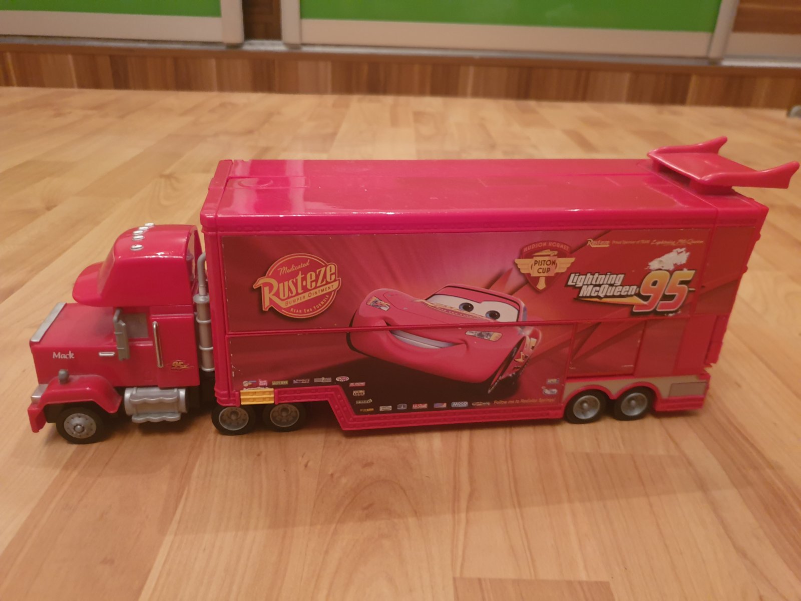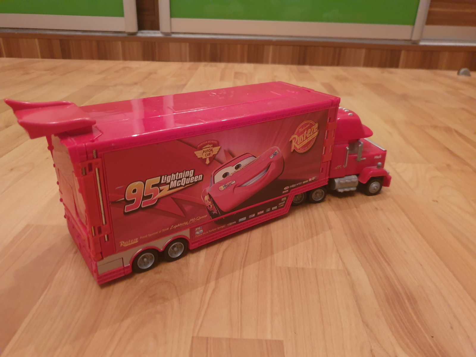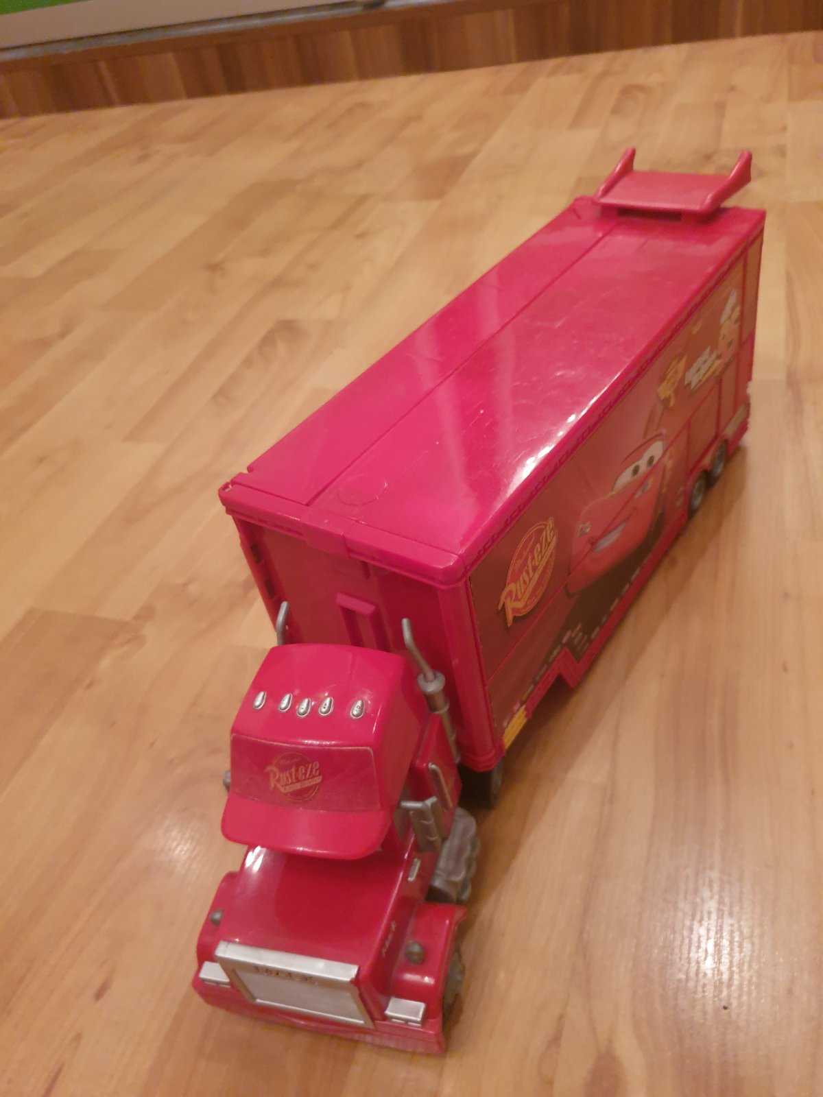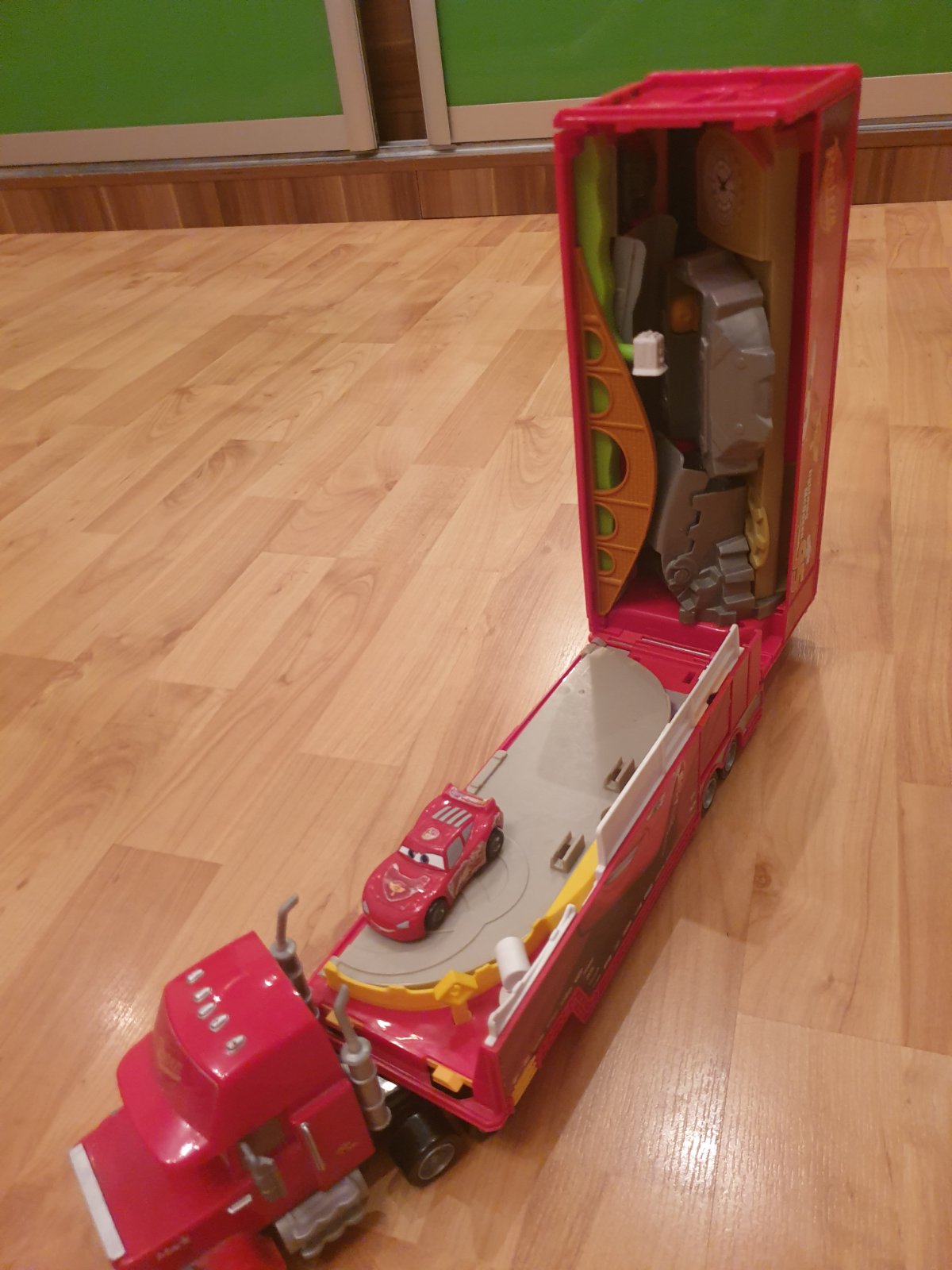 Rozkladaci kamion Mack s malym McQueenom vnutri, rozlozi sa ako draha.