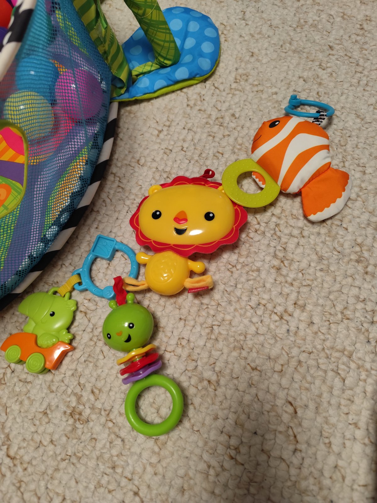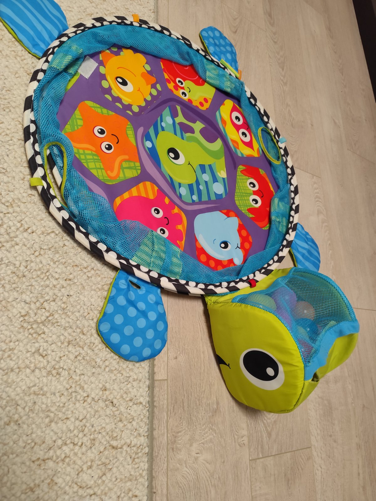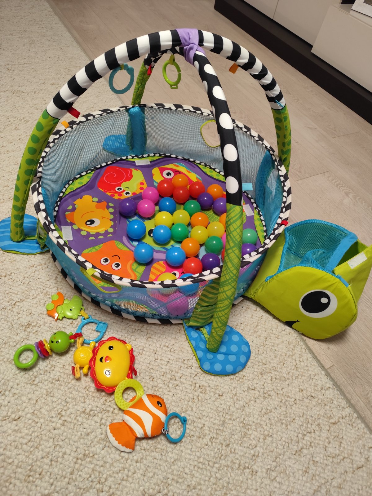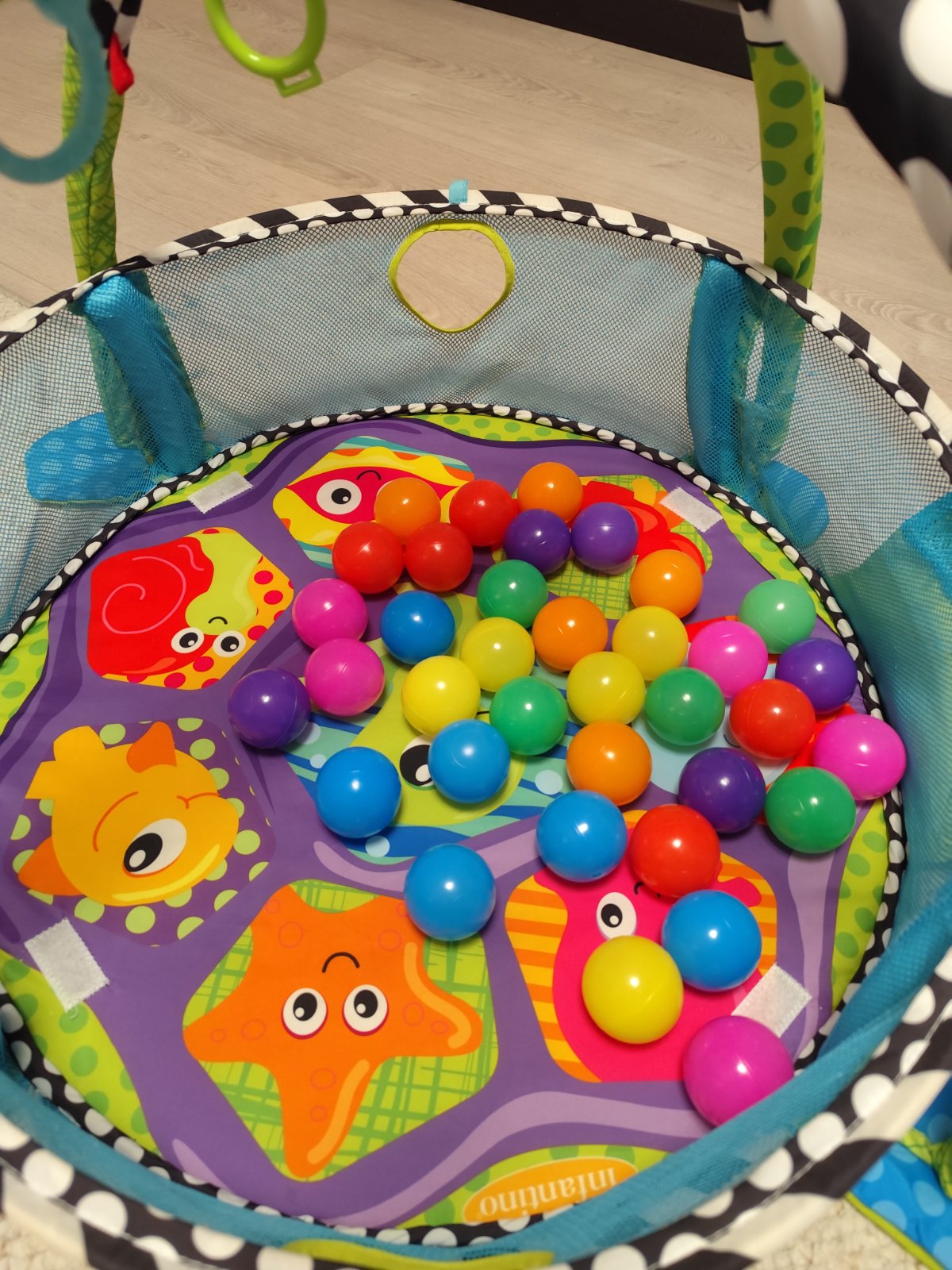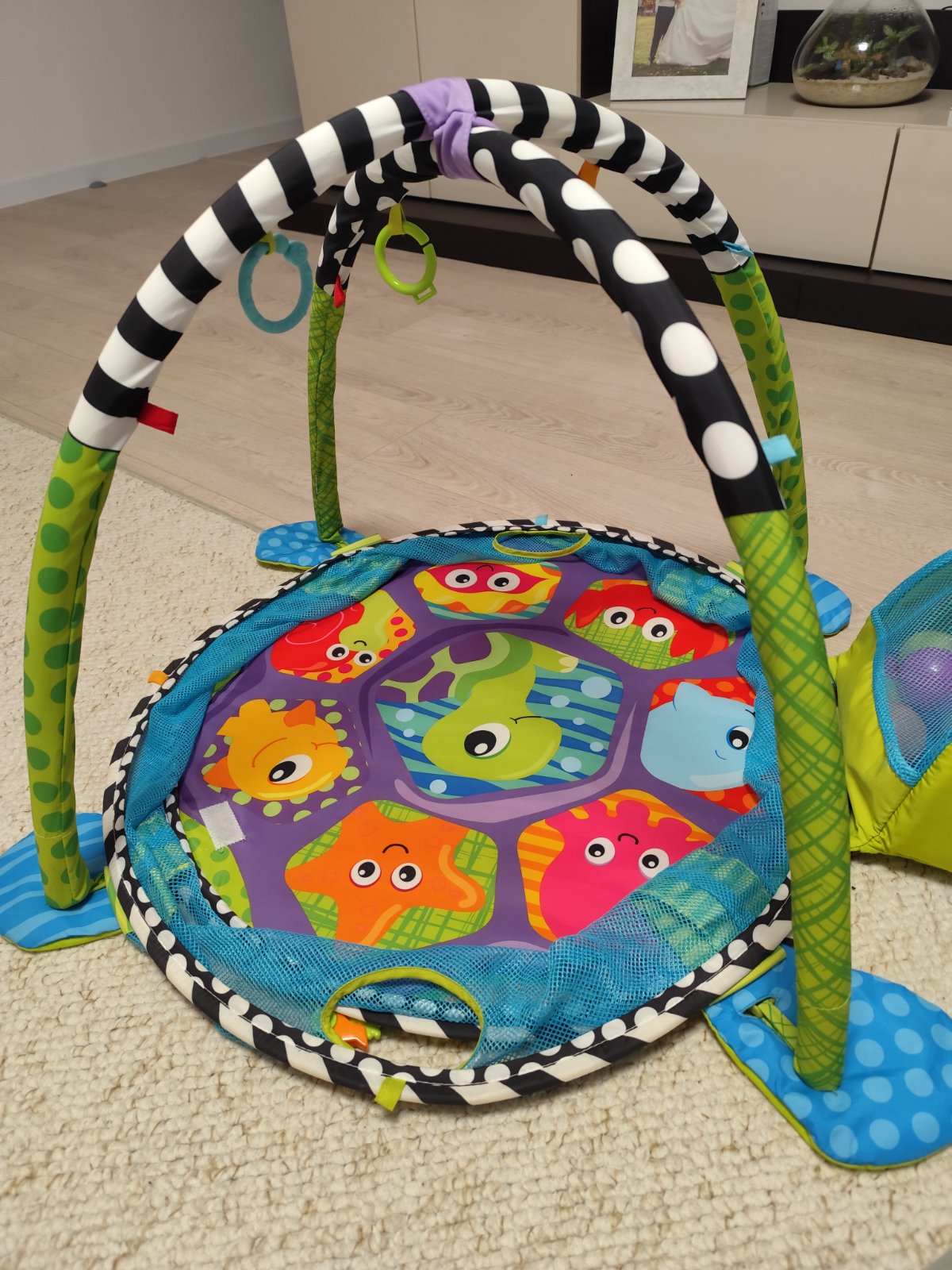 Hracia deka, možné z toho spraviť aj guličkový bazenik. Vo veľmi dobrom stave, poslúži ešte nejednému dieťaťu. Z originál hračiek ostala len rybka,.priložím iné hračky na zavesenie. Guličky sú všetky úplne nové, nehrane. Osobný odber BA alebo Miloslavov/Rovinka/DL