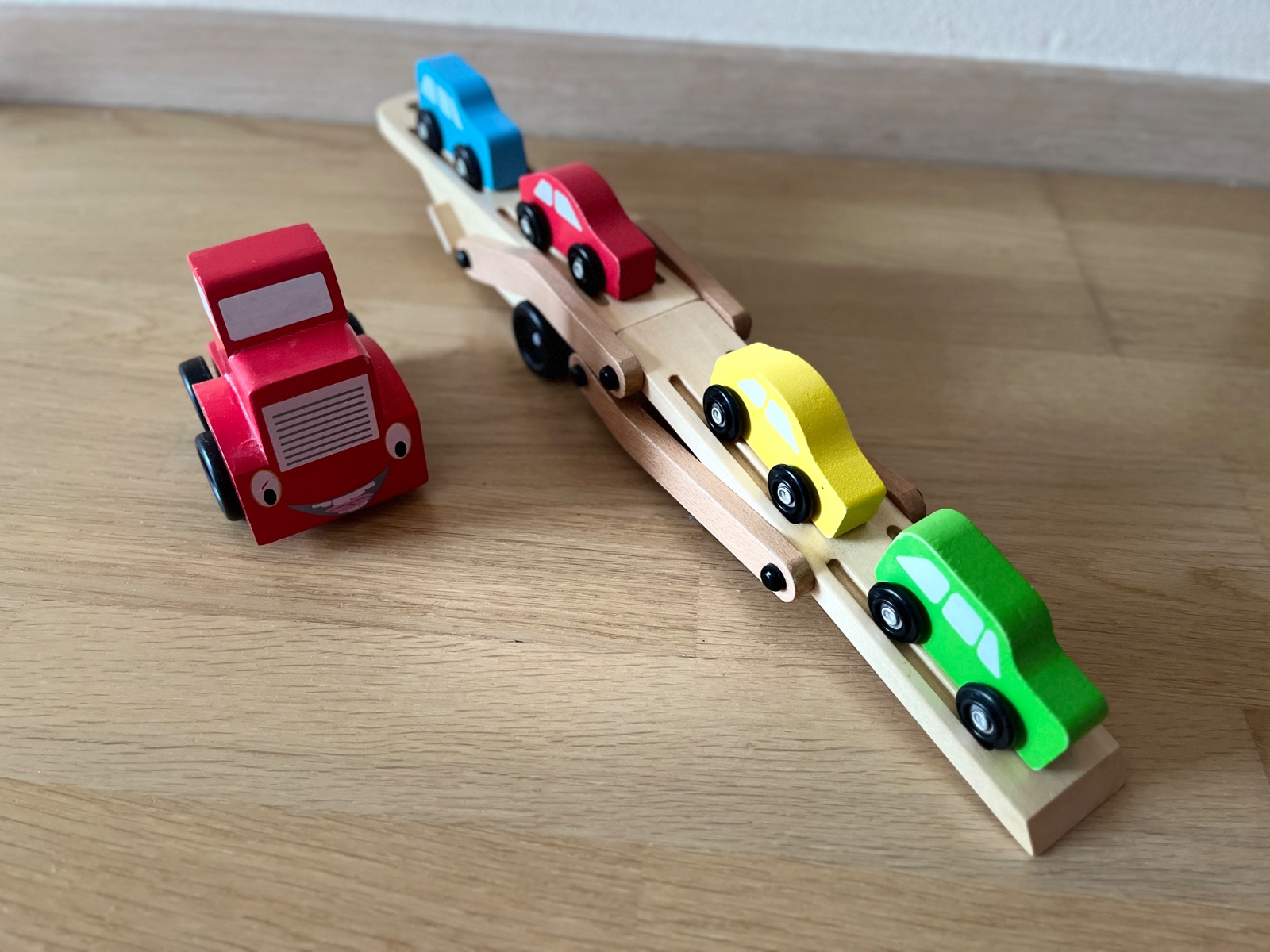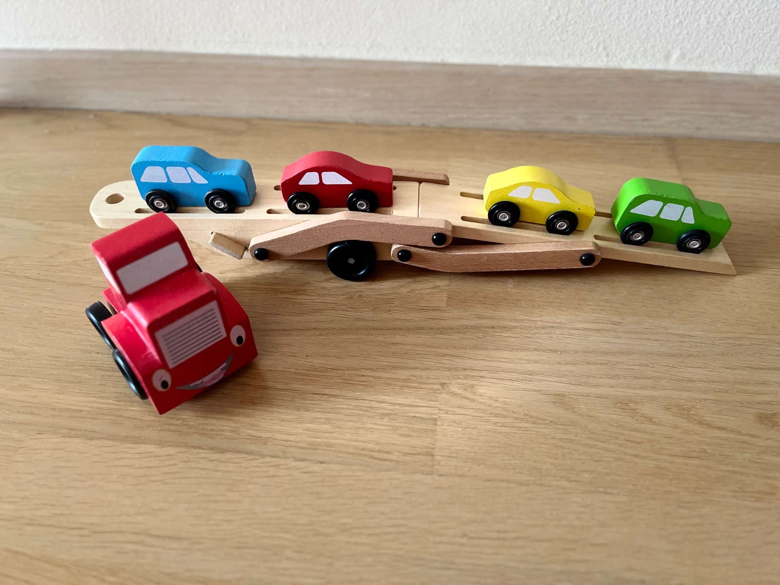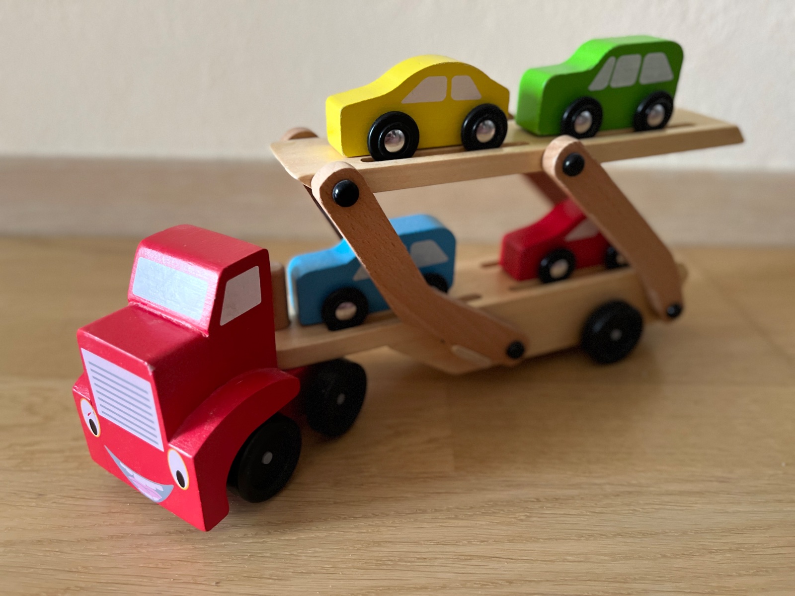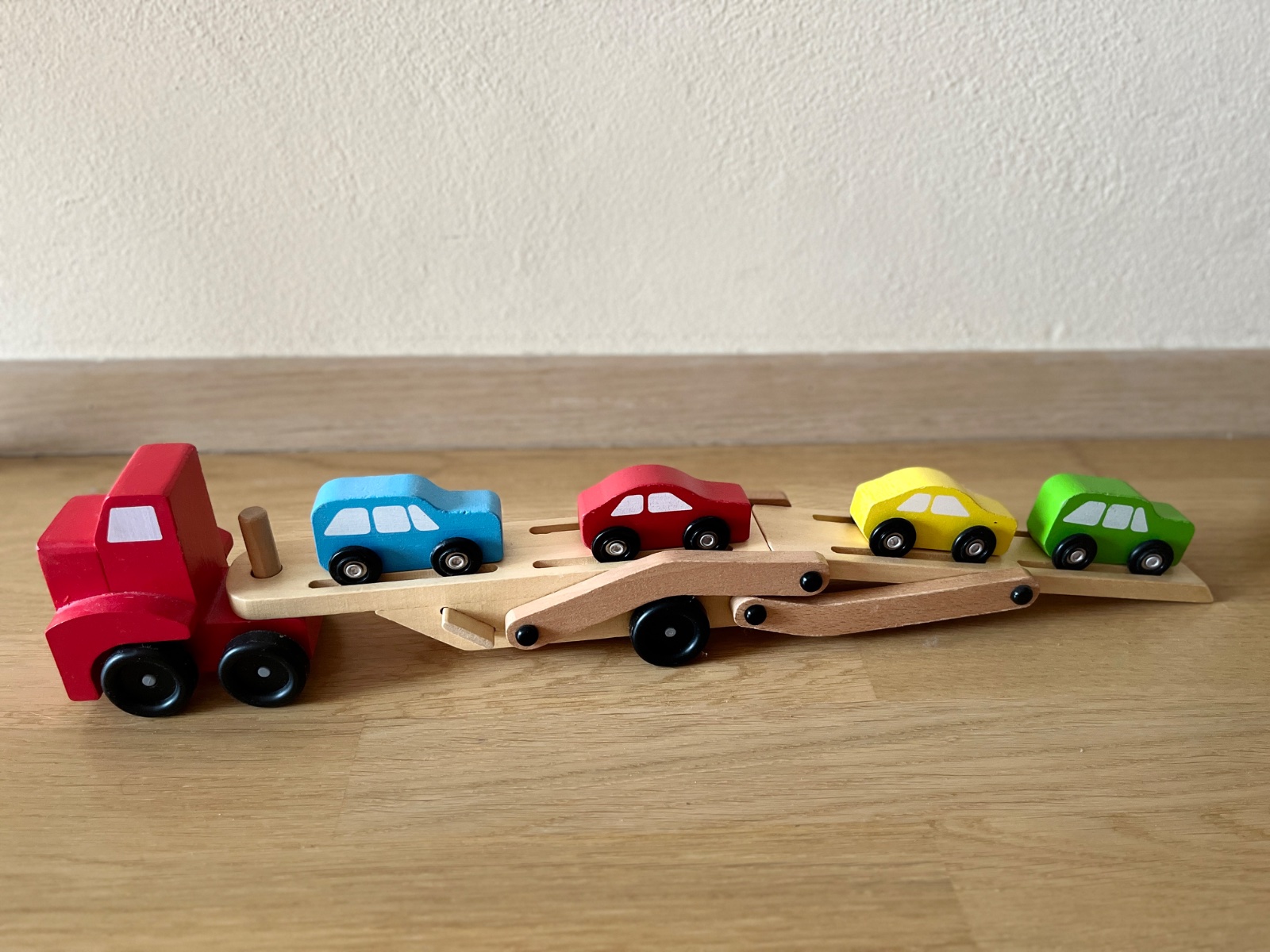 Drevený kamión s vyklápacou plošinou vrátane 4 autíčok bez poškodení.