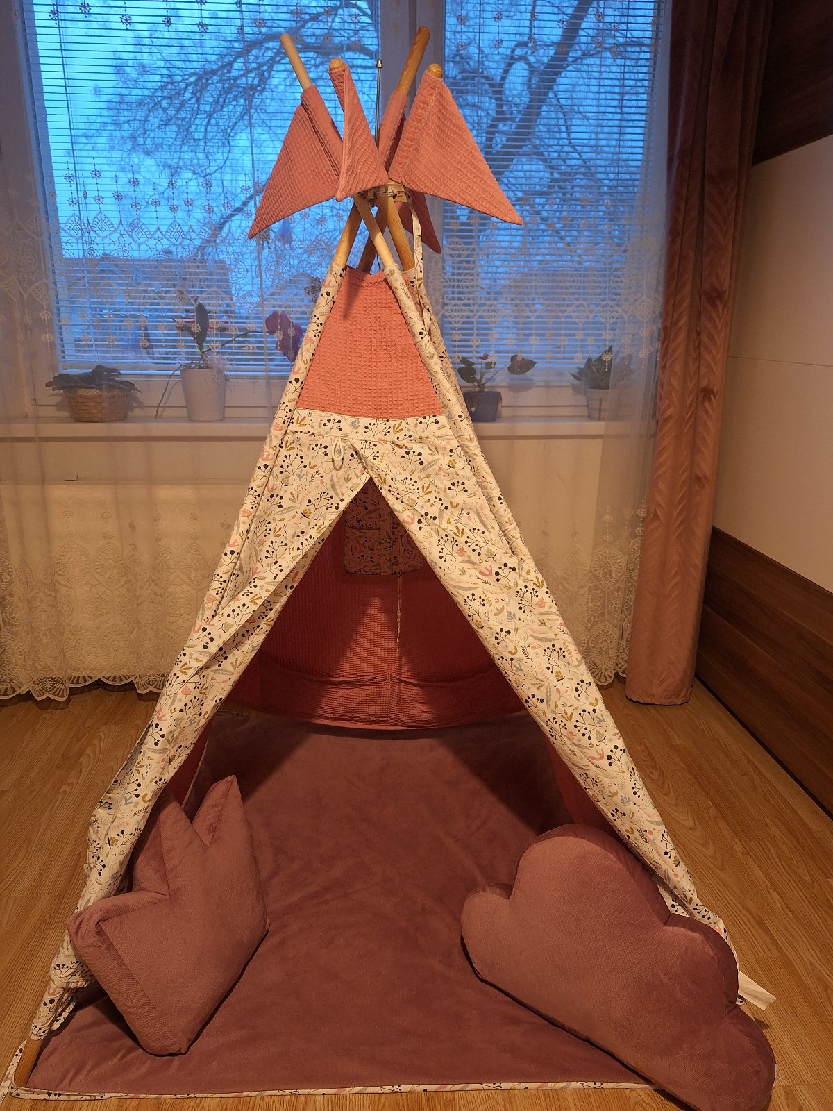 Ružový teepee stan s doplnkami (2 vankúše a box na hračky).