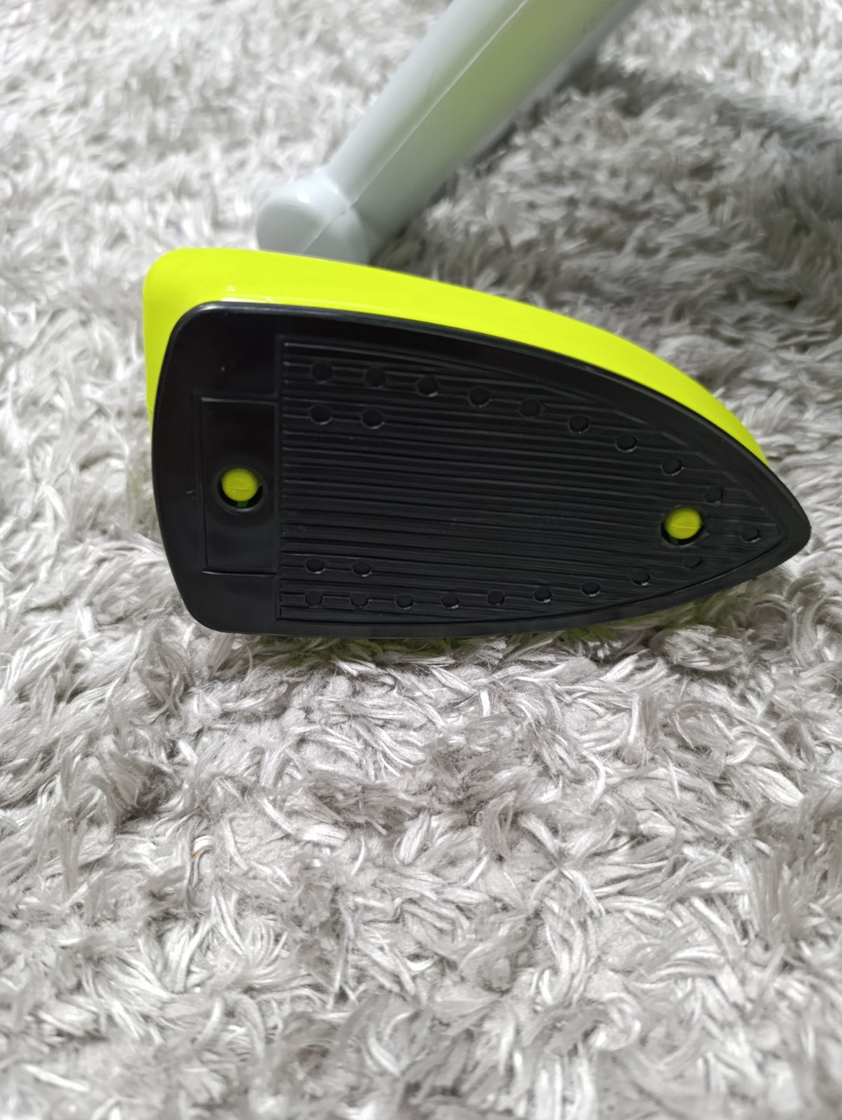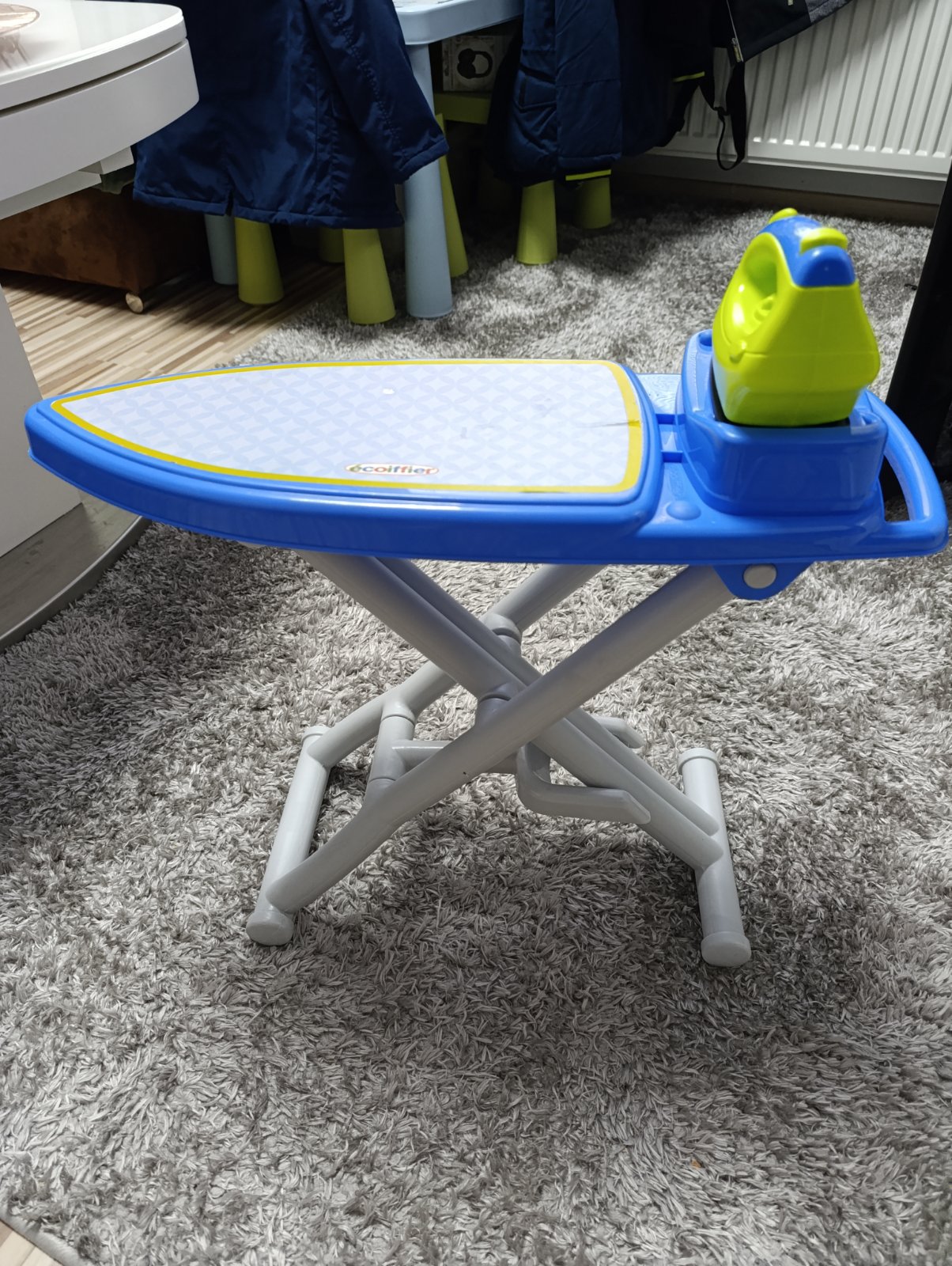 Detská žehliaca doska so žehličkou, bez poškodení, len na nálepke vidieť známky používania. Doska je stabilná a skladateľná. Žehlička je bez zvukových a svetelných efektov. Odolný plastový materiál.