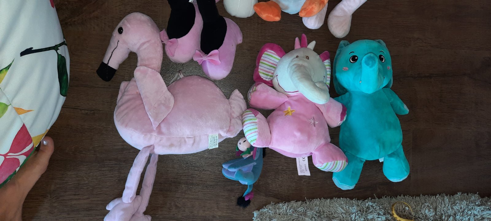 Modry slon 32cm,ruzovy 26cm,Minnie 46cm,pelikan 44cm,sova 31cm,pes 35cm