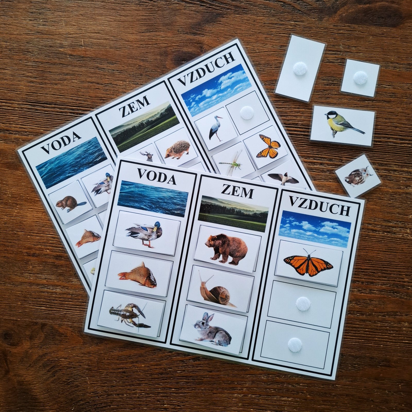 Aktivita voda-zem-vzduch. Buď vo verzii zvieratá, alebo dopravné prostriedky, buď 9 väčších obrázkov pre menšie deti alebo 18 obrázkov pre väčšie deti. Podklad má formát A4, zalaminované, dieliky sa pripínajú suchými zipsami. Cena za jednu je 3 eurá.