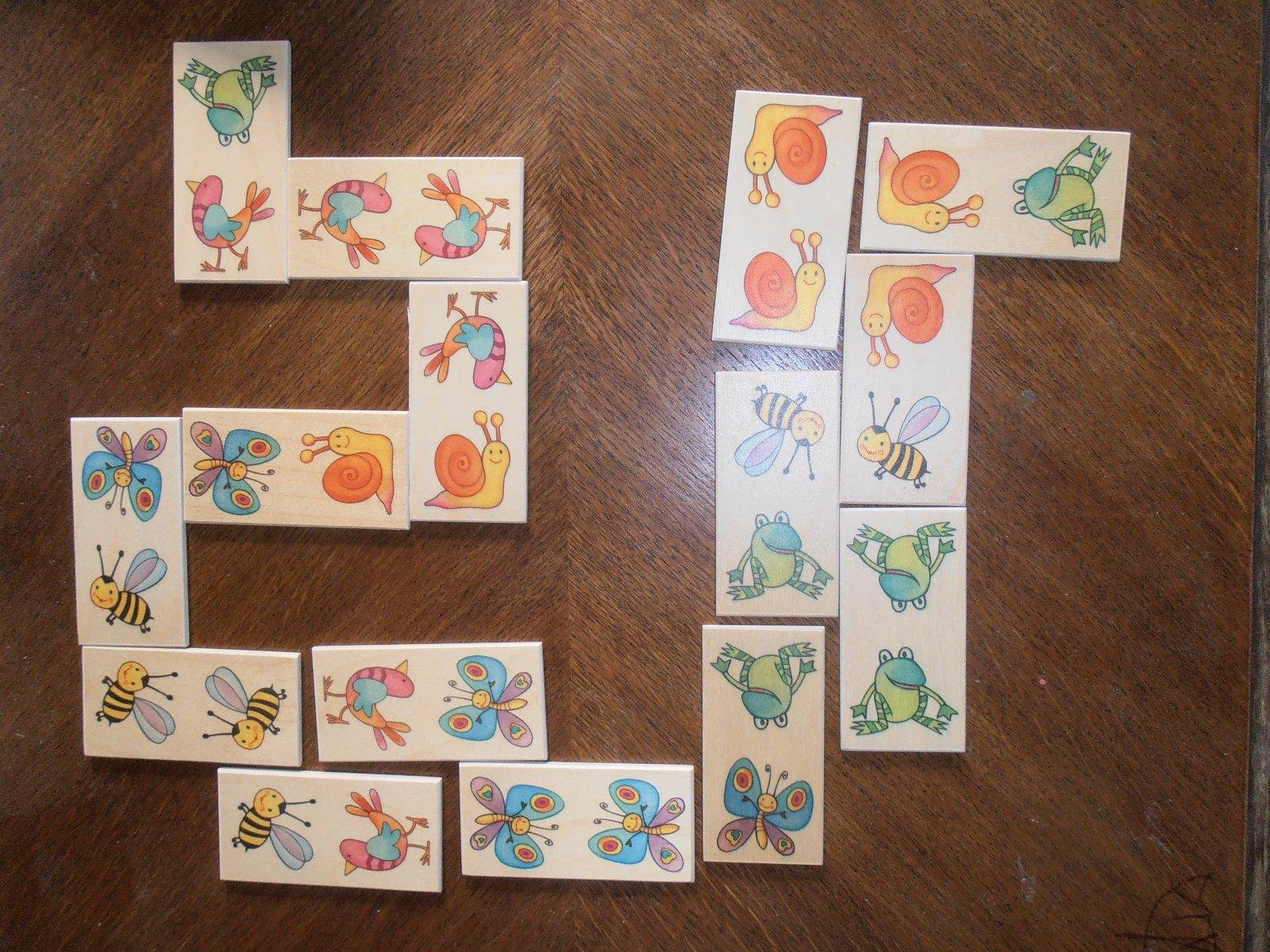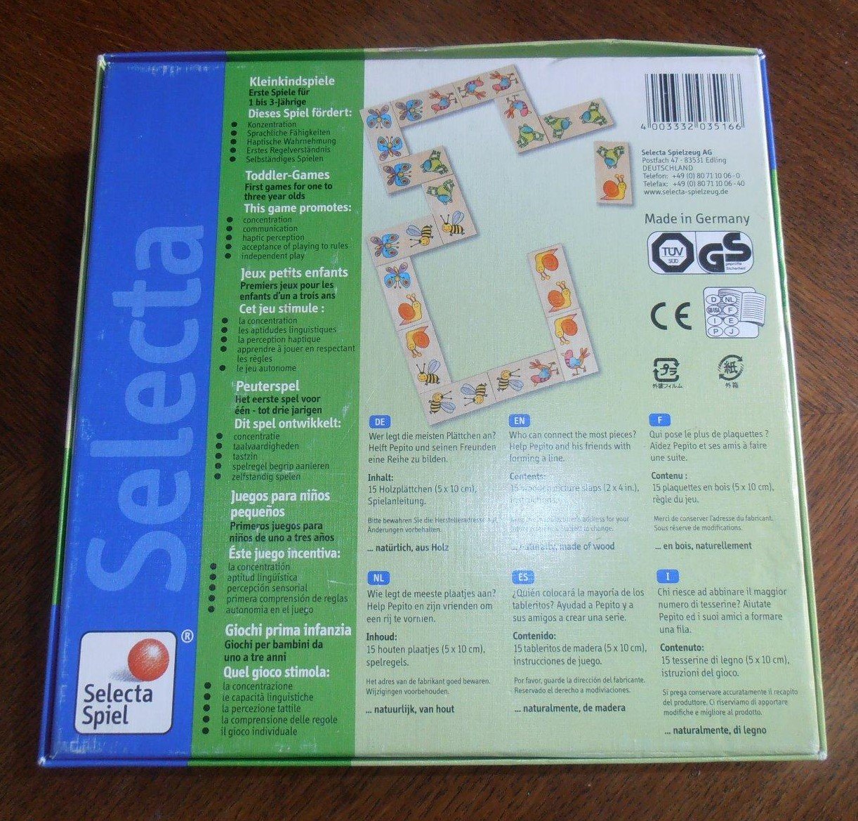 Veľké dieliky - 5x10 cm. Drevené domino. Krabica trochu opotrebovaná, samotné domino v super stave. Originál pravidlá v angličtine, nemčine, francúzštine, holandčine, španielčine, taliančine , portugalčine a japončine + vytlačený slovenský návod na obrázkové domino.