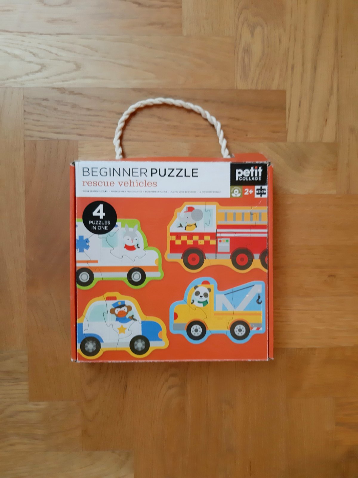 Puzzle, kde králik riadi sanitku, opice policajné auto, slon hasičské vozidlo a panda odťahovku, to sú skladačky s 3, 4, 5 a 6 kusmi. Sada puzzle obsahuje 4 motívy záchranných vozidiel.