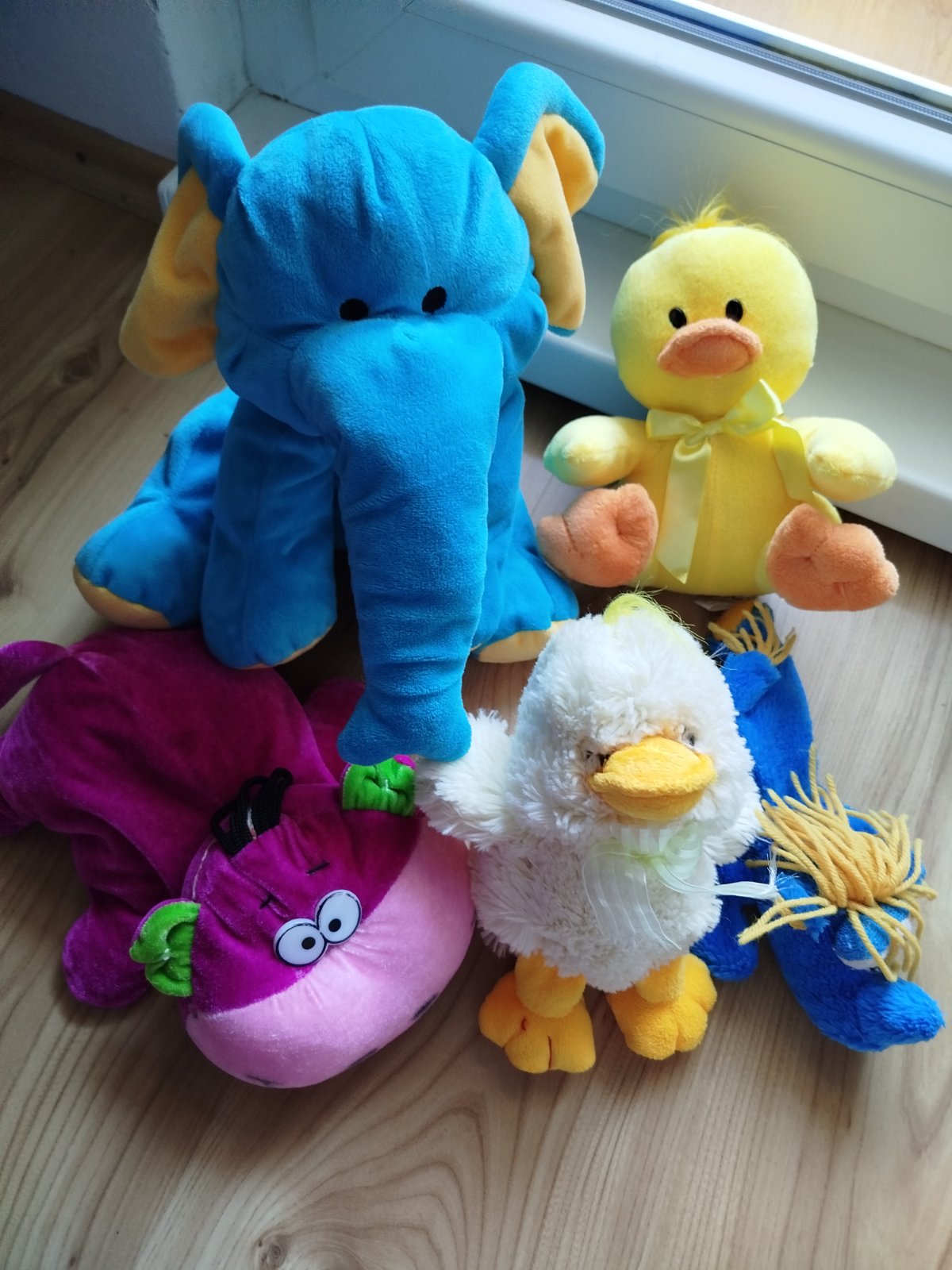 Predám spolu plyšové hračky, modrý slon, žlté kacatko, biele kura, ružová kravička, modrý psík.