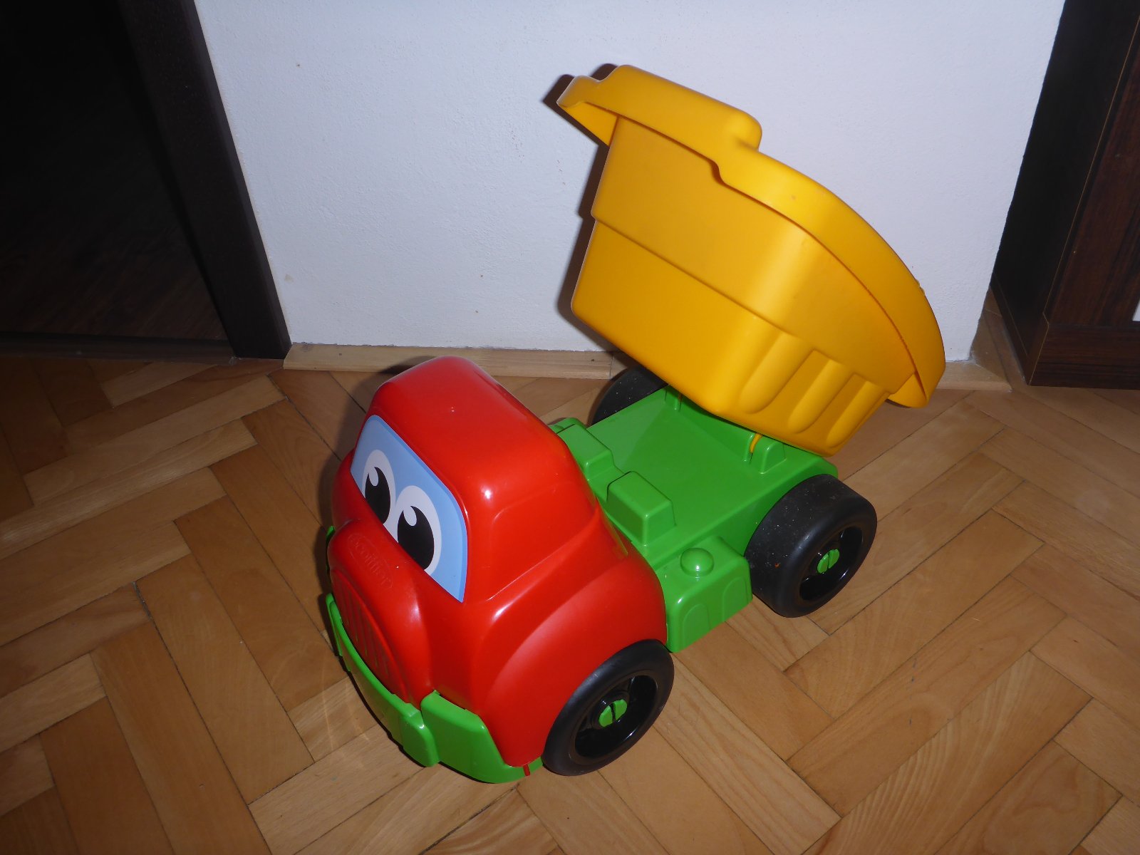 Predám veľké nákladné vyklápacie autíčko, ktoré má pohyblivé kolieska a nákladný priestor, z ktorého sa dá náklad vyklopiť. Má pekný dizajn s veselou tváričkou, autíčko má bezpečné oblé tvary a peknú žlto-červeno-zelenú farbu. Autíčko je vhodné na hranie vnútri po podlahe ale i vonku po zemi či na piesku. Hračka je vo výbornom stave bez poškodenia.