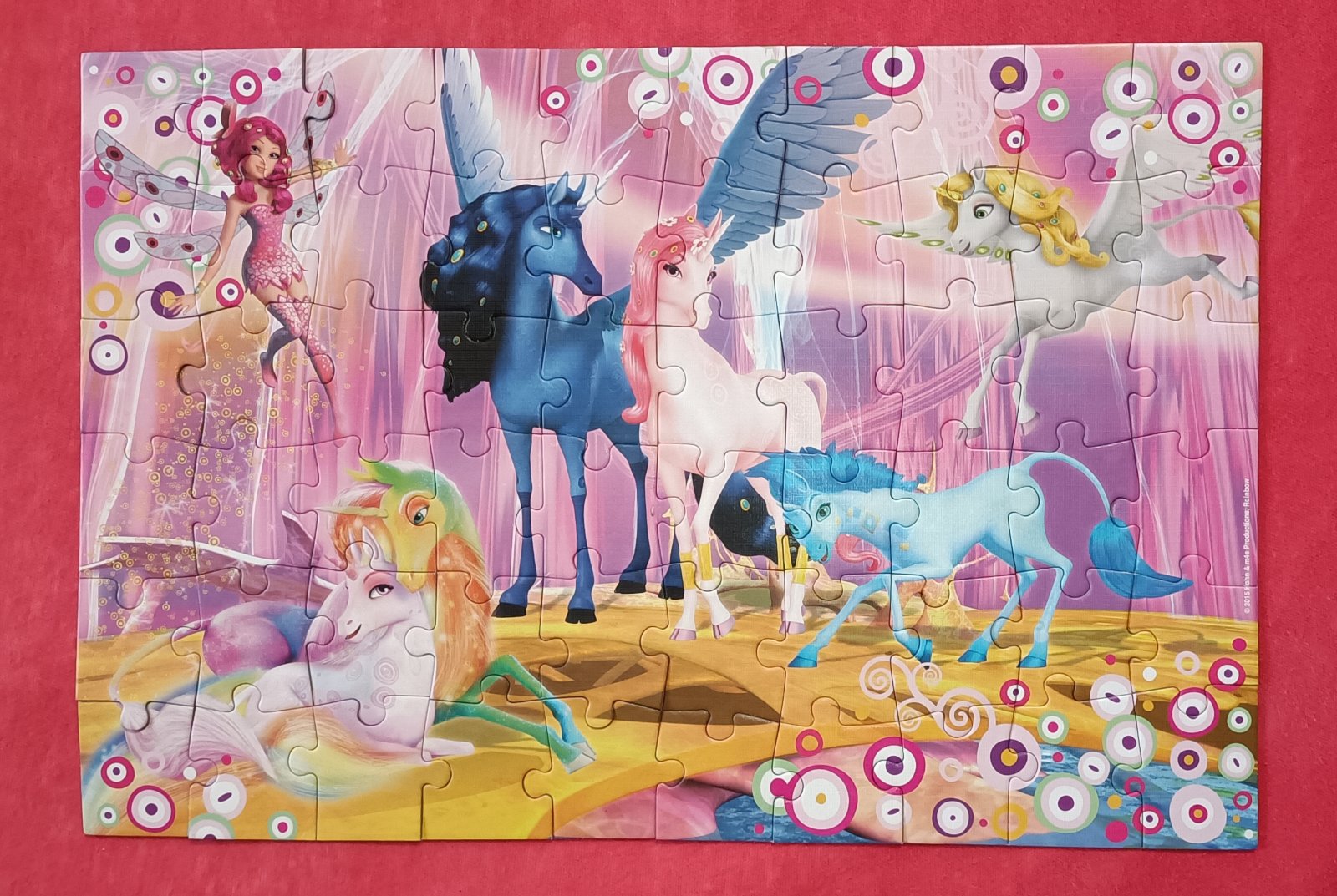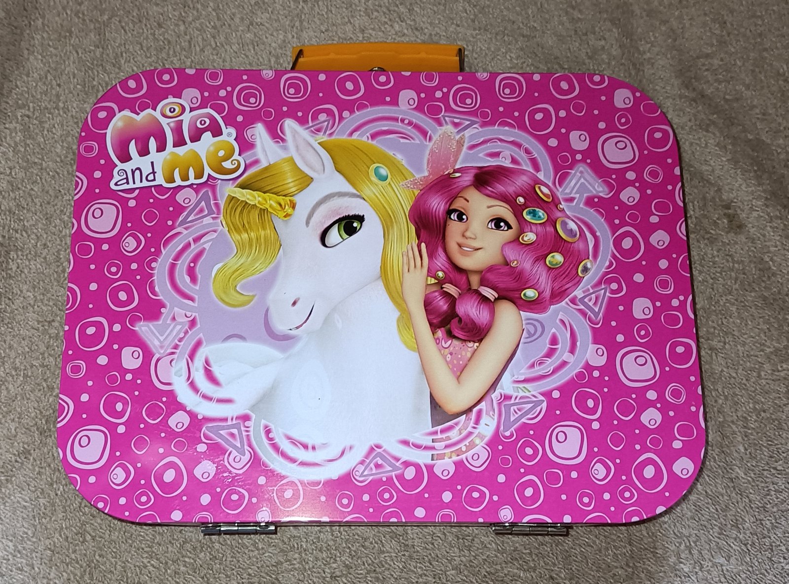 Kovový kufrík s motívom Mia a ja, 3 kompletné puzzle obrázky, 4. chýba (chýbali dieliky, tak sme vyhodili). Kufrík na jednej strane trochu preliačený.