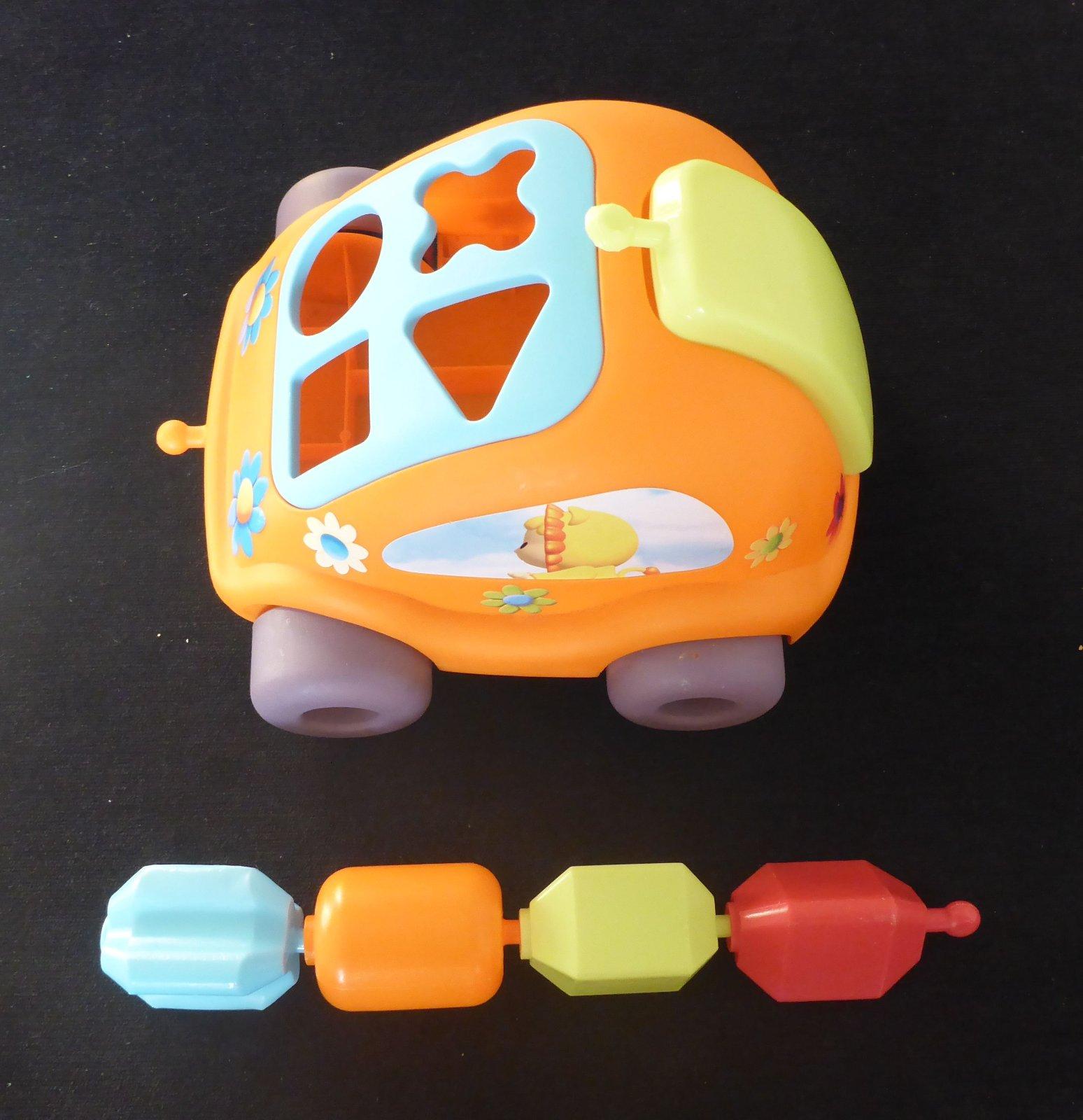 Predám vkladacie autíčko Cotoons SMOBY. Autíčko obsahuje 4 kocky, a to v 4 rôznych tvaroch a farbách. Dieťatko si može vybrať kocky z autíčka cez modré okienko autíčka, ktoré si otvorí alebo cez kufor autíčka po vybratí malého detského mobilného telefónu. Keď sa zavrie okienko, tak cez otvory rôznych tvarov vkladá kocku vhodného tvaru naspäť do autíčka. Kocky sa dajú navzájom ponapájať na seba (na koncoch majú guľaté háčiky, ktoré zapadnú do dierky v ďalšej kocke) a tak z nich vytvoriť reťaz. Autíčko má veselé farebné prevedenie, nálepky hrdinov Cotoons a kvetiniek. Autíčko pre deti je vhodná hračka na trénovanie jemnej motoriky a rozvíjanie logiky a predstavivosti u najmenších detí. Hračka je vo výbornom stave bez poškodenia.