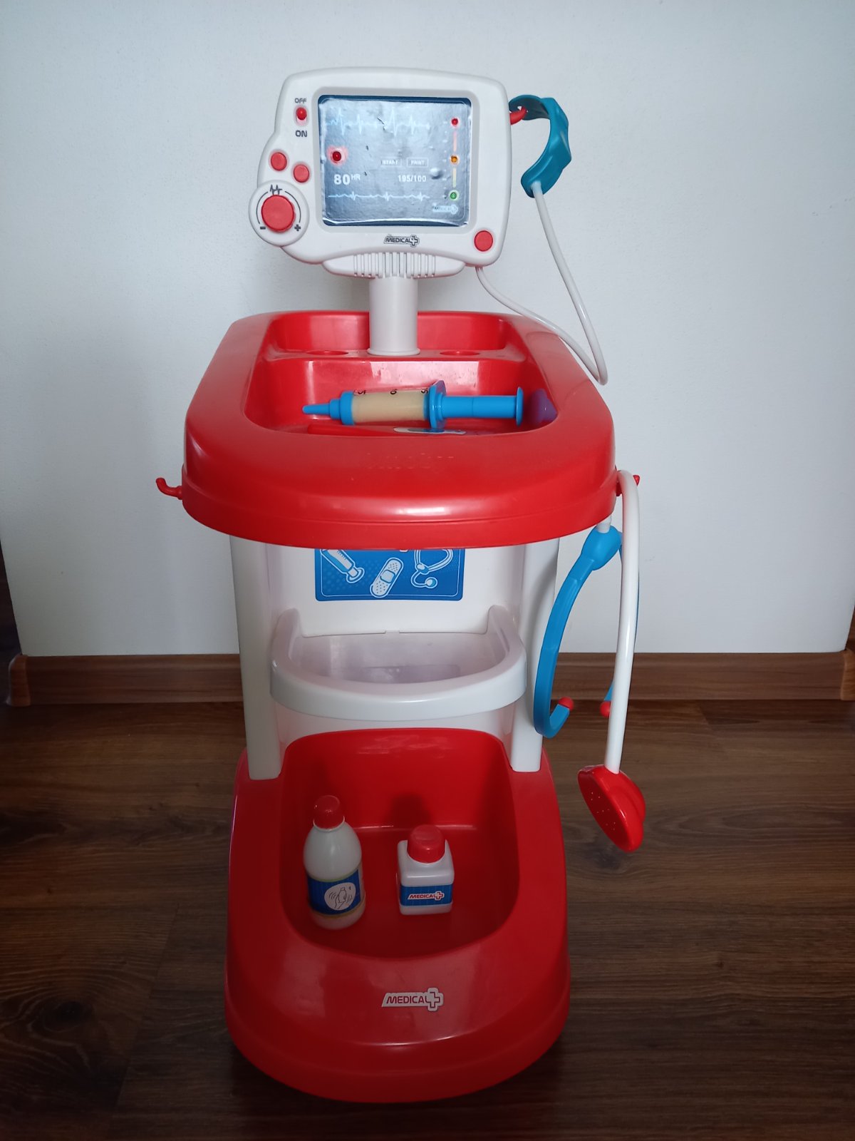 Detský lekársky vozík s tlakomerom stojí na kolieskach, vydáva zvukové a svetelné efekty.