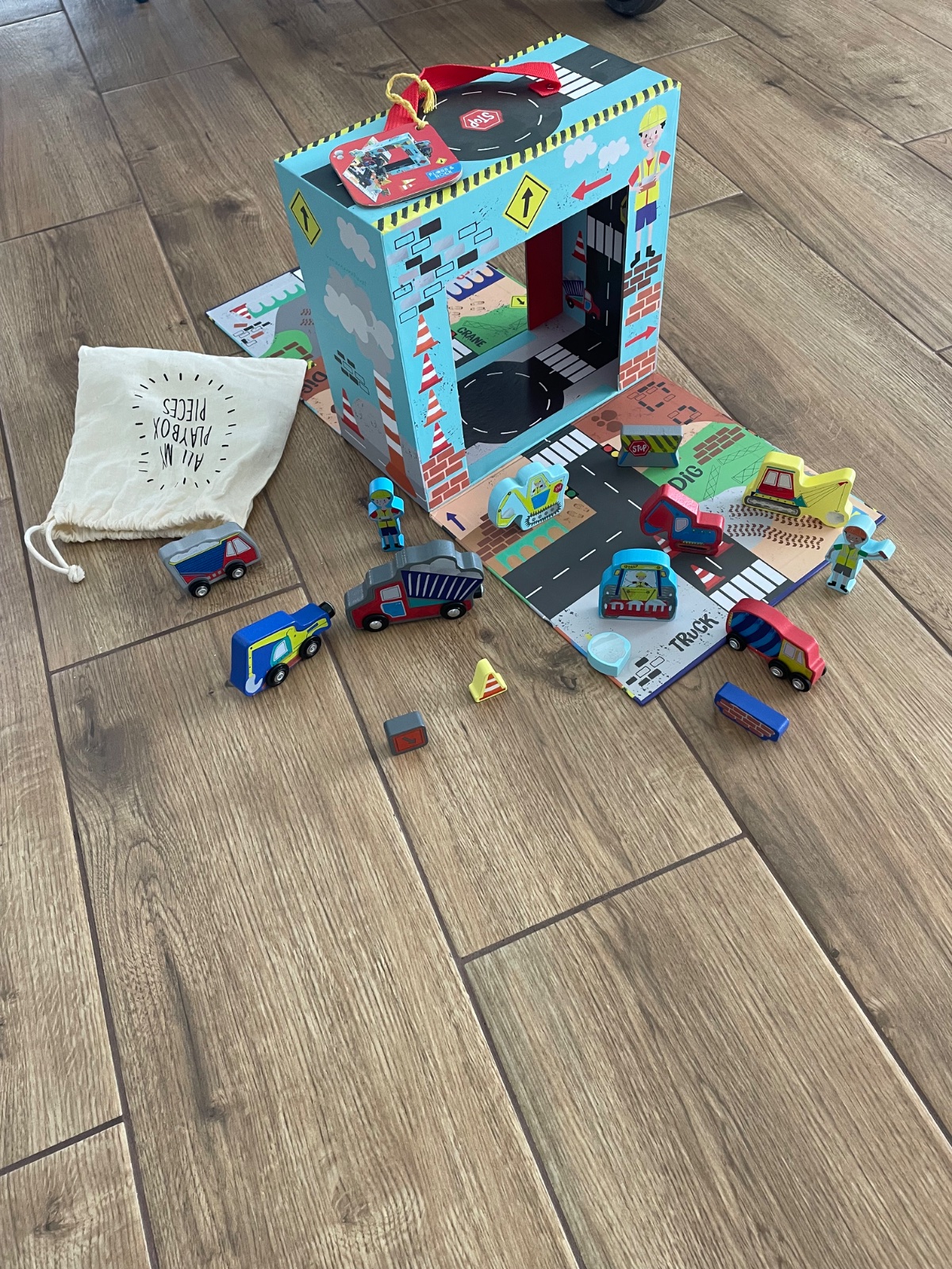 Predám prenosný kufrík, ktorý sa po otvorení mení na stavenisko s drevenými bagrami, nákladnými autami, postavami a ďalšími doplnkami. Vhodné pre deti od 3 rokov.