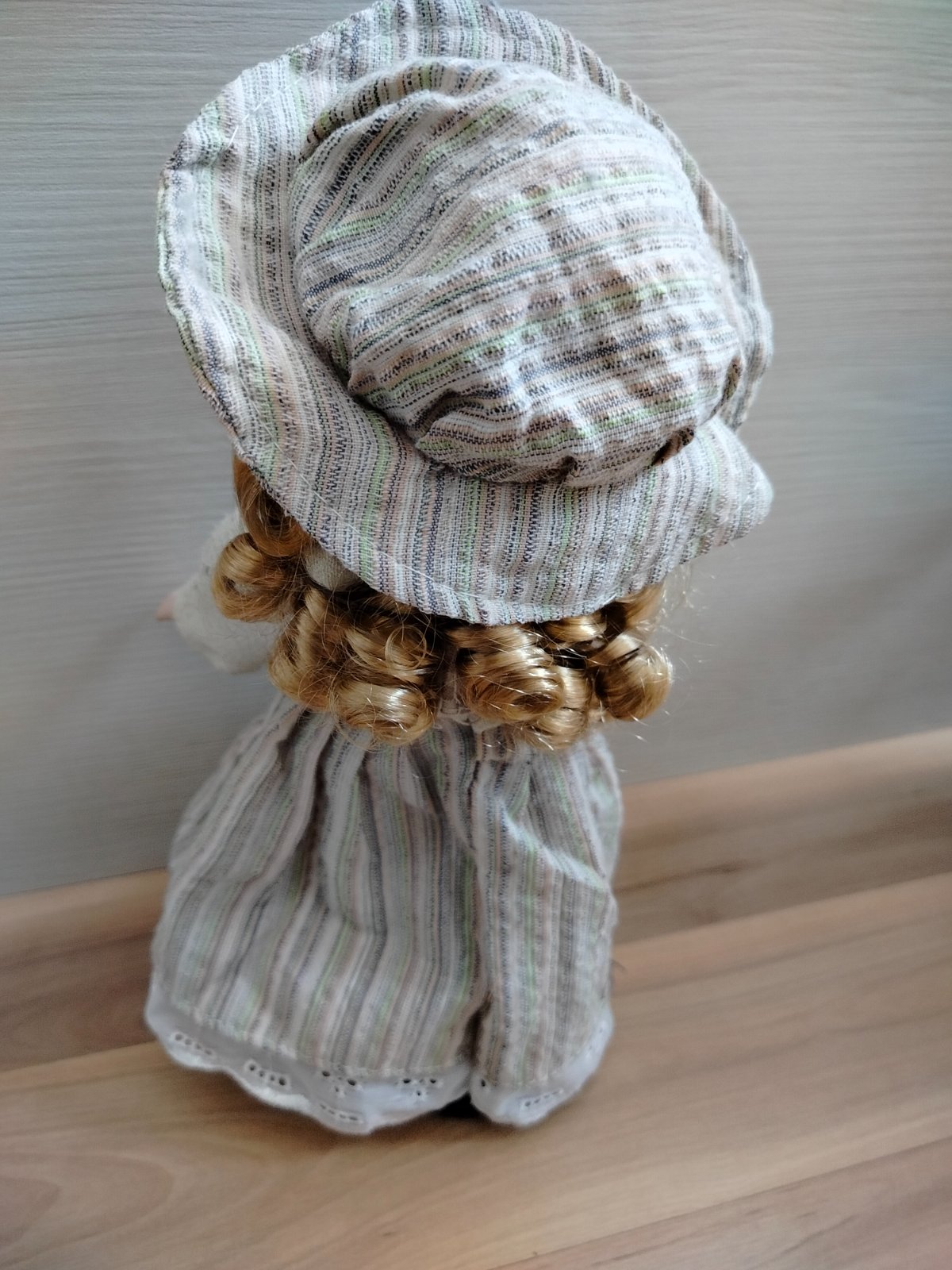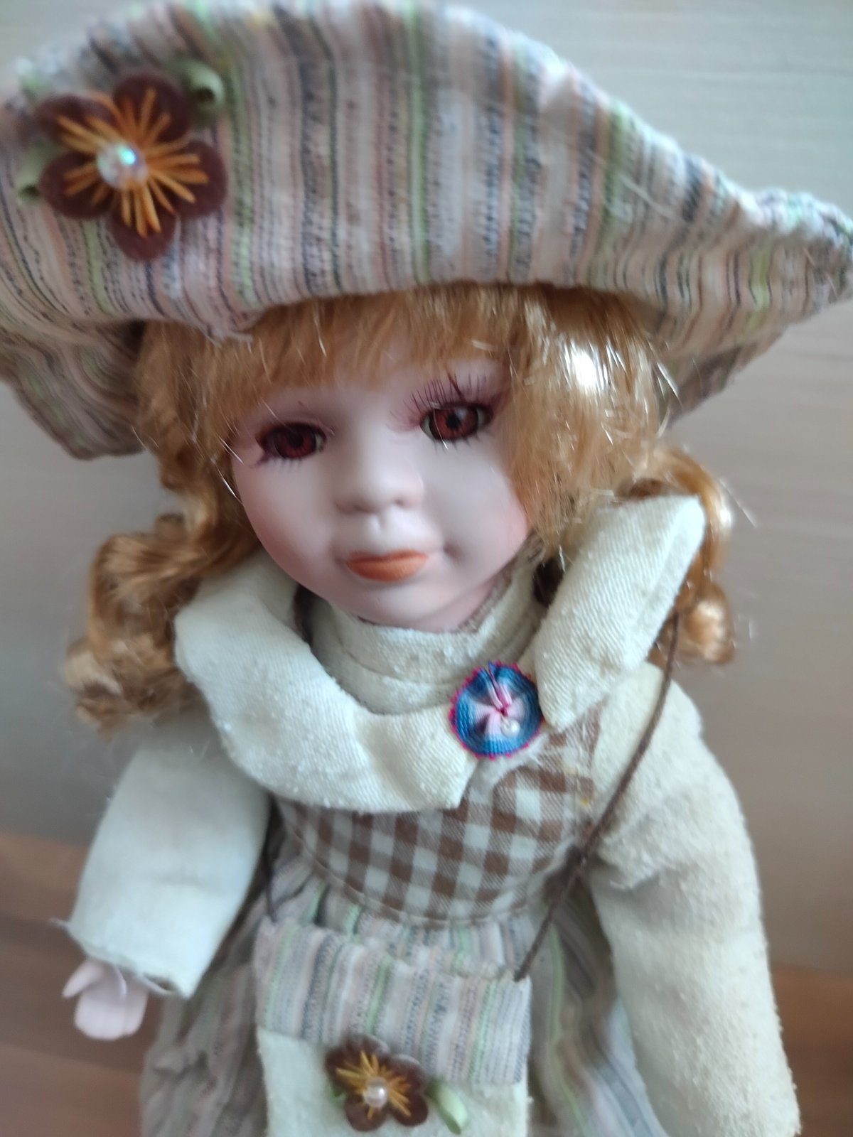 Predám krasnú porcelánovú bábiku v dobrom stave. Krásna dekoratívna porcelánová bábika s blond kučeravými vlasmi, veľkým klobúkom ozdobeným kvetmi a detailným látkovým oblečením v károvanom štýle (šaty, zásterka, golier). Hlava, ruky a nohy sú z porcelánu, telo z textilu. Súčasťou je stojan, na ktorom bábika pekne stojí. Výška je približne 30 cm. Zachovalý stav, bez poškodenia, ideálna ako dekorácia alebo pre zberateľov