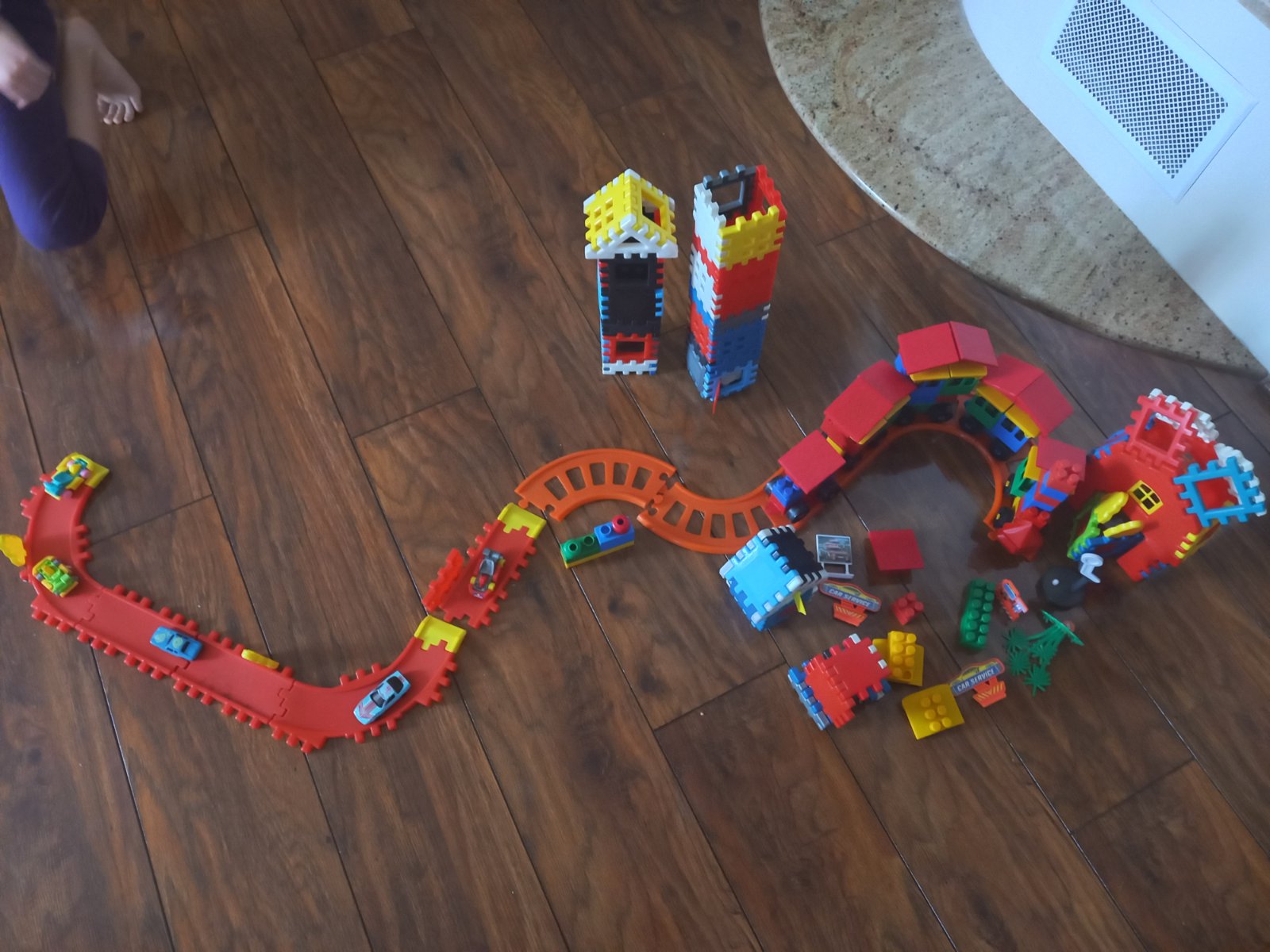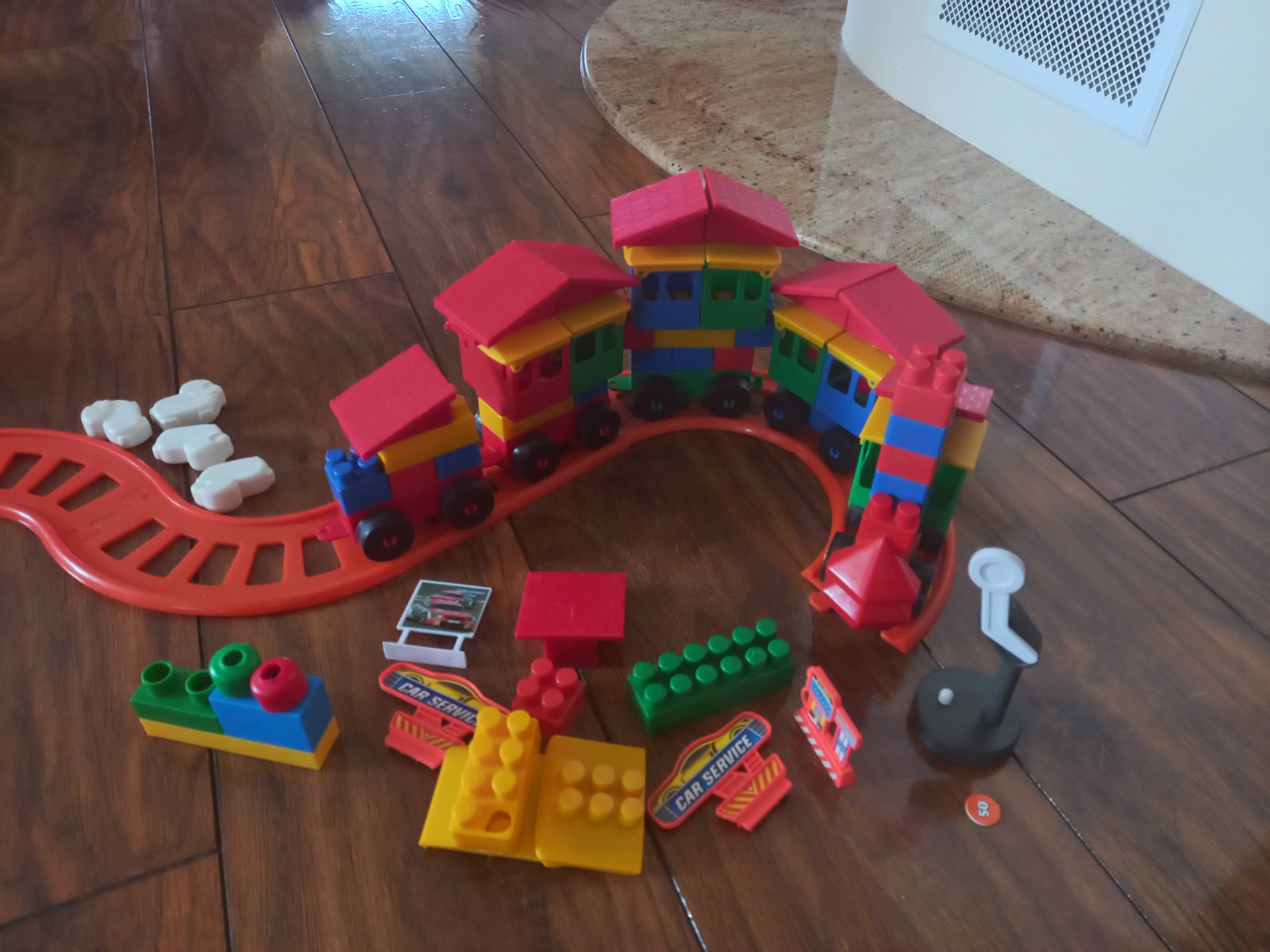 Dá sa z nich postaviť autodráha , farmársky dom, alebo rôzne domčeky. Pridávam autíčka. Obsahuje aj ovečky, stromčeky, vlajku , palmu . Sada má viac ako 100 dielov. Jednému z autíčok zo súpravy chýba zadné koliesko. V druhej súprave sa dajú poskladať rôzne variácie vláčikov. Obidve sady boli hrané.